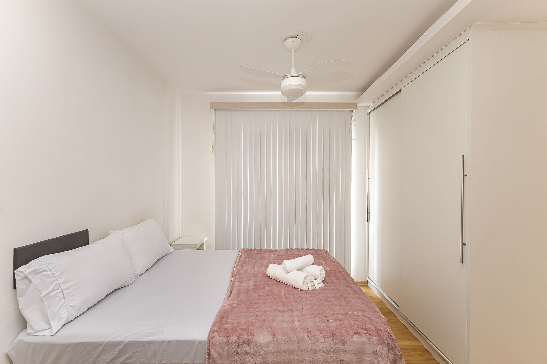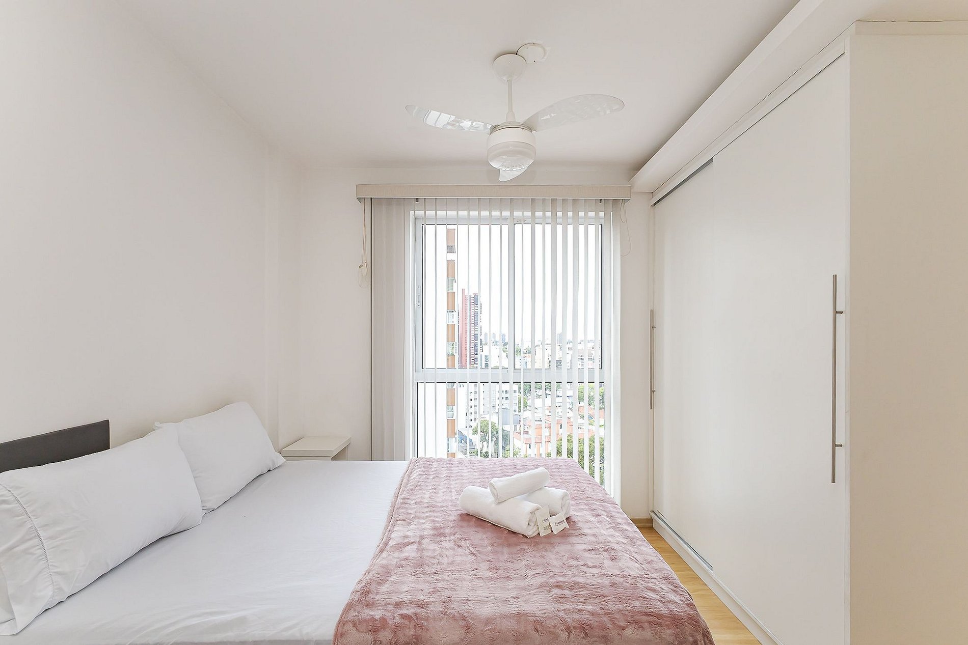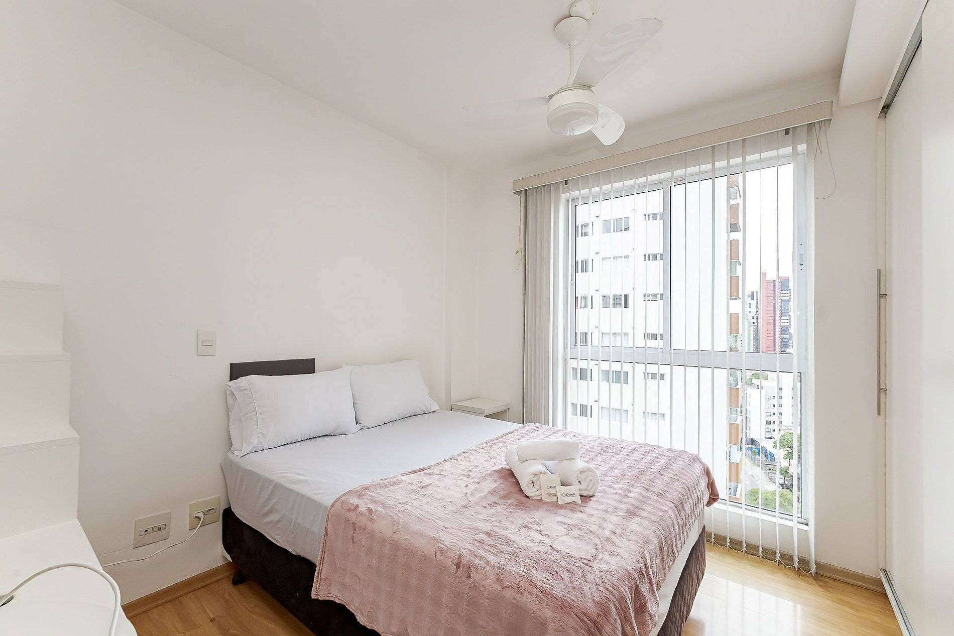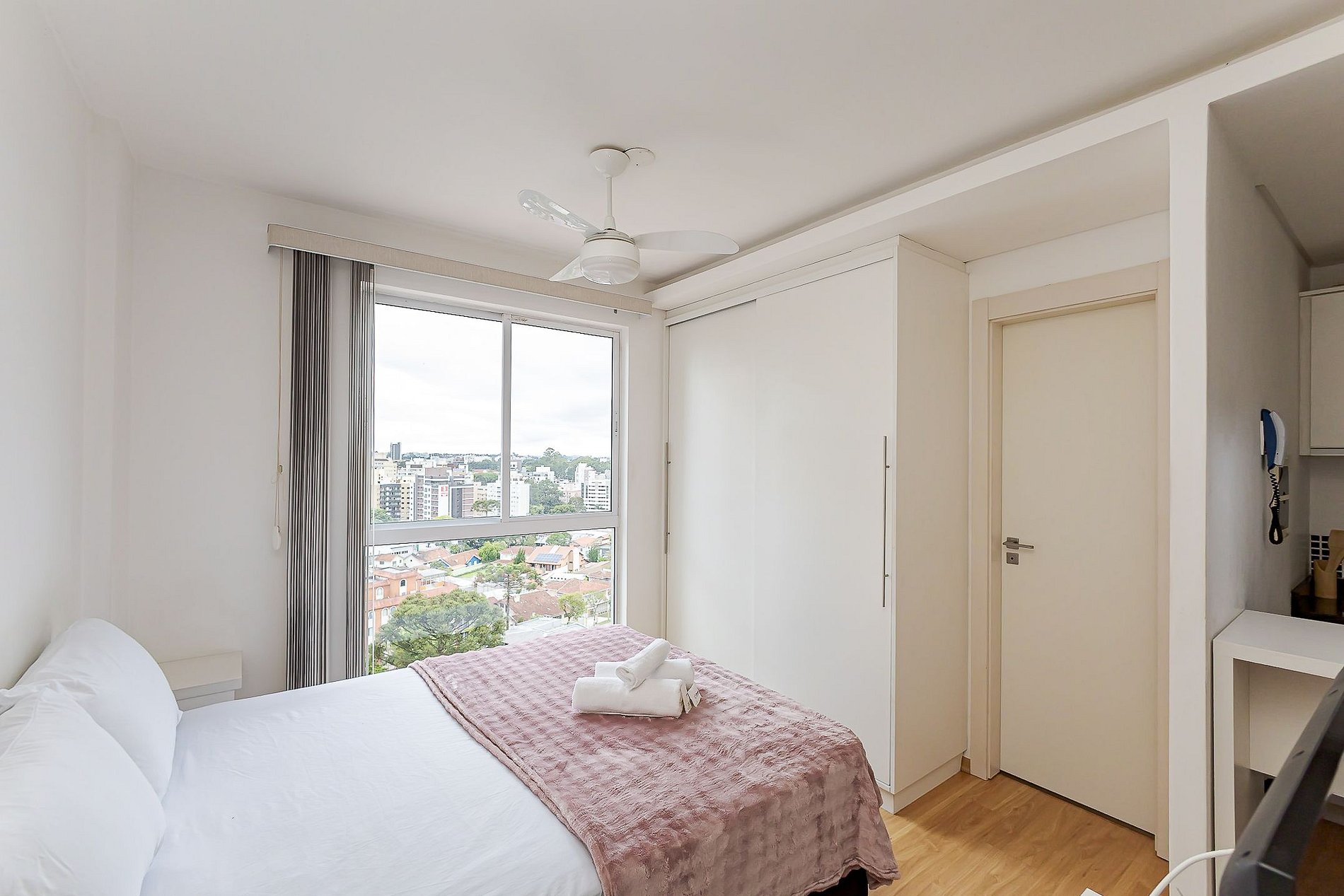 • Ambiente integrado: cama de casal com mesa de apoio, armário, ventilador de teto, persiana blackout e móvel divisório que separa visualmente a área da cama do sofá, mantendo organização e conforto.