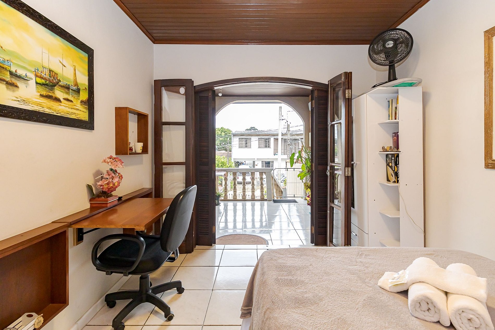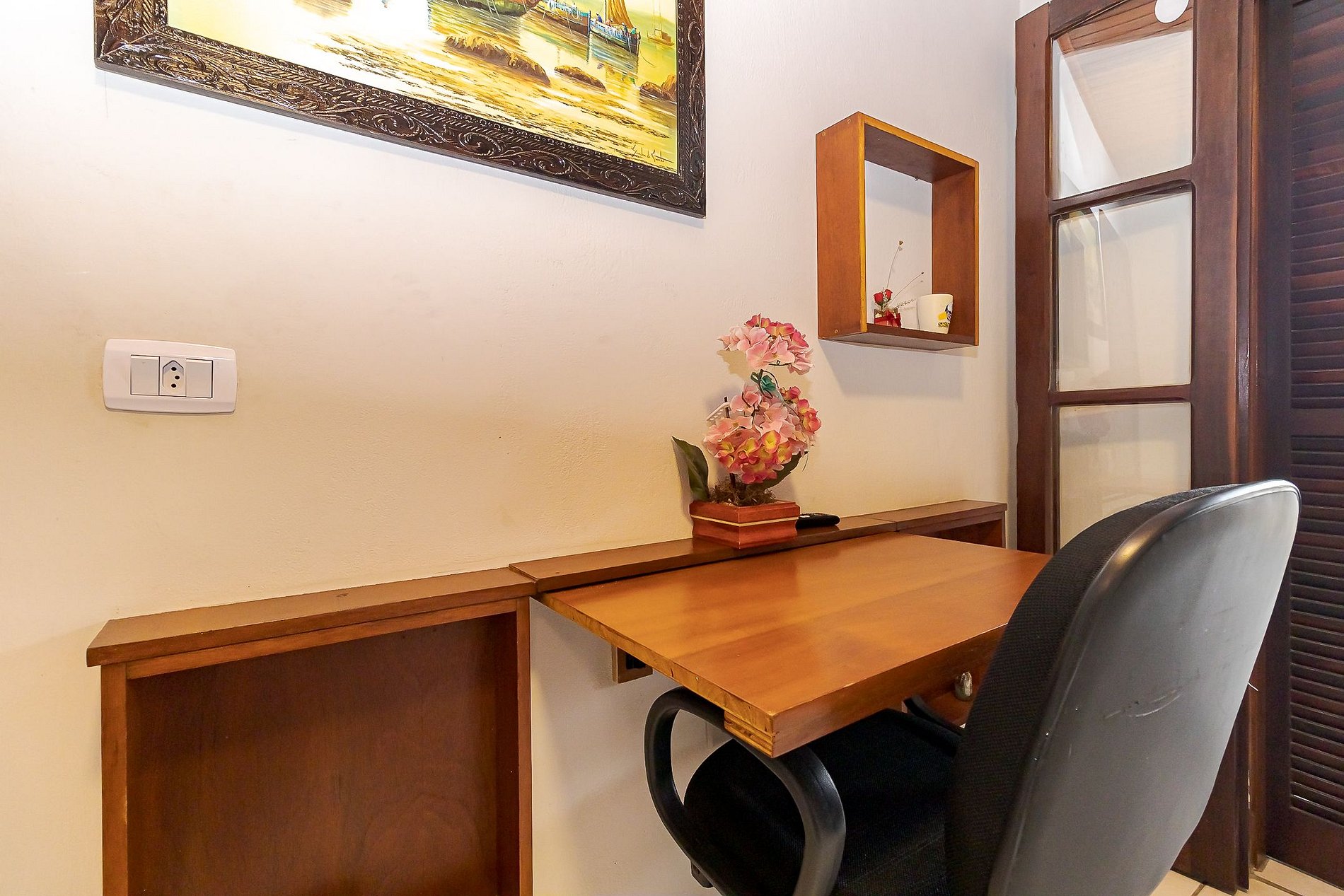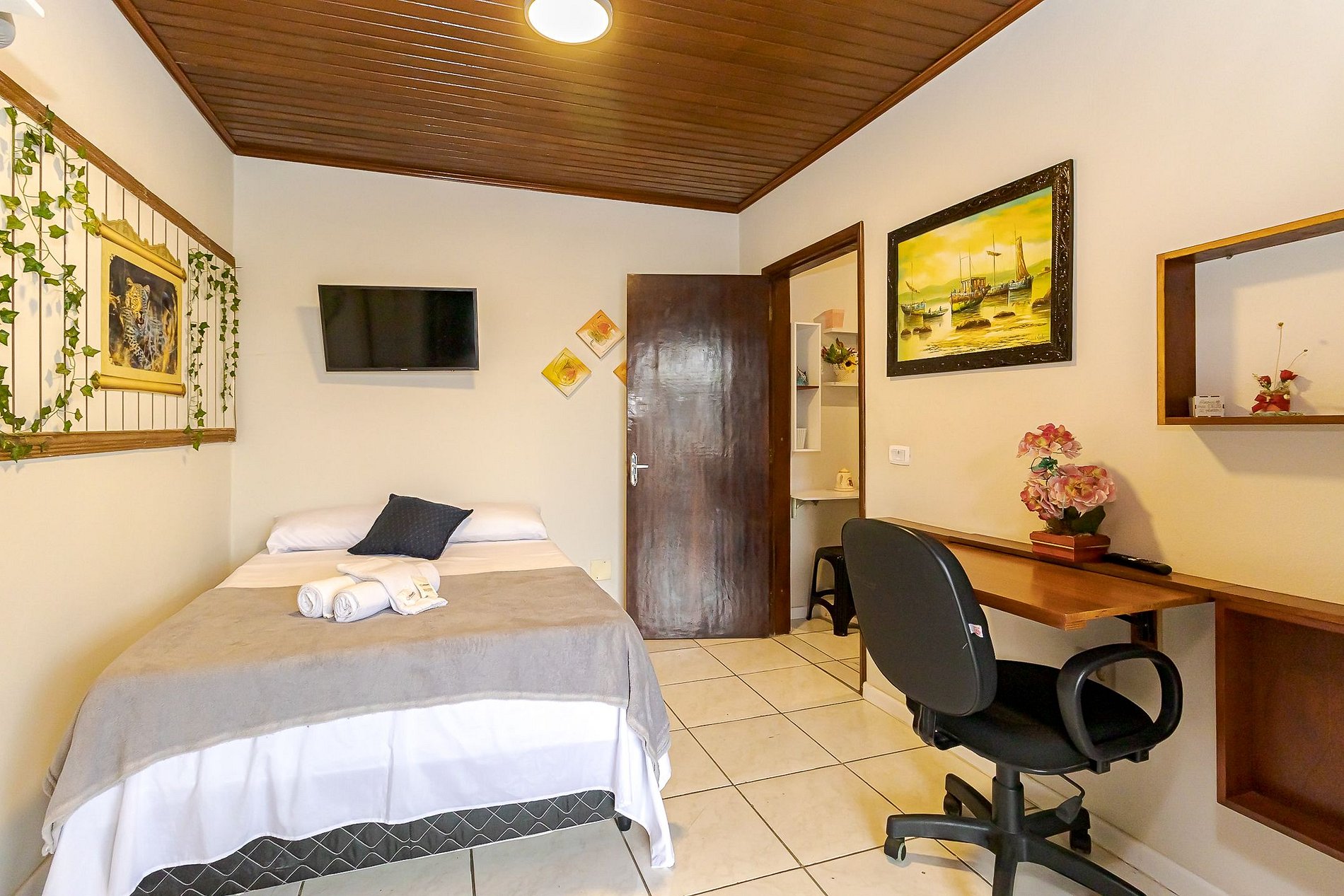 • Ambiente integrado: cama de casal, TV, mesa com cadeira ideal para trabalho ou refeições rápidas, armário com gavetas e ventilador portátil.