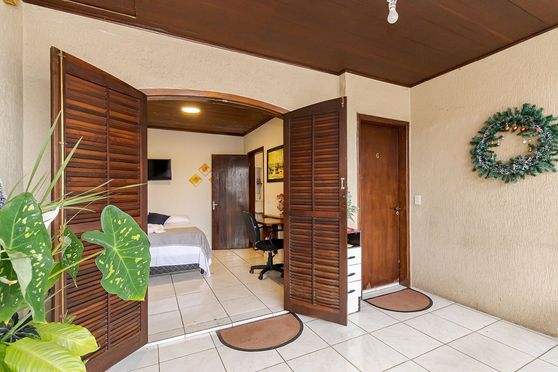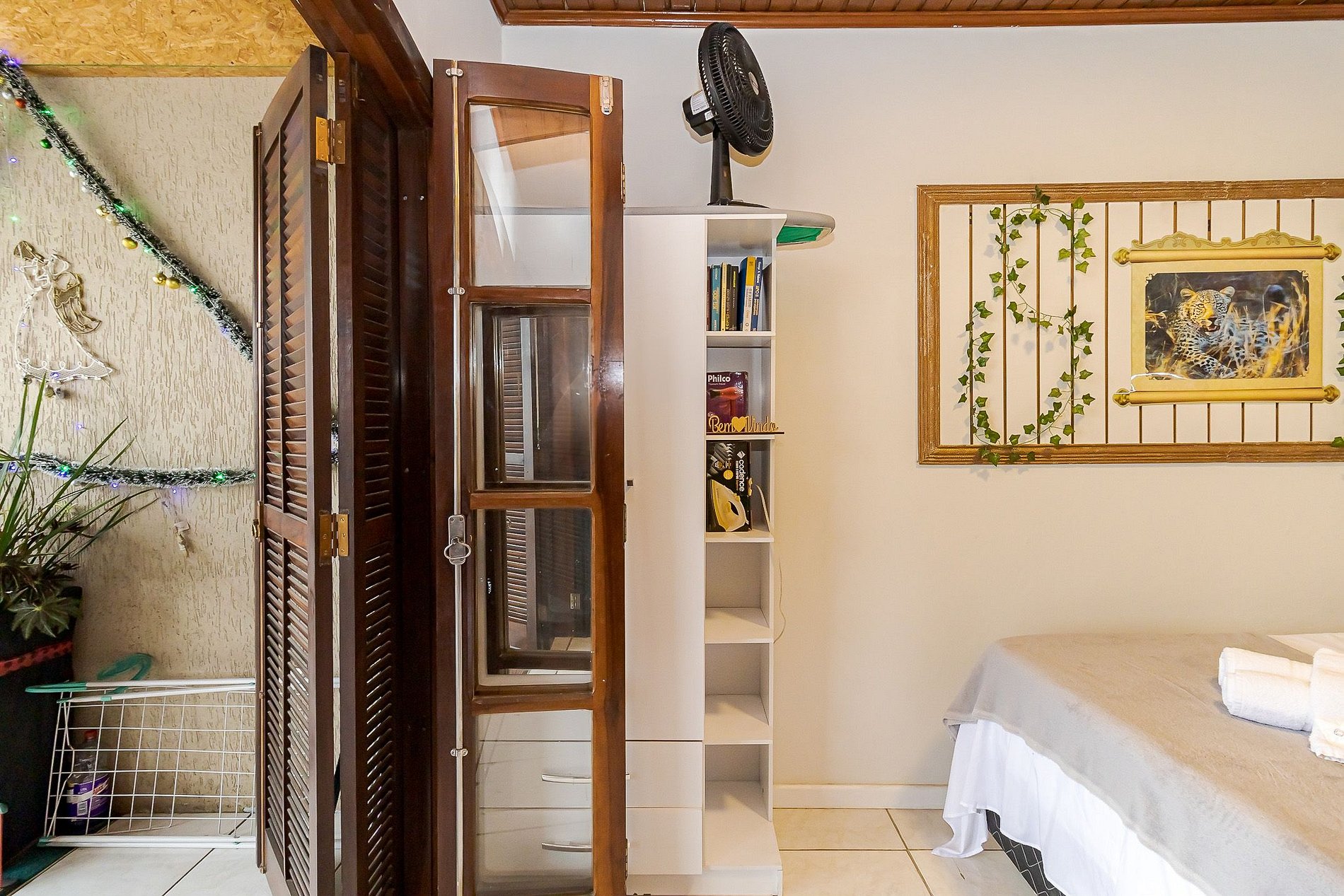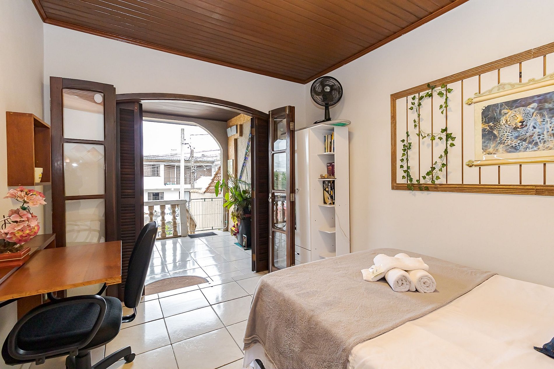 • Ambiente integrado: cama de casal, TV, mesa com cadeira ideal para trabalho ou refeições rápidas, armário com gavetas e ventilador portátil.
