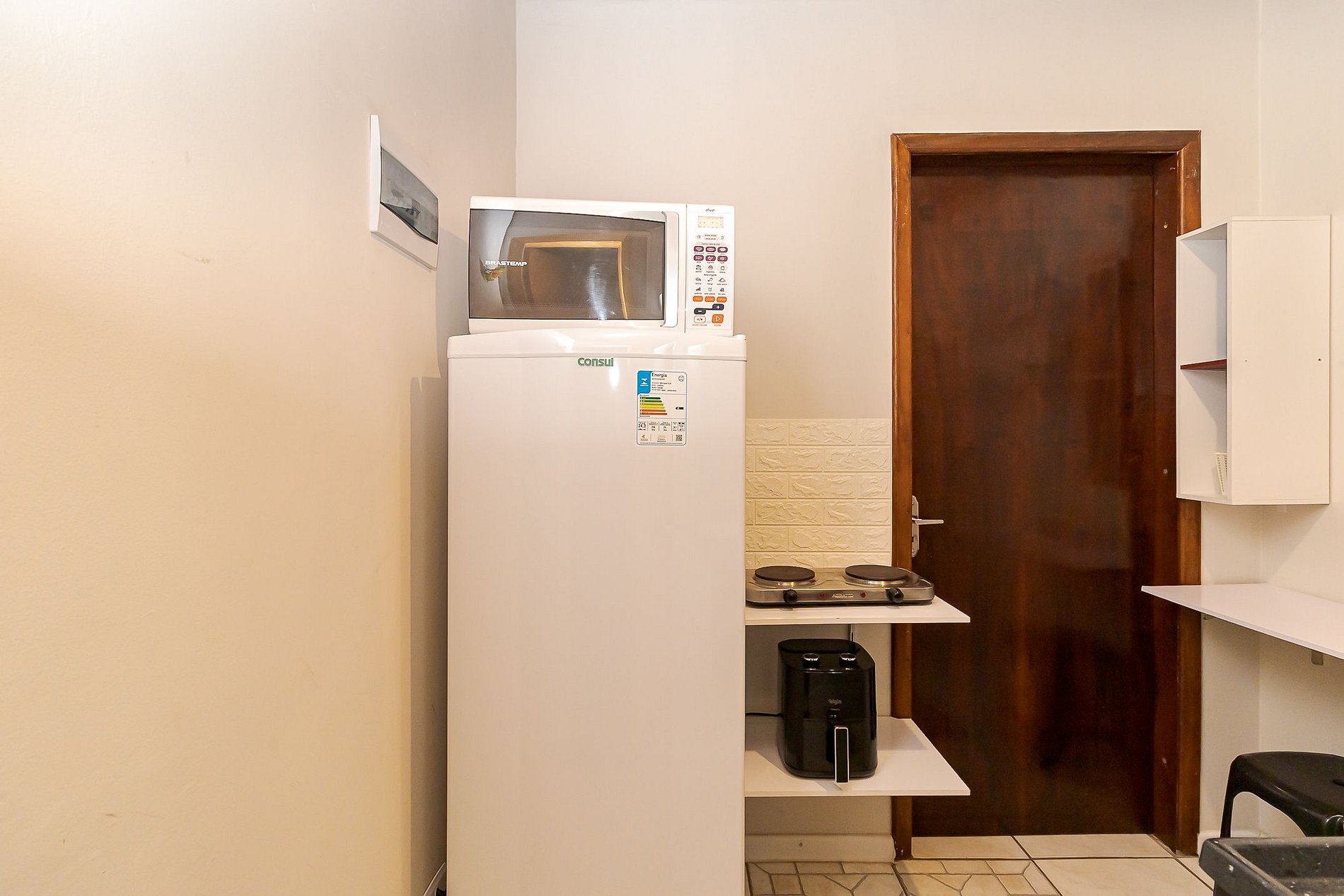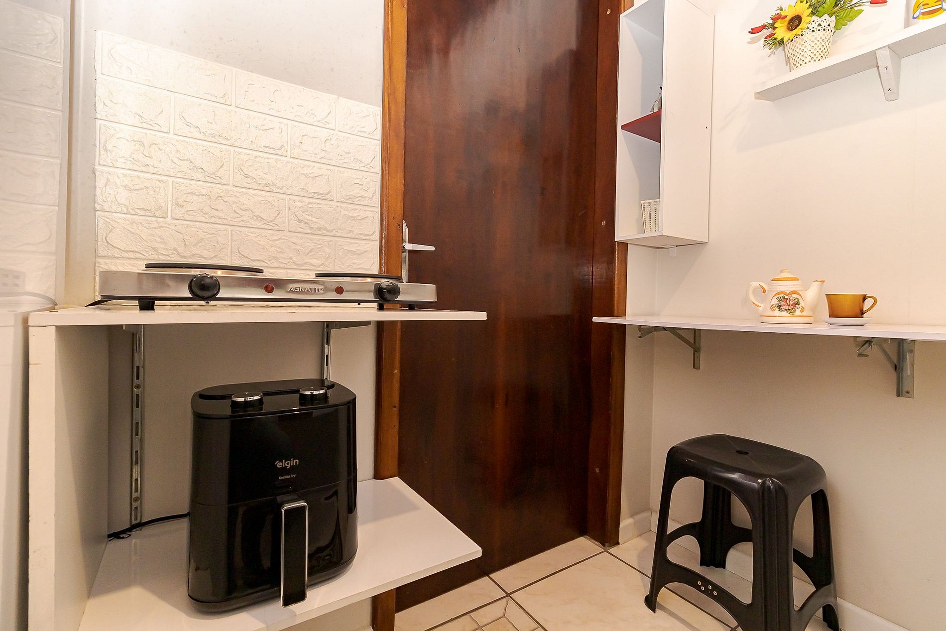 • Cozinha compacta: equipada com cooktop, geladeira, micro-ondas, chaleira elétrica, airfryer, panelas, pratos, copos, talheres e utensílios básicos.
