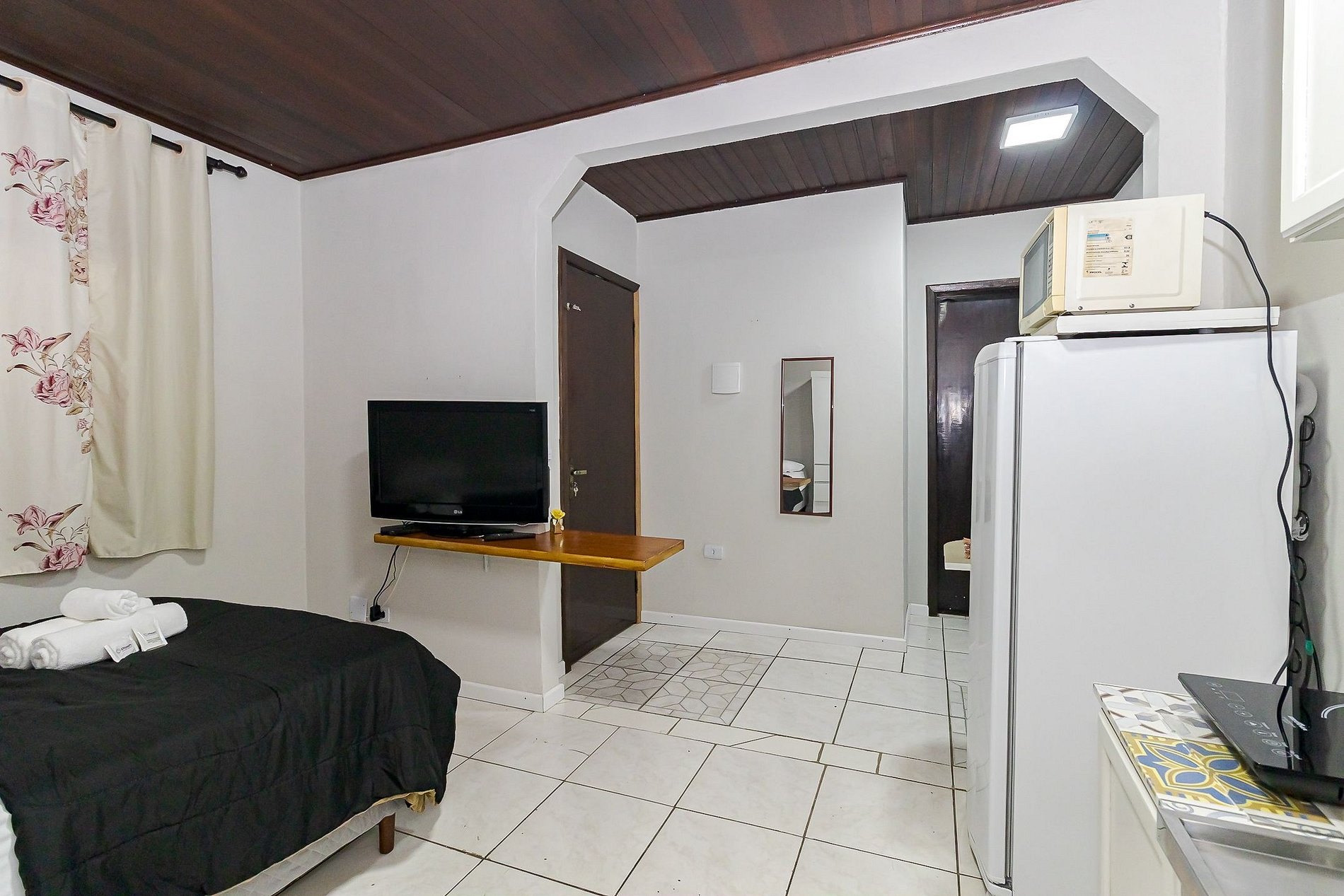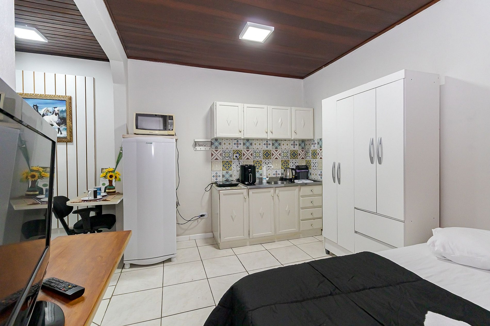 Com ambiente integrado de quarto, cozinha equipada e banheiro separado, o espaço acomoda com conforto até 2 hóspedes.