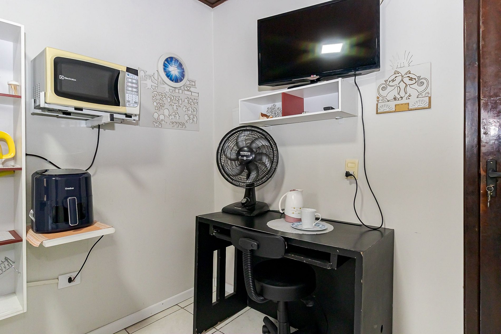 • Ambiente integrado: cama de casal, TV, mesa com cadeira ideal para trabalho ou refeições rápidas, armário com gavetas e ventilador portátil.