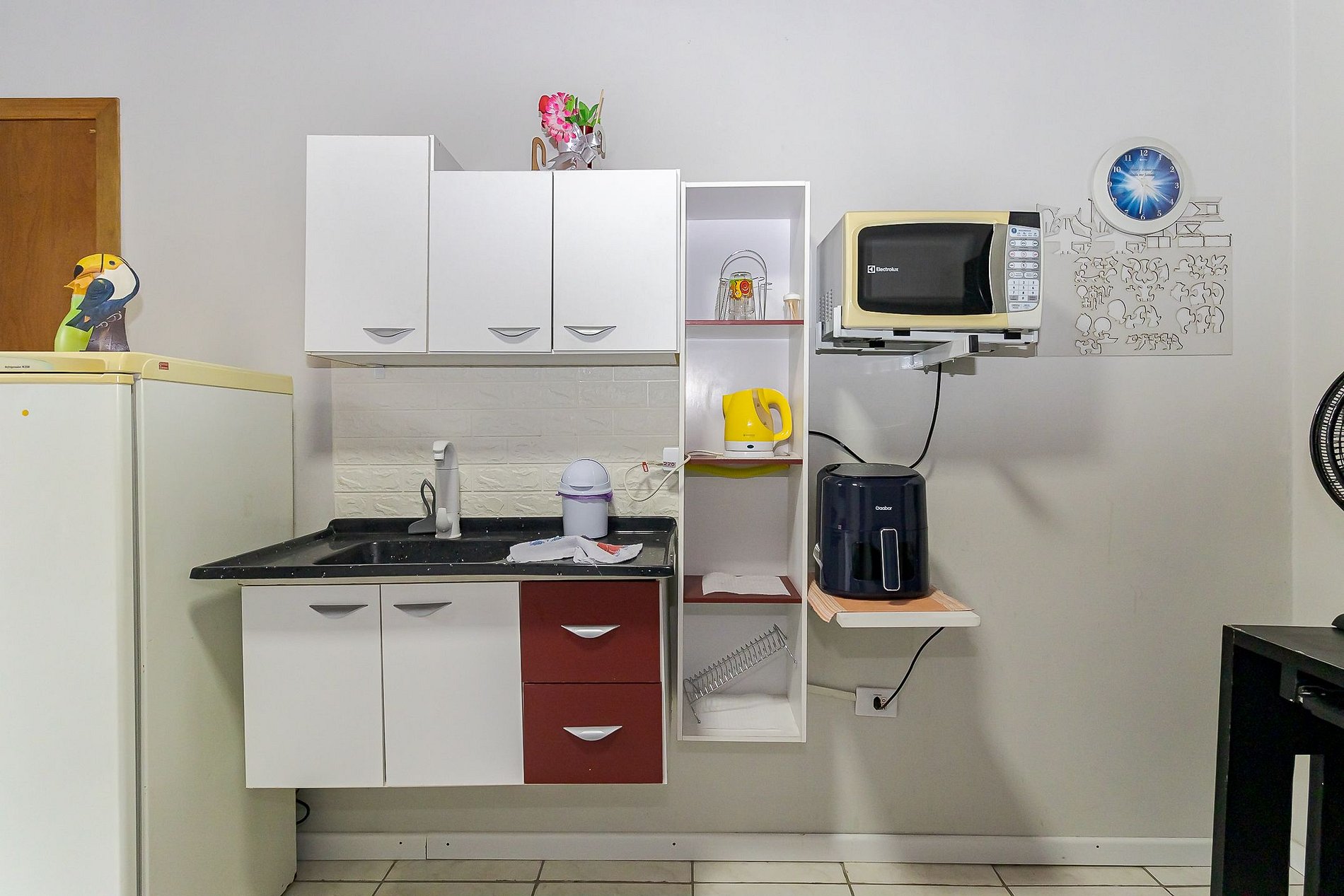 • Cozinha compacta: equipada com cooktop, geladeira, micro-ondas, chaleira elétrica, airfryer, panelas, pratos, copos, talheres e utensílios básicos.