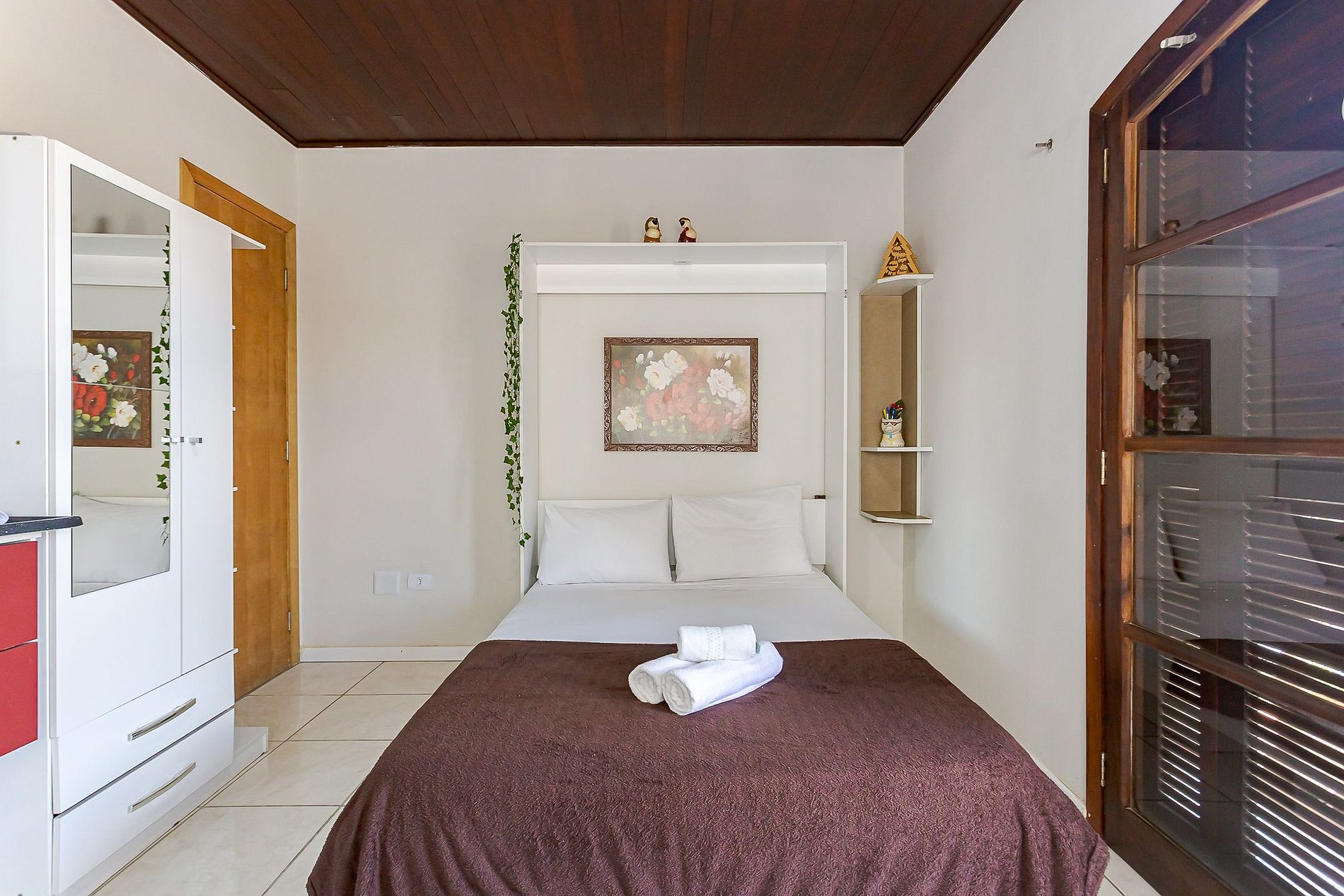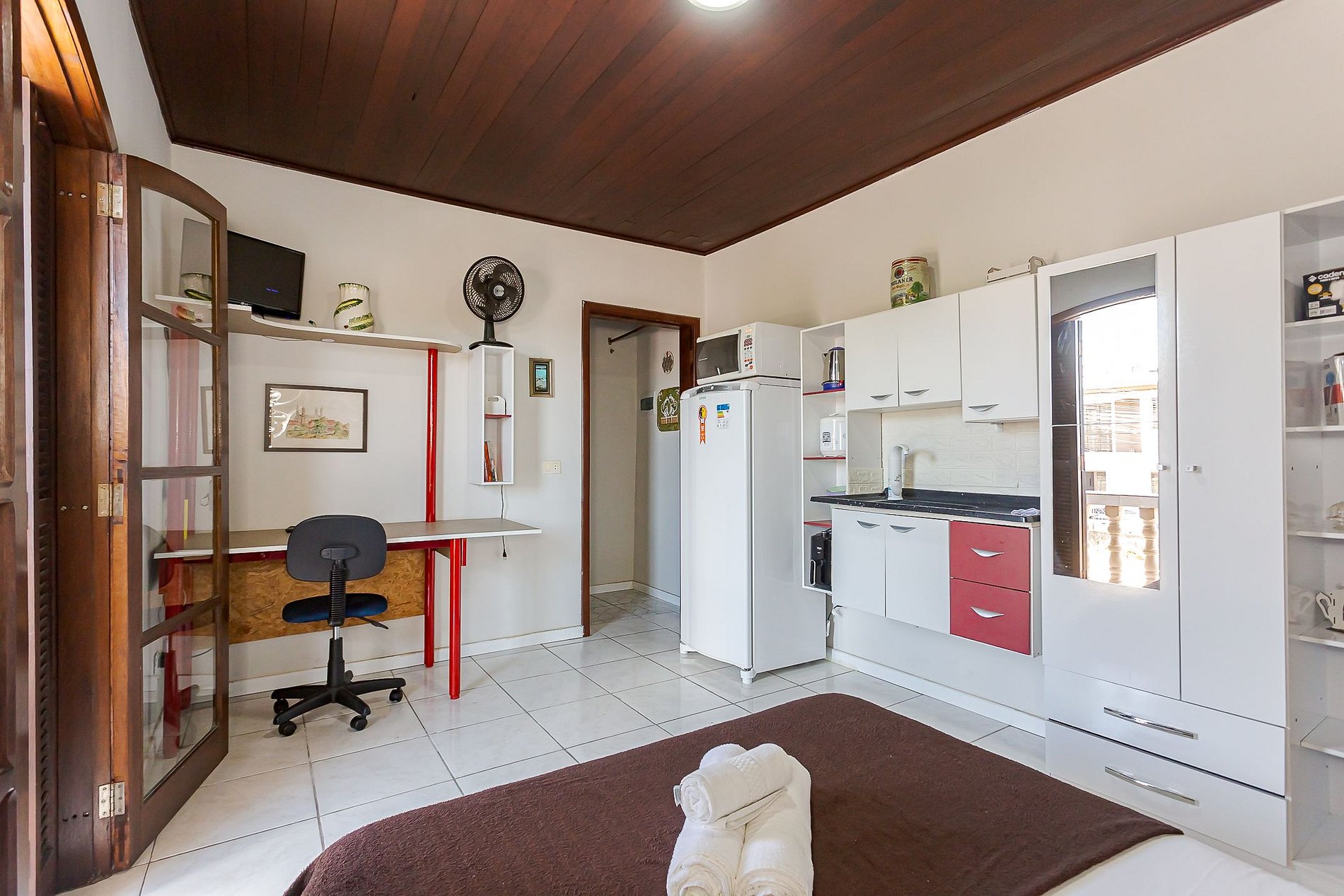 Com ambiente integrado de quarto, cozinha equipada e banheiro separado, o espaço acomoda com conforto até 2 hóspedes.