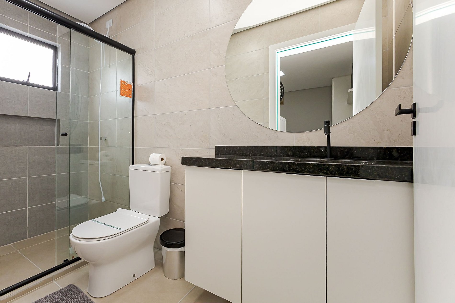 O banheiro é privativo, com box em vidro e chuveiro elétrico.