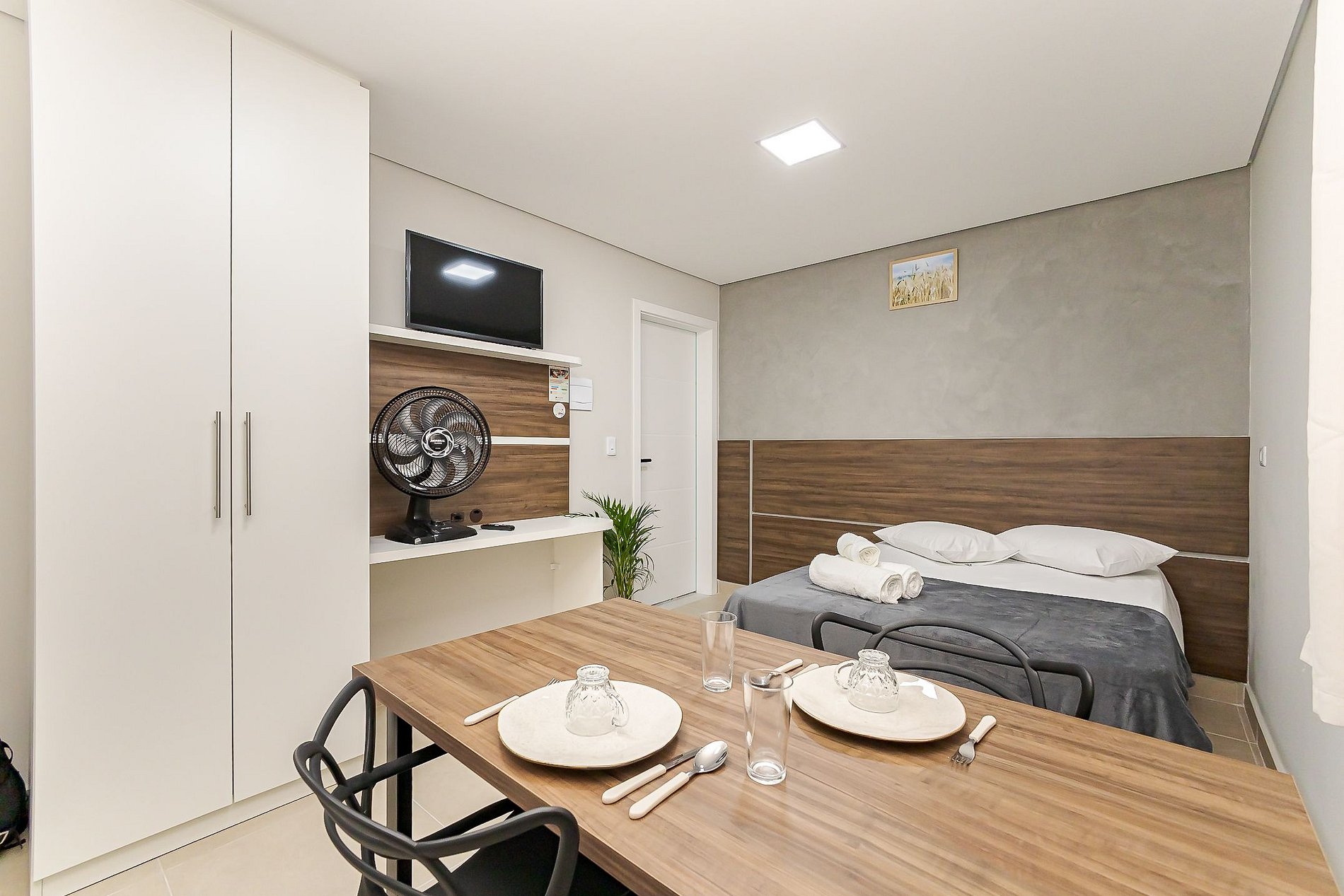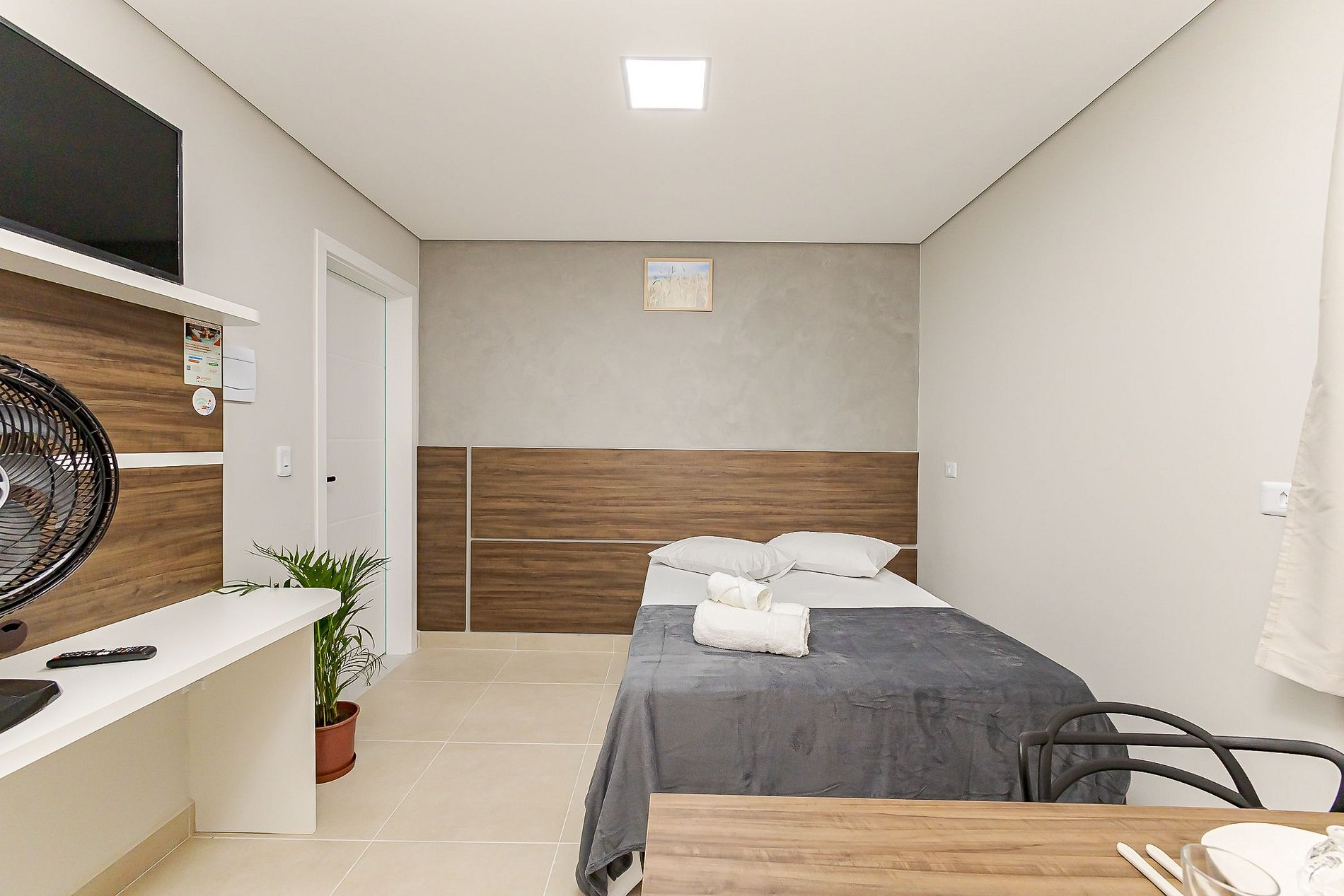 Conta com cama de casal confortável, enxoval completo, mesa para refeições ou trabalho, armários planejados e Smart TV com acesso a YouTube e Netflix.