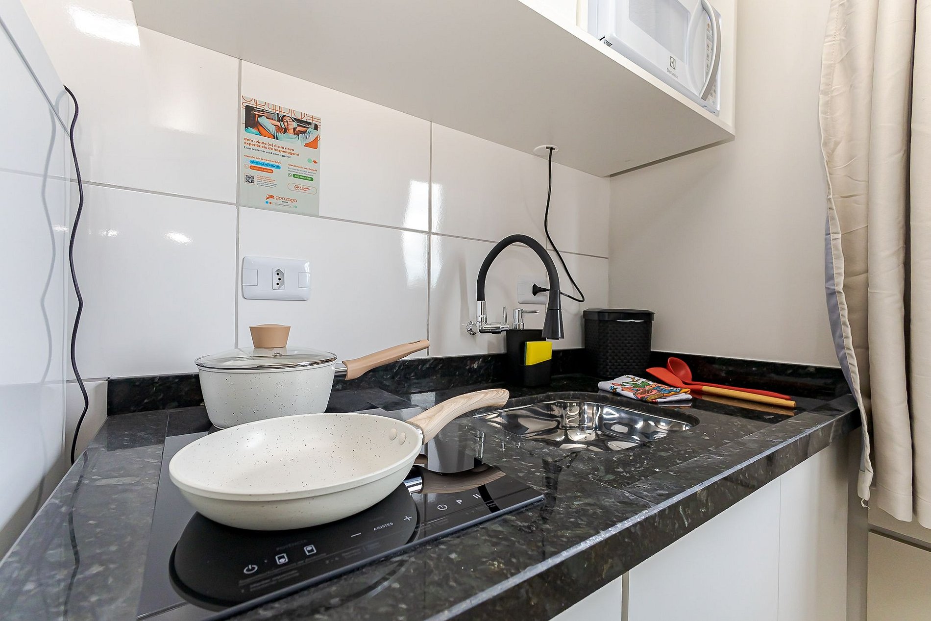 A cozinha é compacta e funcional, equipada com geladeira, micro-ondas, pia, armários, bancada em granito e utensílios básicos.
