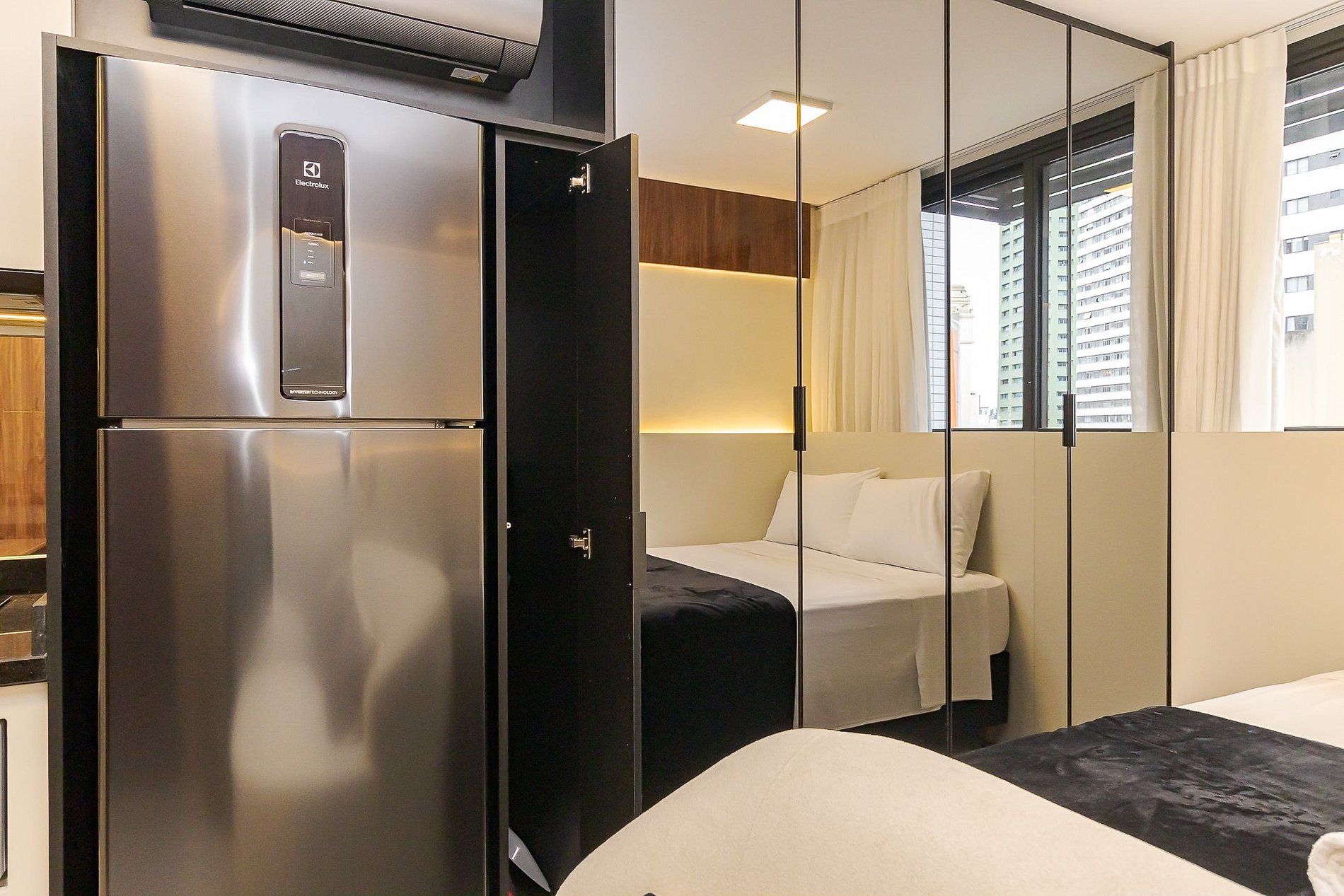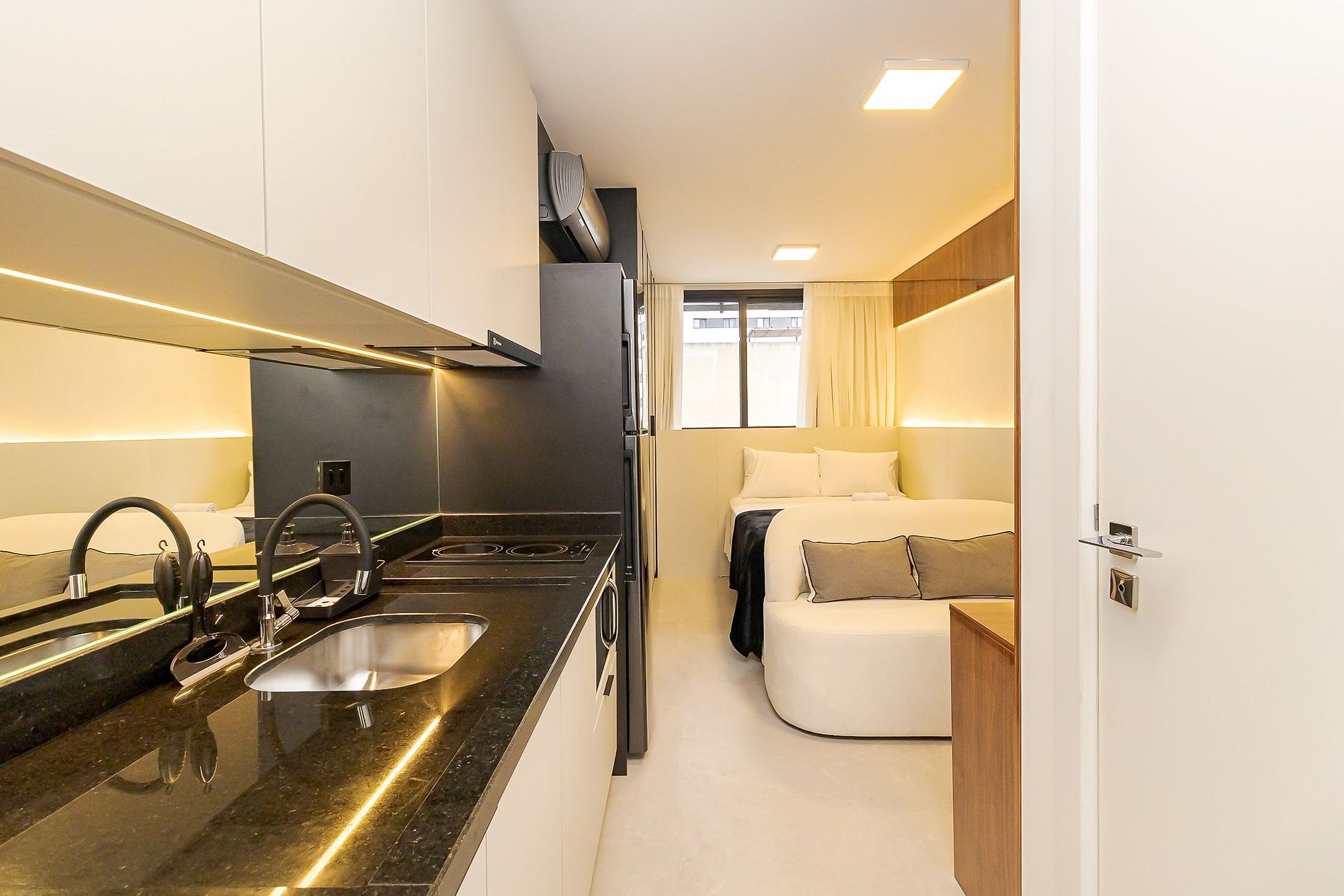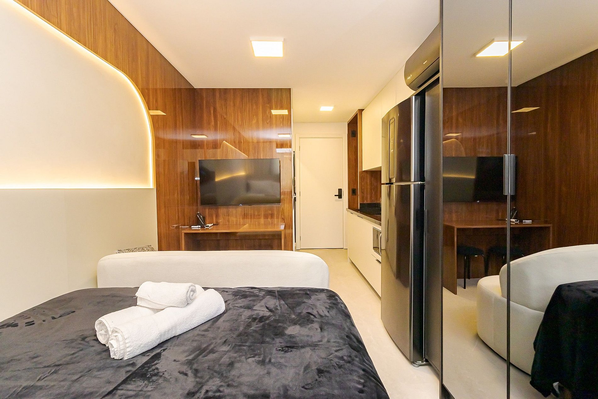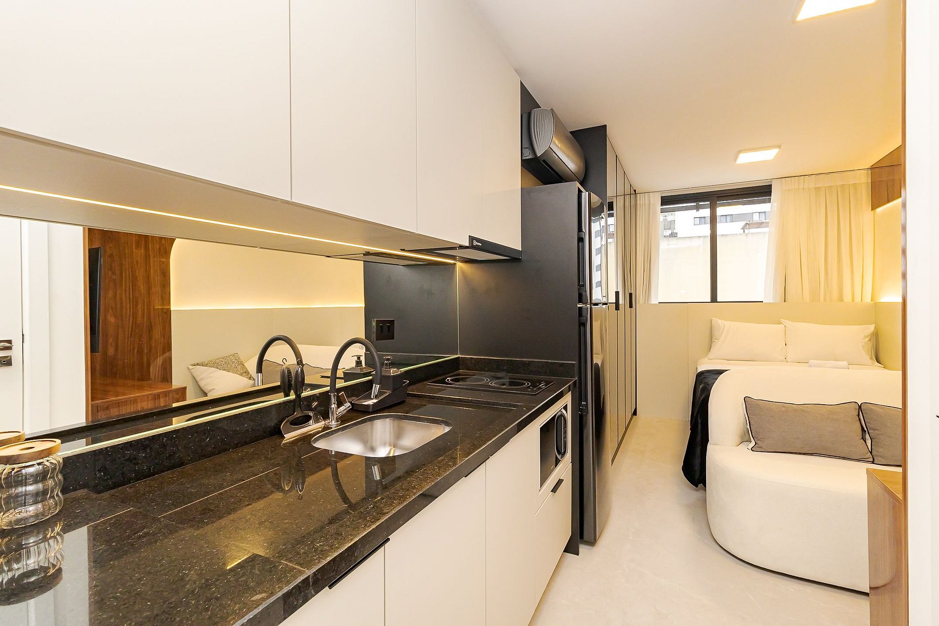Ambiente integrado com cama de casal, ar-condicionado, Smart TV, armários espelhados e cozinha equipada com cooktop, micro-ondas , geladeira e utensílios básicos para sua estadia . Ideal para lazer ou trabalho.
