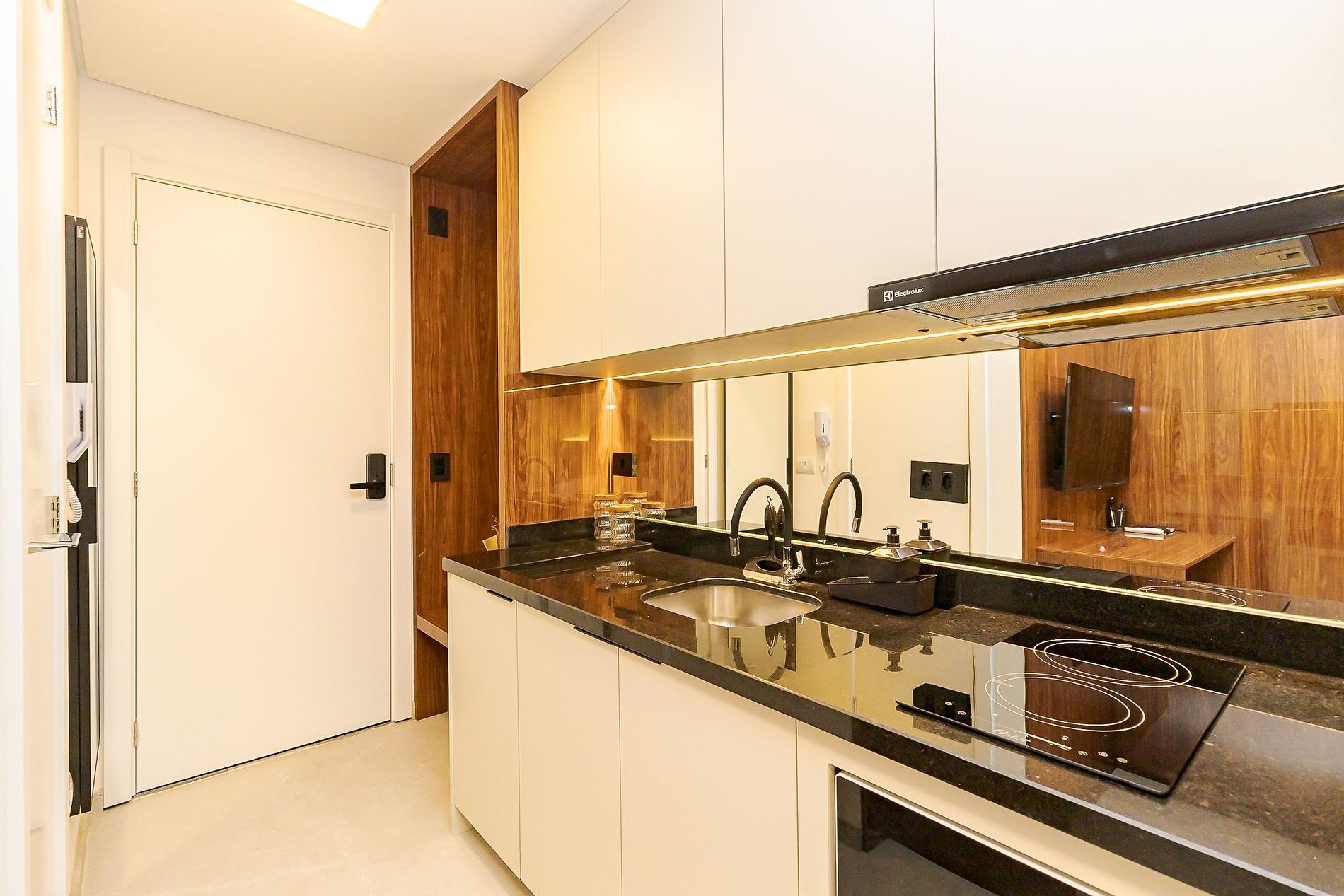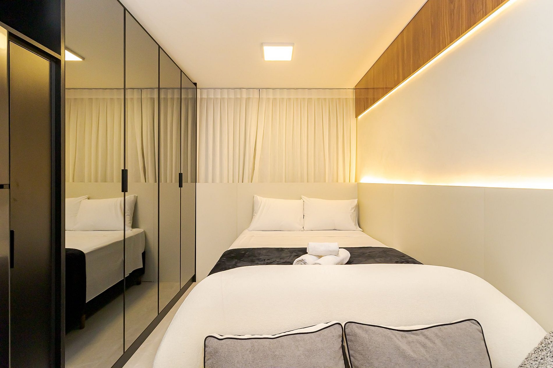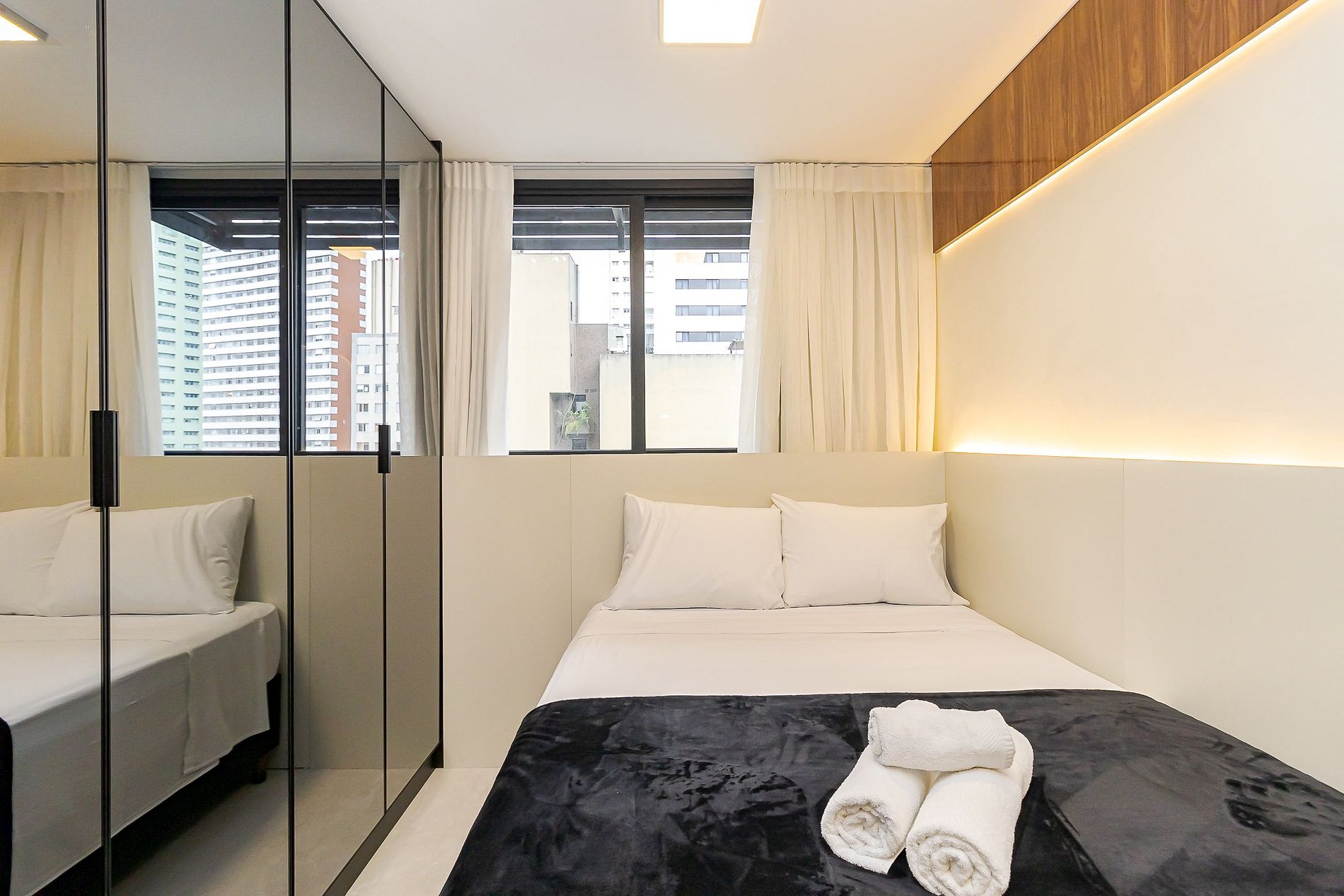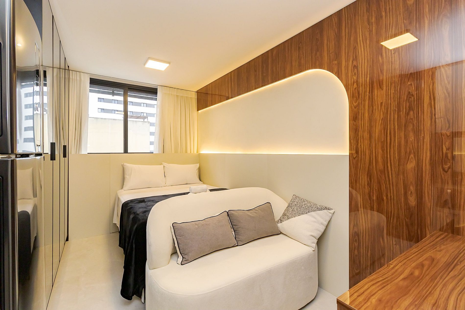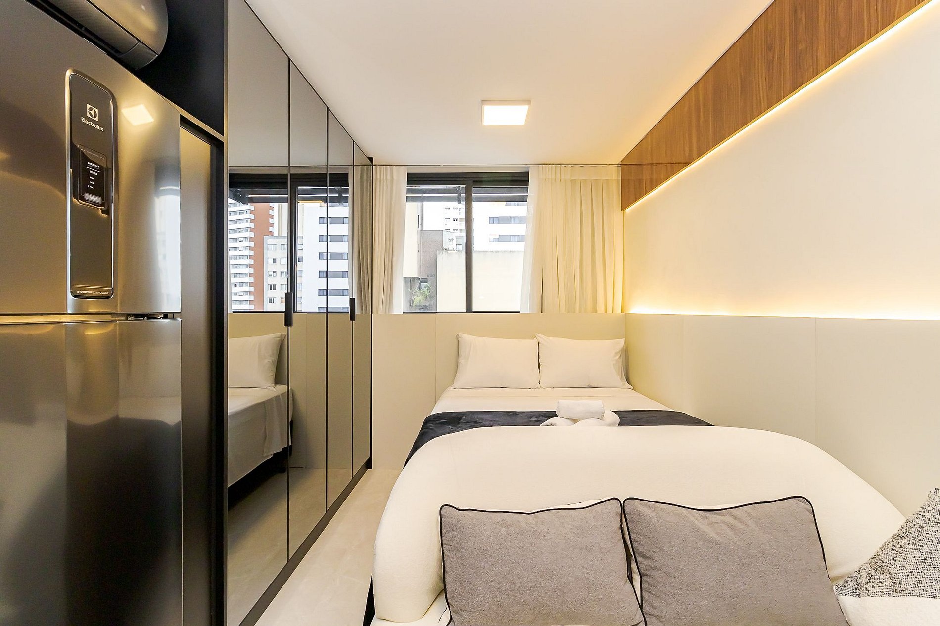 Ambiente integrado com cama de casal, ar-condicionado, Smart TV, armários espelhados e cozinha equipada com cooktop, micro-ondas , geladeira e utensílios básicos para sua estadia . Ideal para lazer ou trabalho.