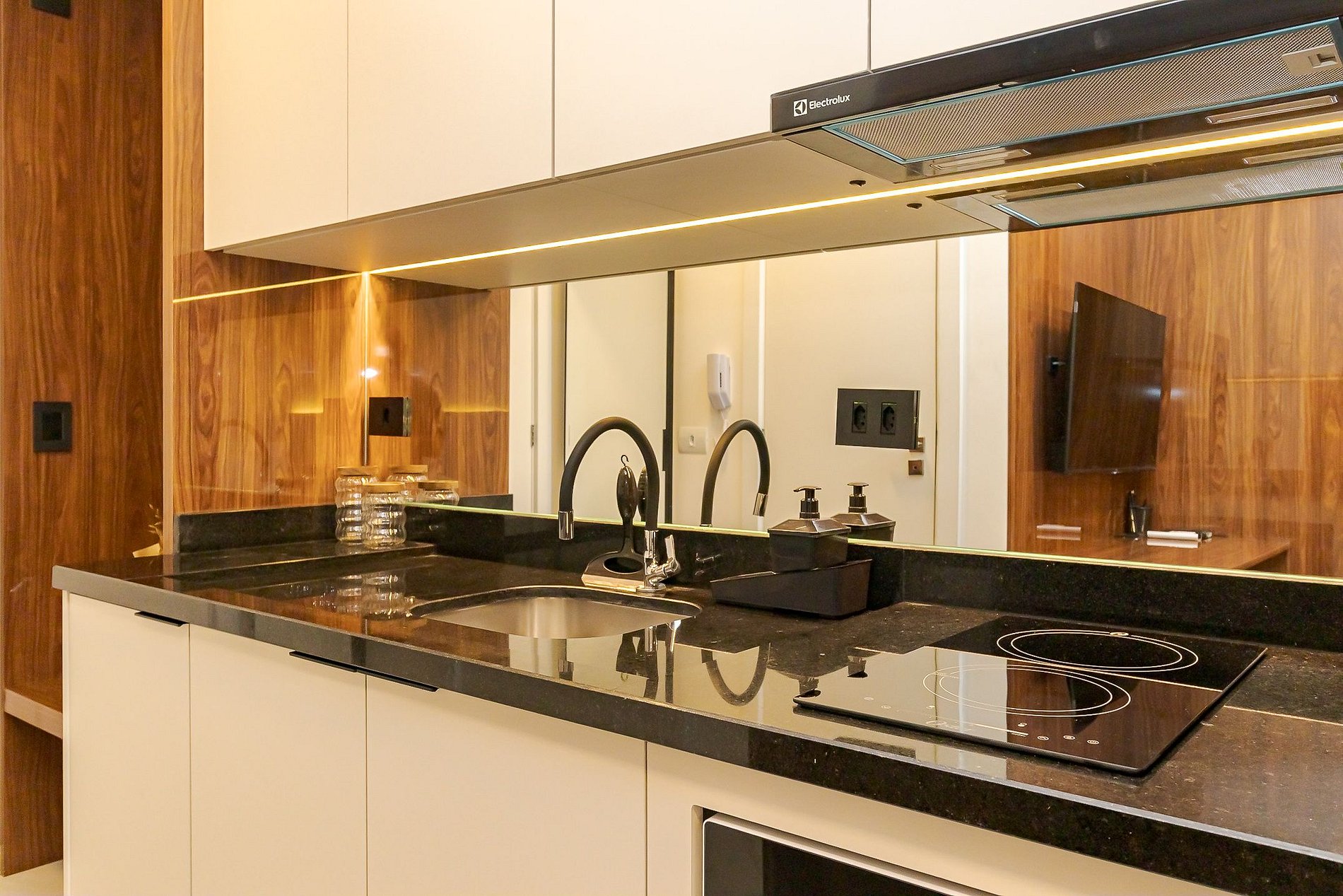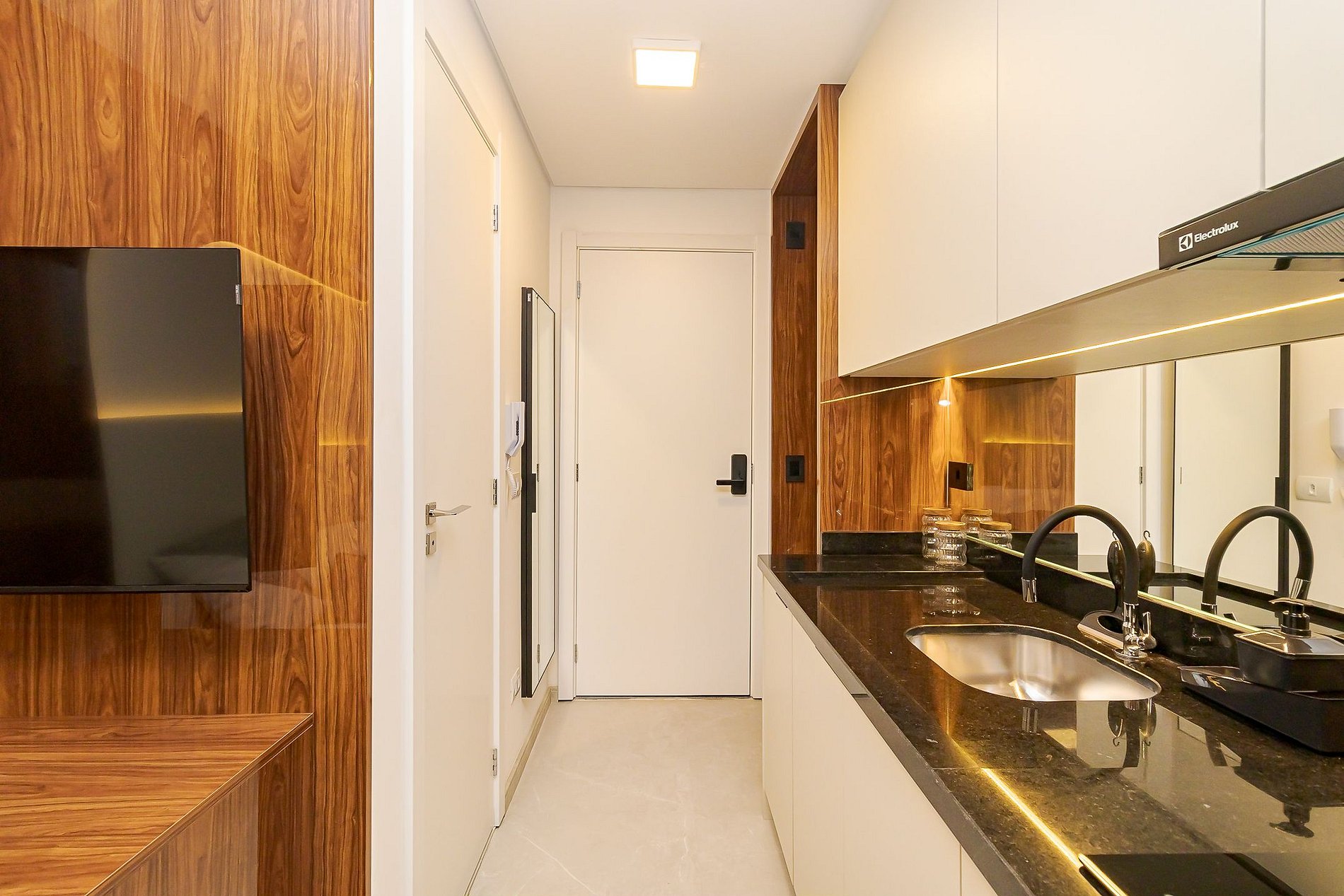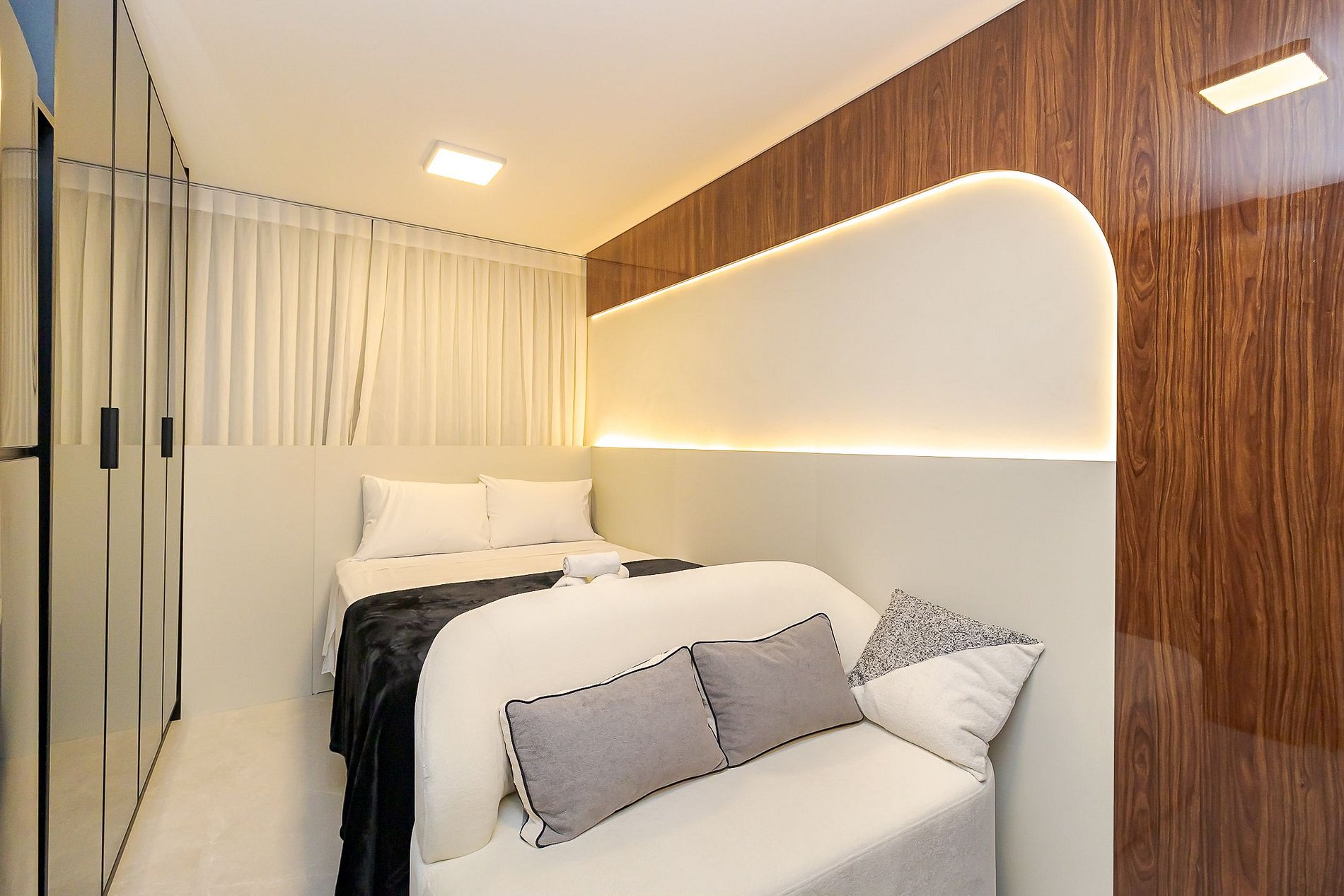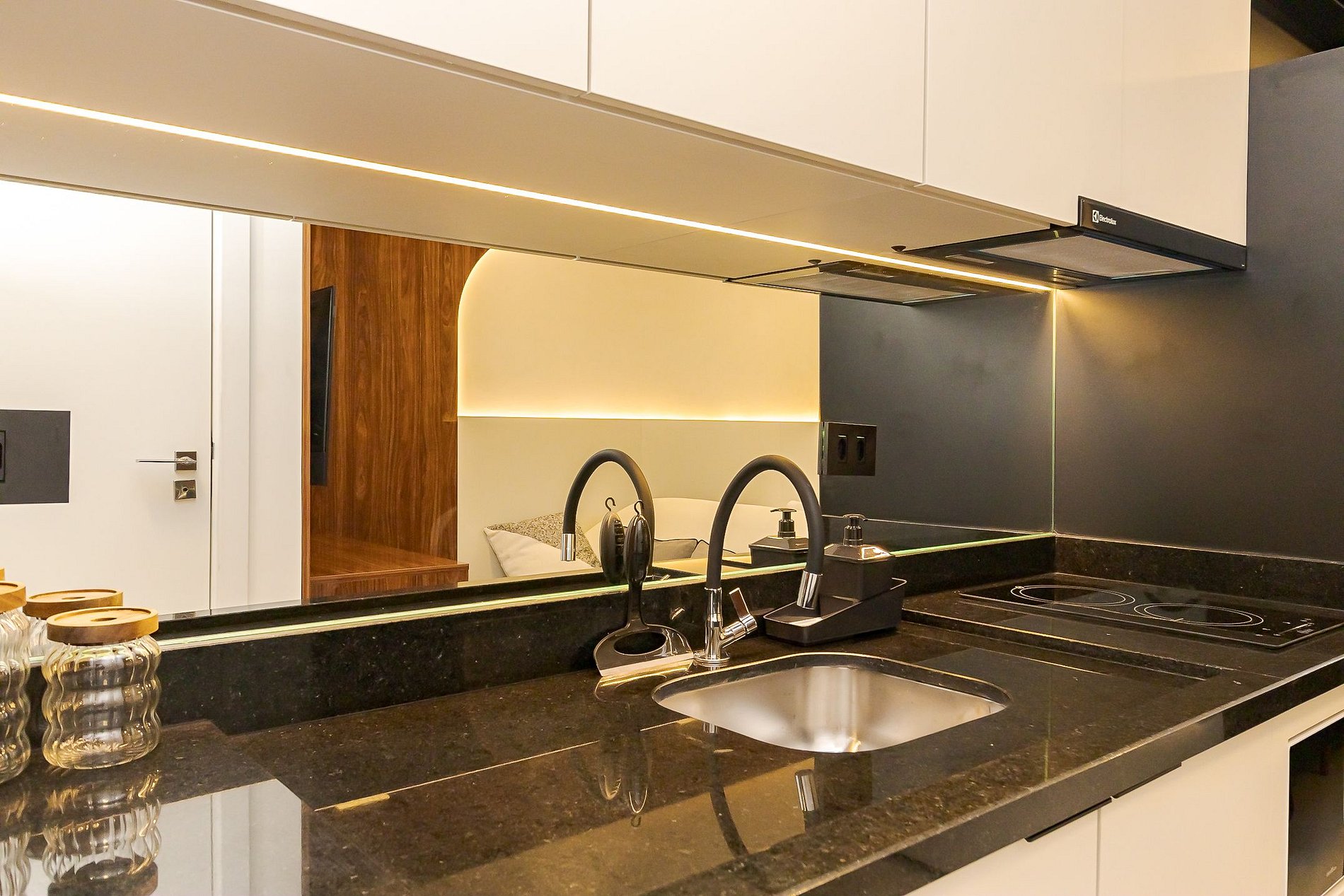 Ambiente integrado com cama de casal, ar-condicionado, Smart TV, armários espelhados e cozinha equipada com cooktop, micro-ondas , geladeira e utensílios básicos para sua estadia . Ideal para lazer ou trabalho.