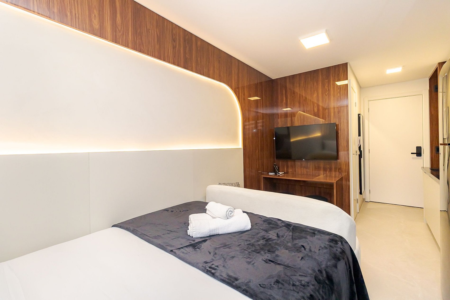 • Conectividade e comodidades: Wi-Fi, fechadura eletrônica para auto check-in, roupas de cama e banho inclusas, proporcionando mais praticidade e segurança.