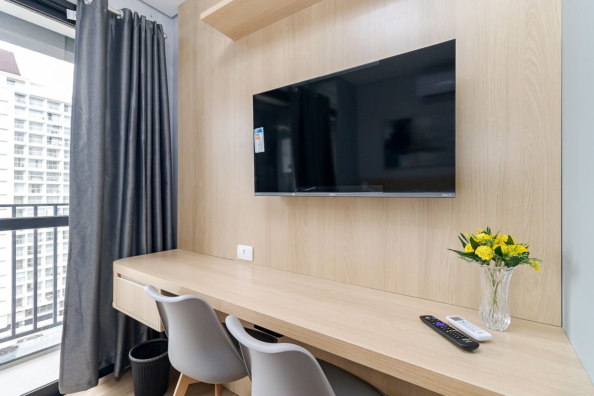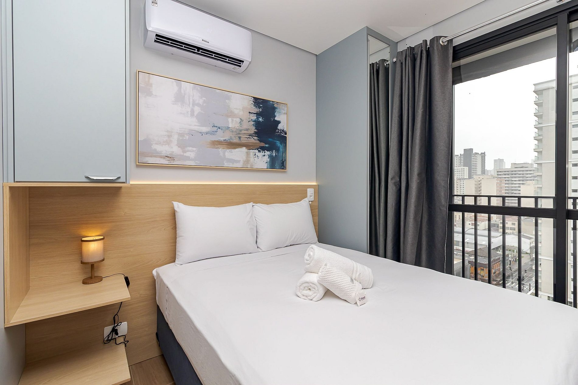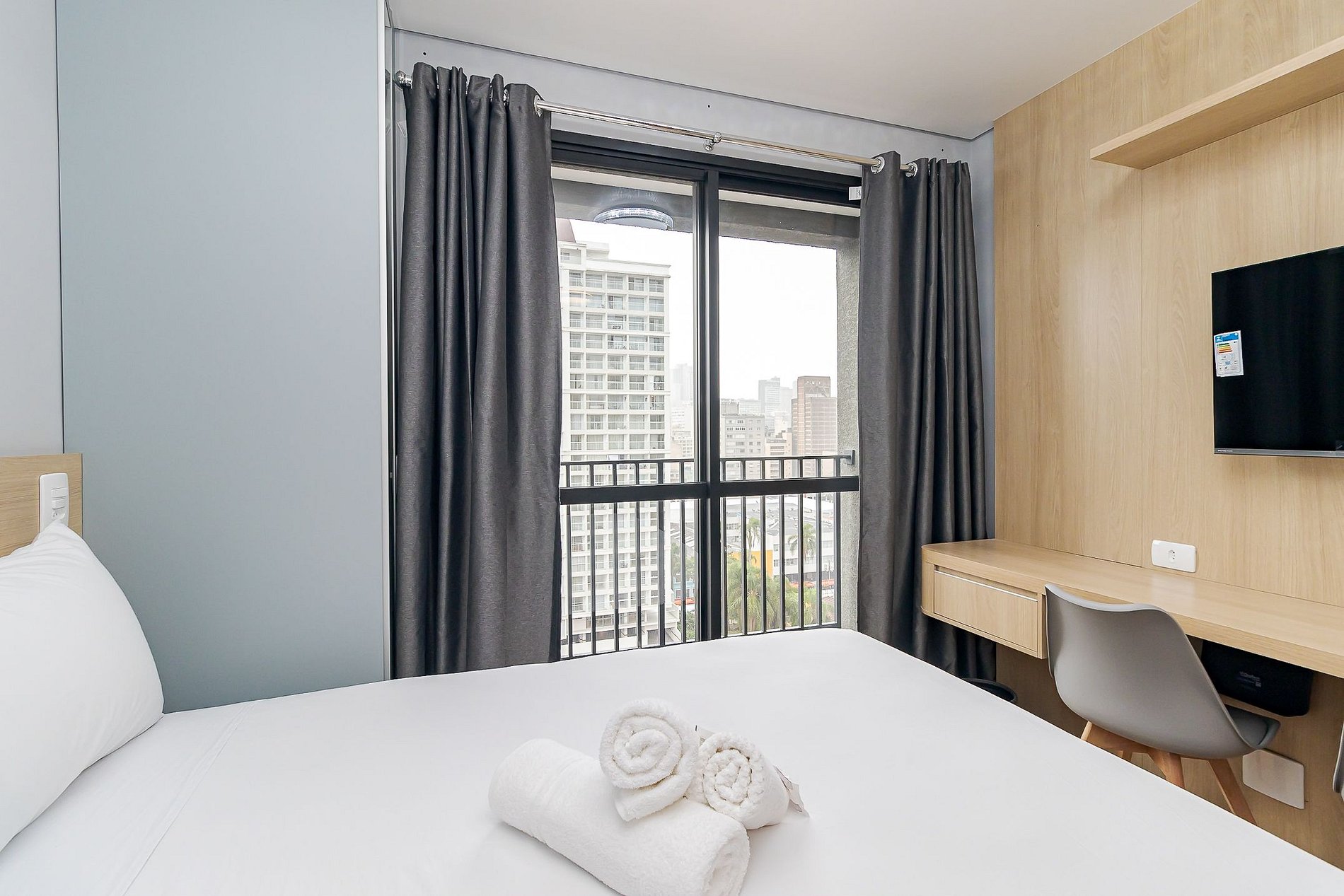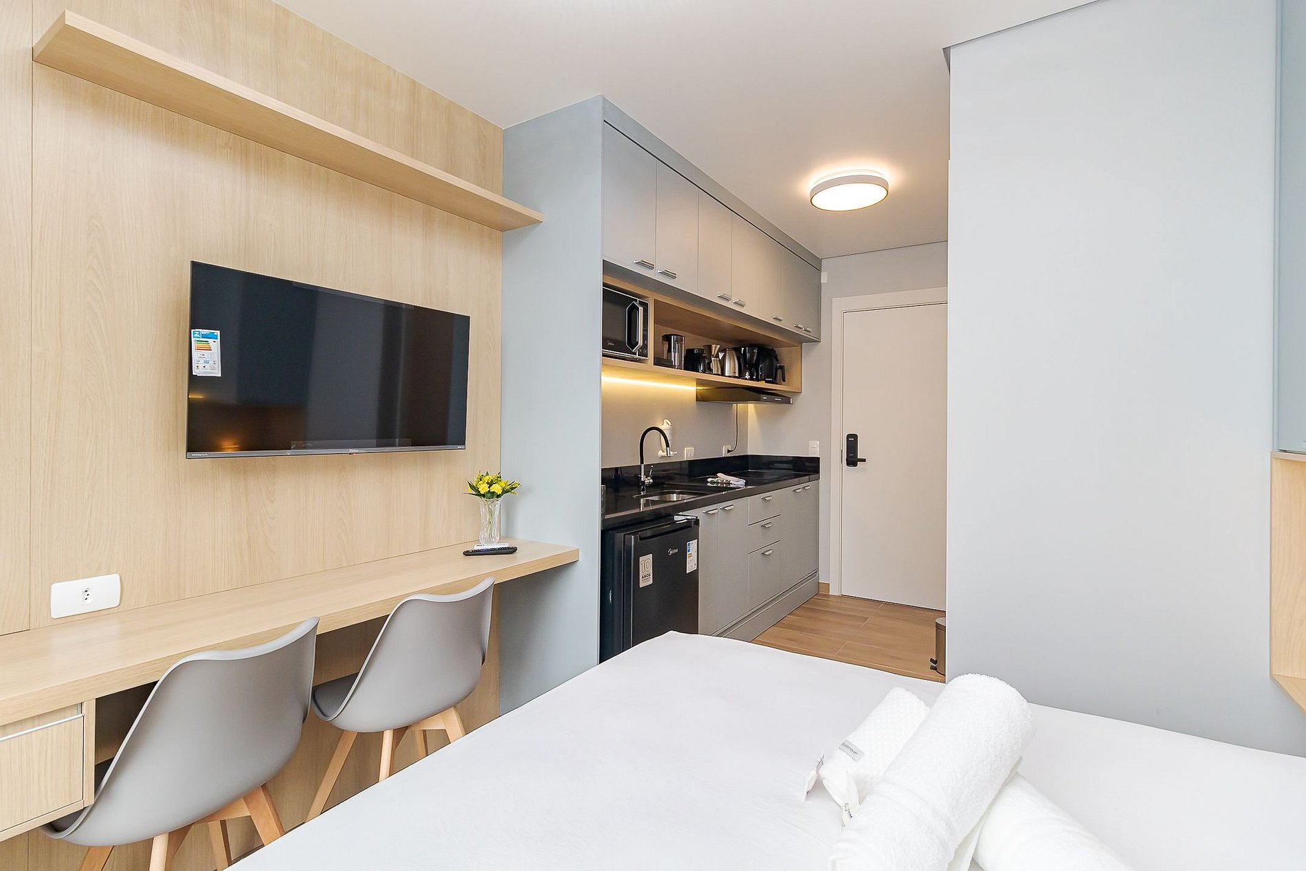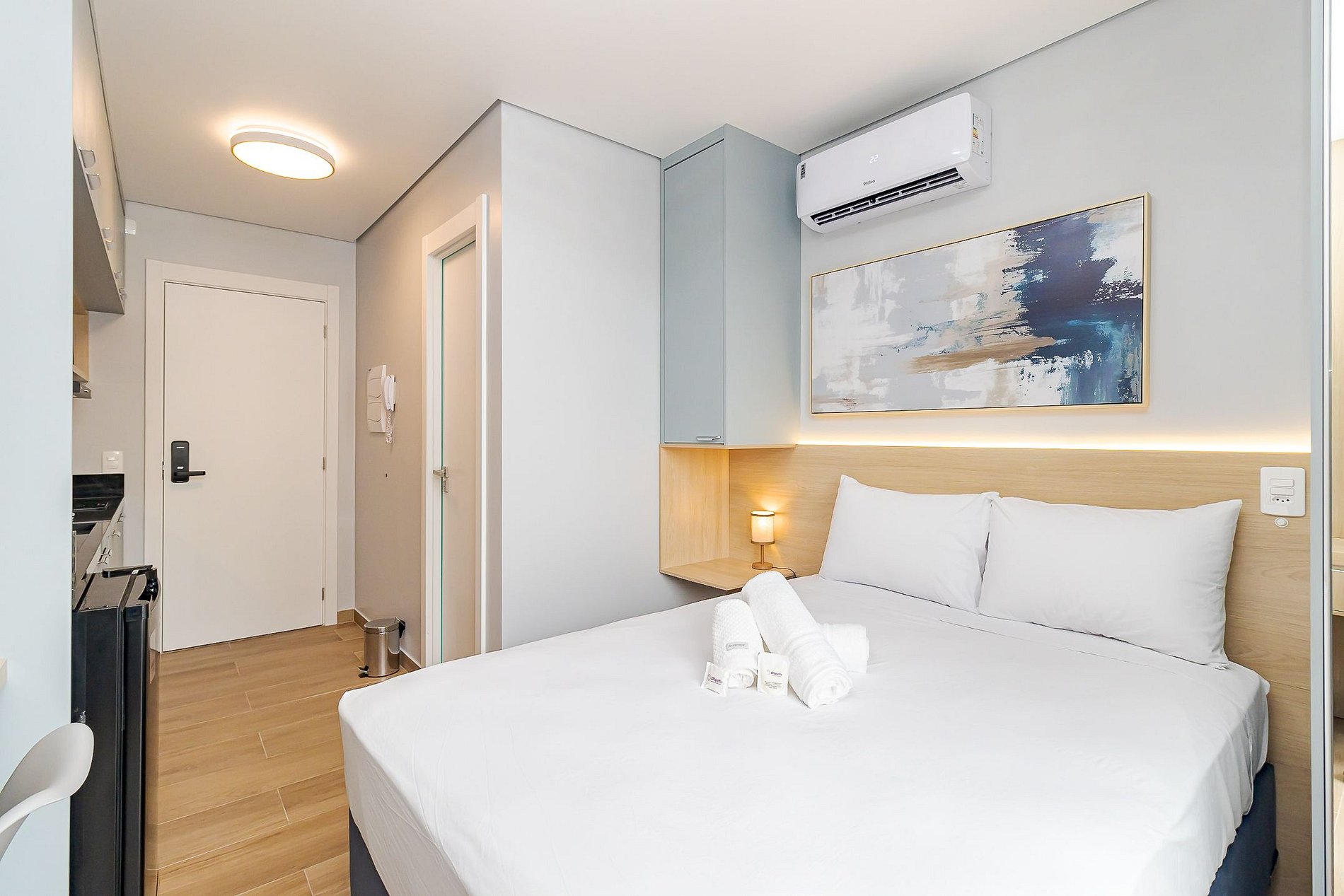 O estúdio possui 19m² muito bem distribuídos, com projeto que prioriza conforto e praticidade em cada detalhe. Apesar de compacto, é funcional e organizado.