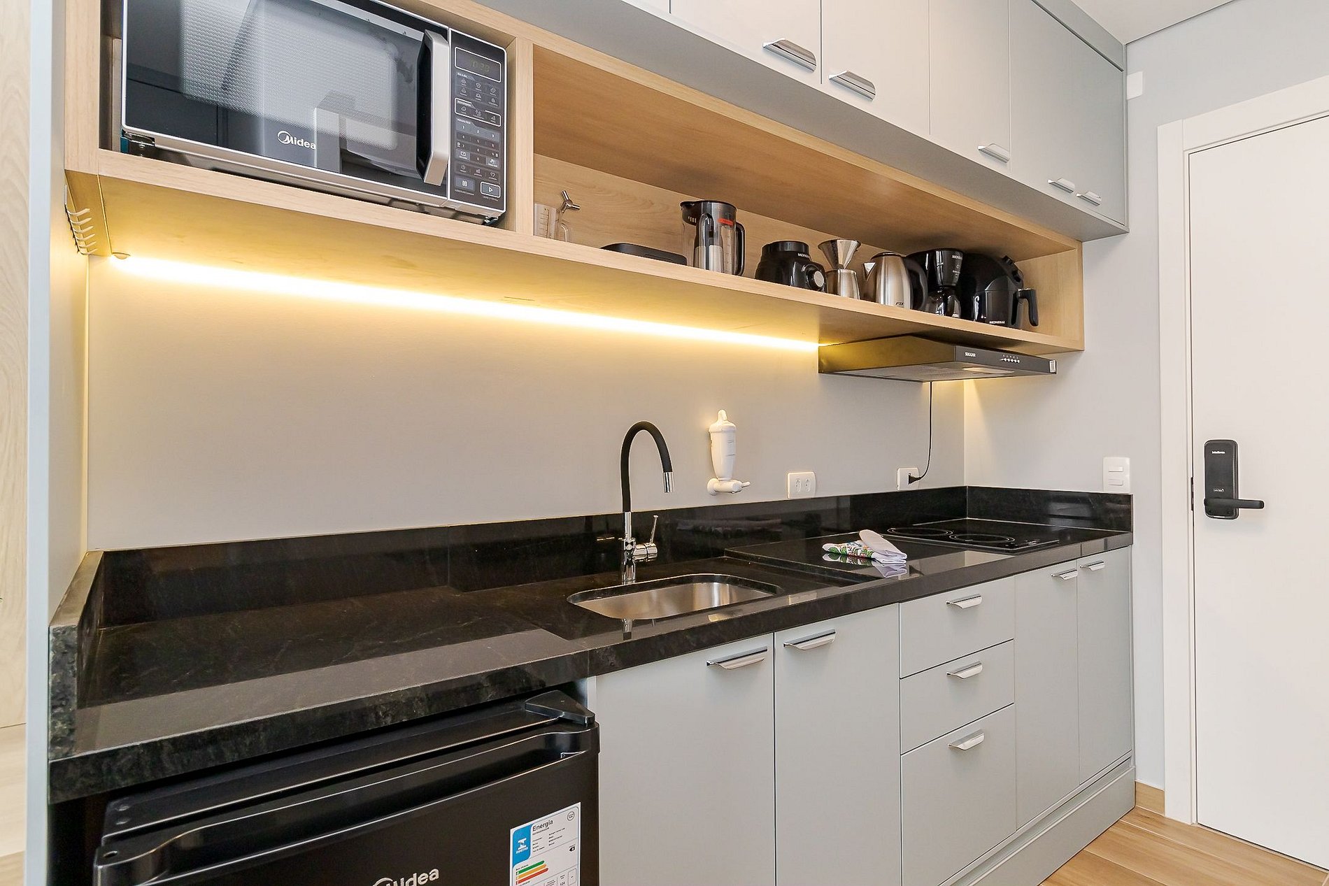 Cozinha completa e área de trabalho, ideal para estadias curtas ou longas.