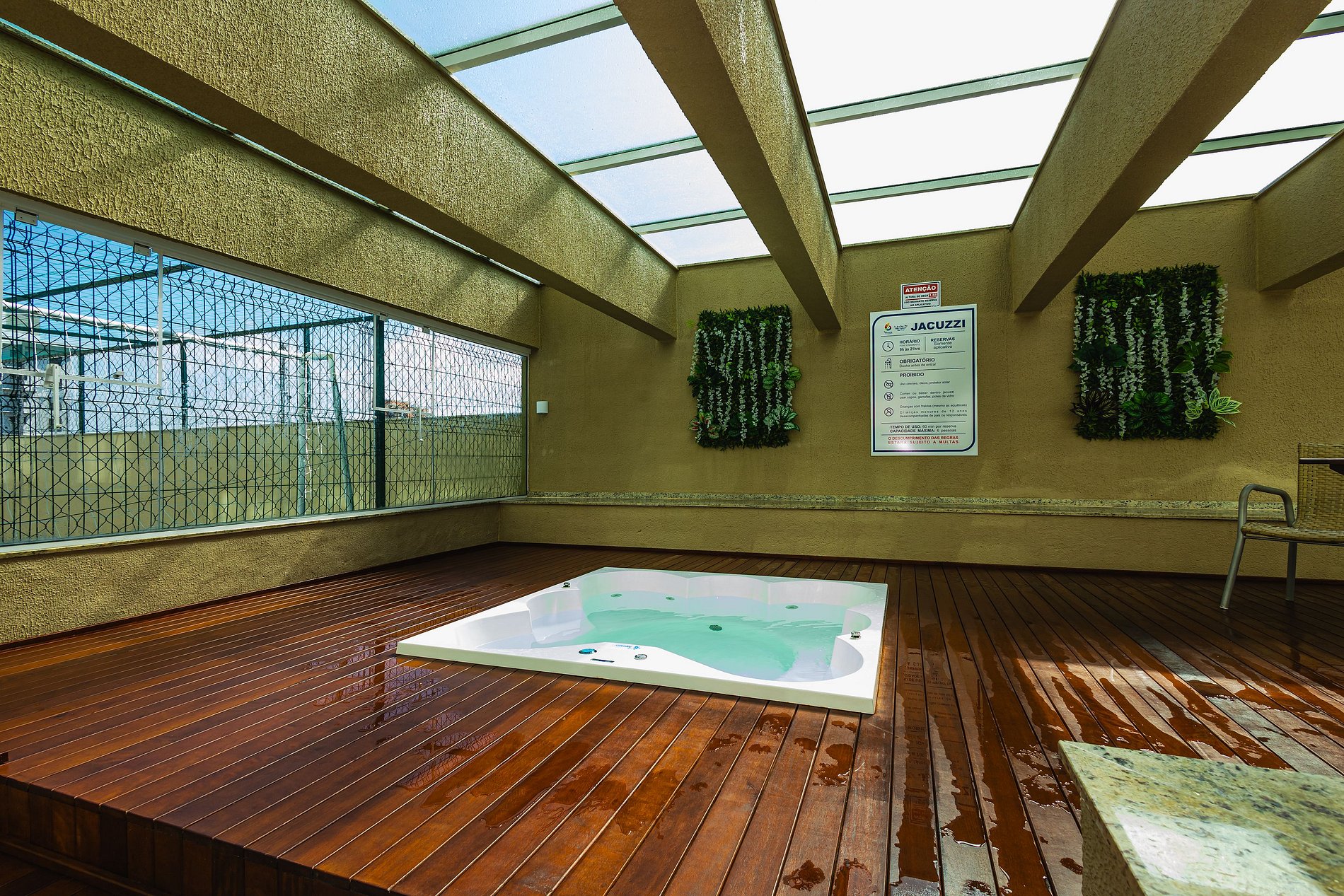 O condomínio oferece piscina, academia, sauna, salão de jogos, mercado express, parquinho infantil, espaço kids, lavanderia compartilhada e áreas de convivência.