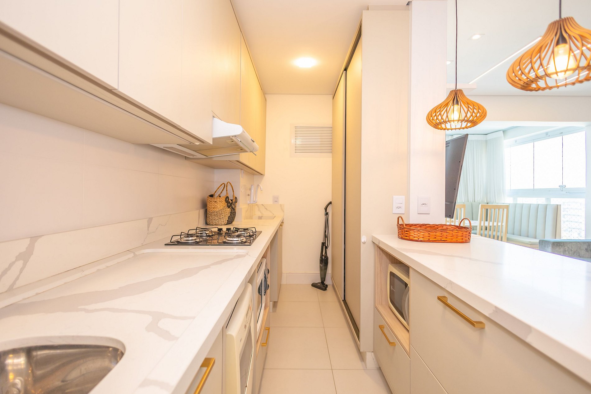 • Cozinha: geladeira, micro-ondas, forno, cooktop, depurador, cafeteira, chaleira elétrica, sanduicheira, panelas, pratos, copos, talheres e utensílios.