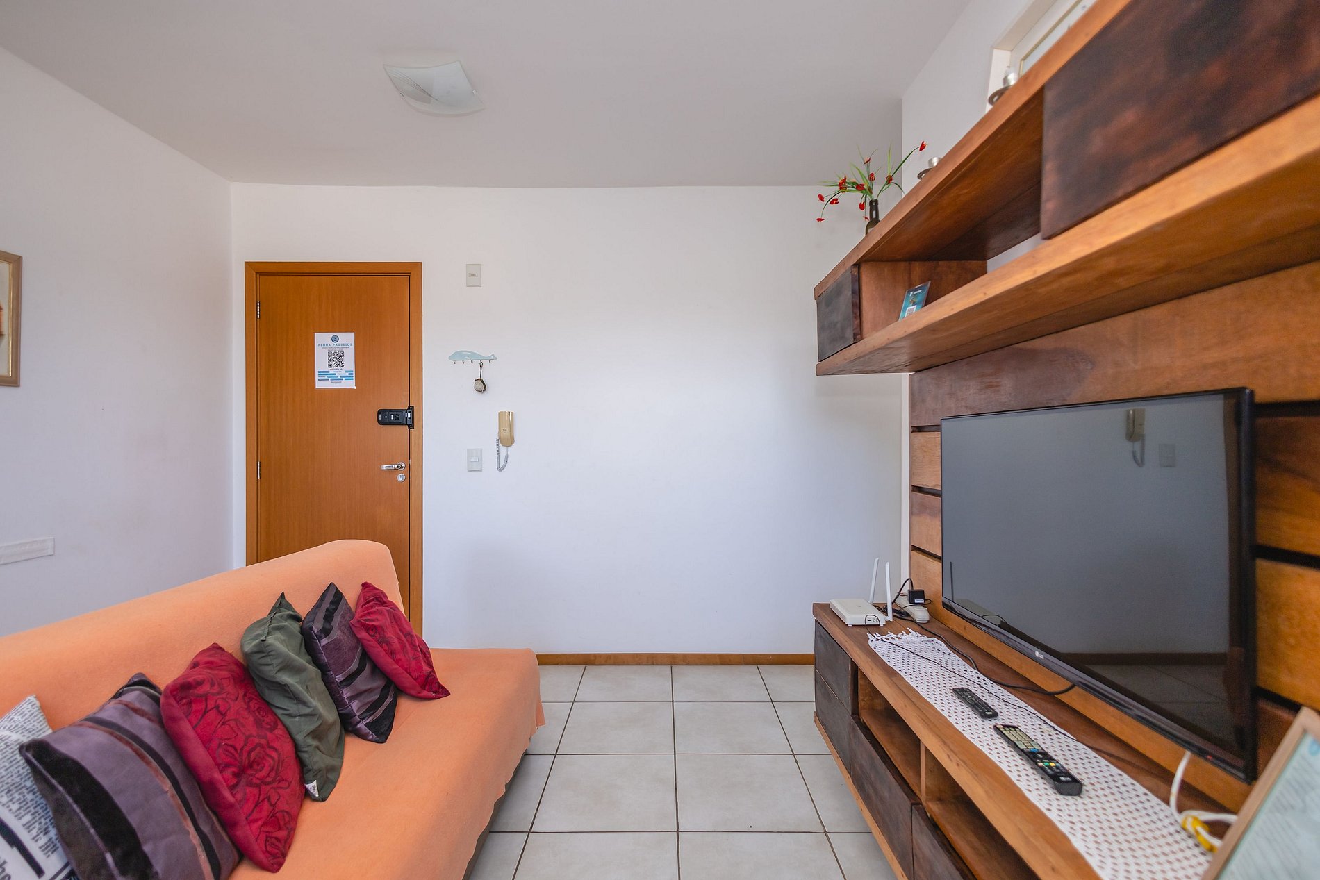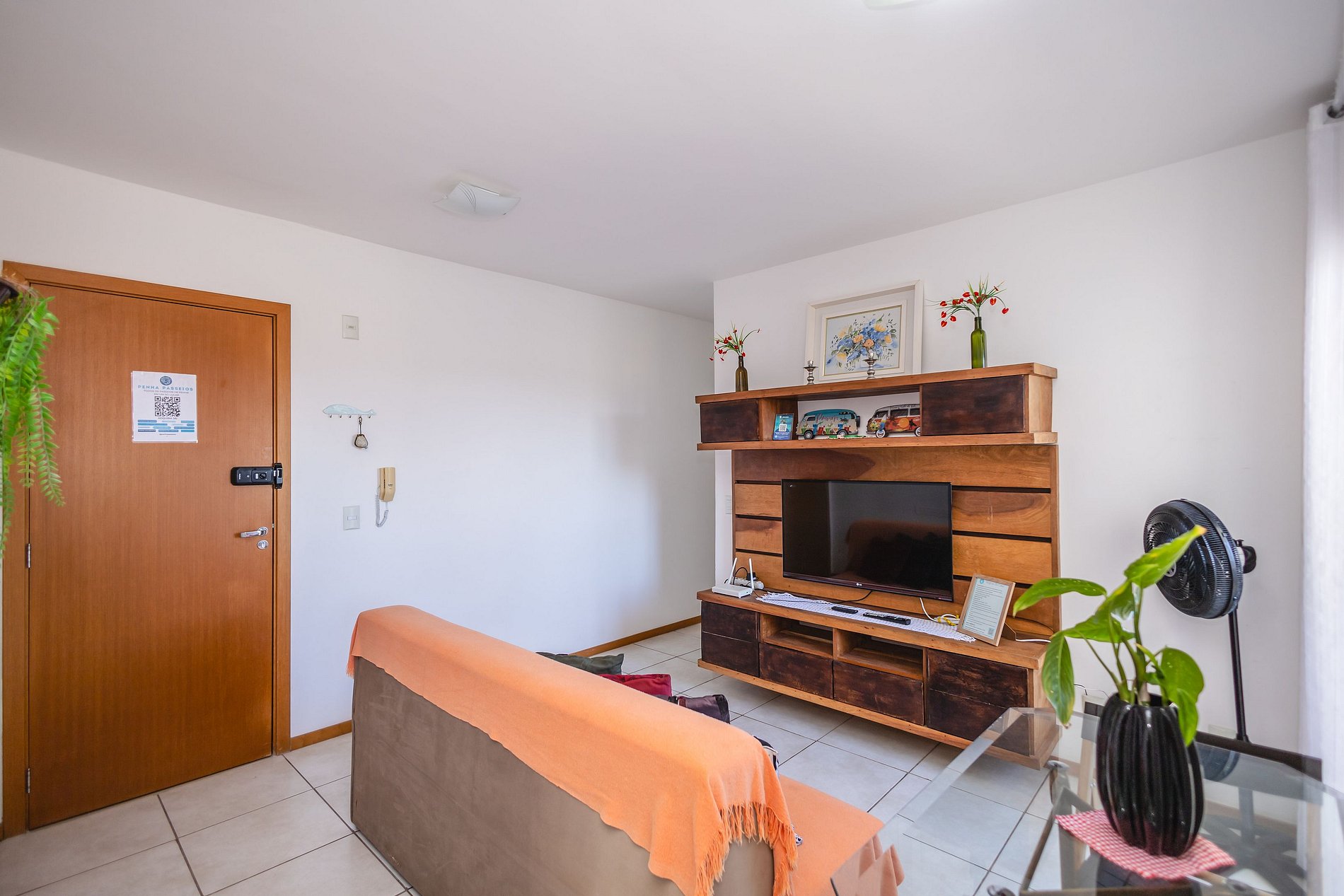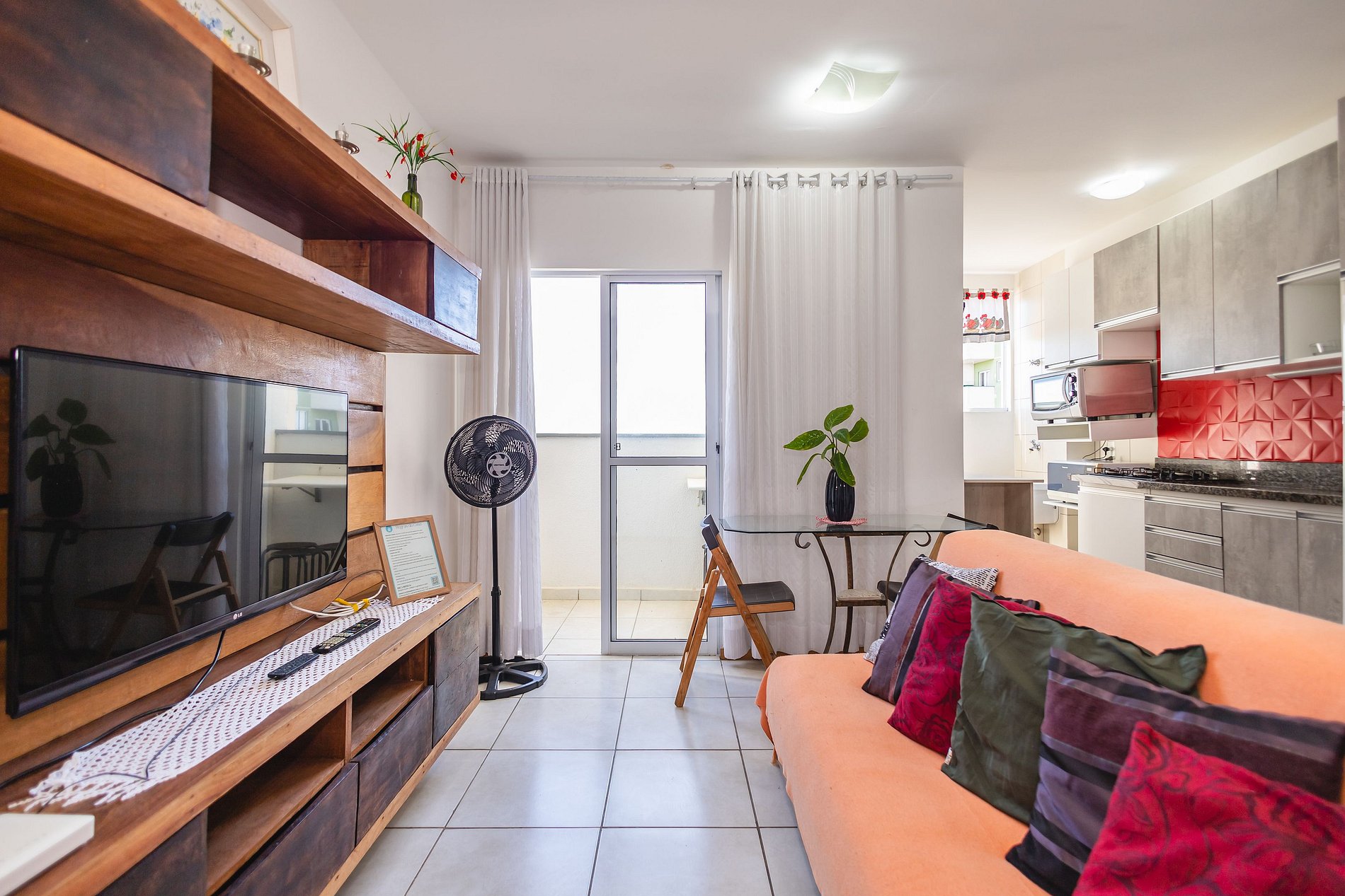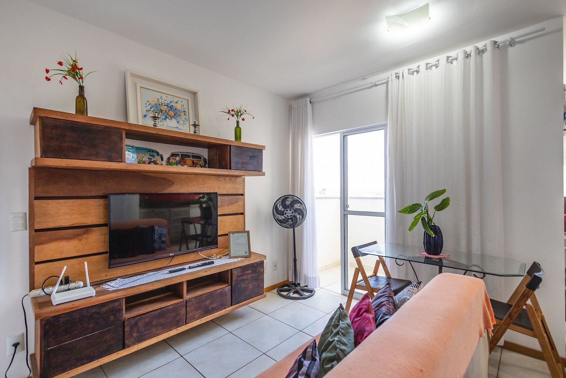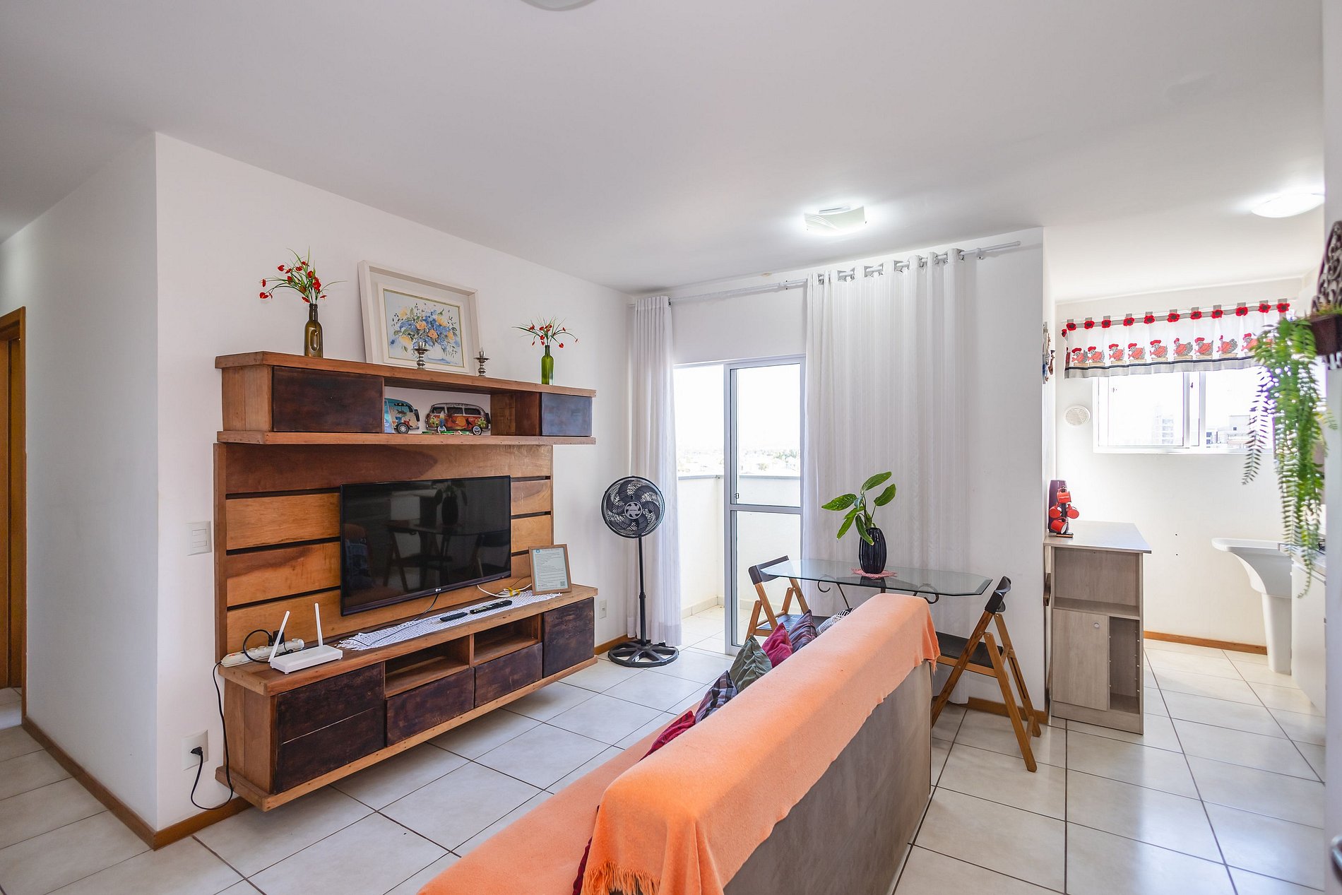 • Sala integrada à cozinha: sofá, mesa de jantar, rack com TV Smart e ventilador de coluna.