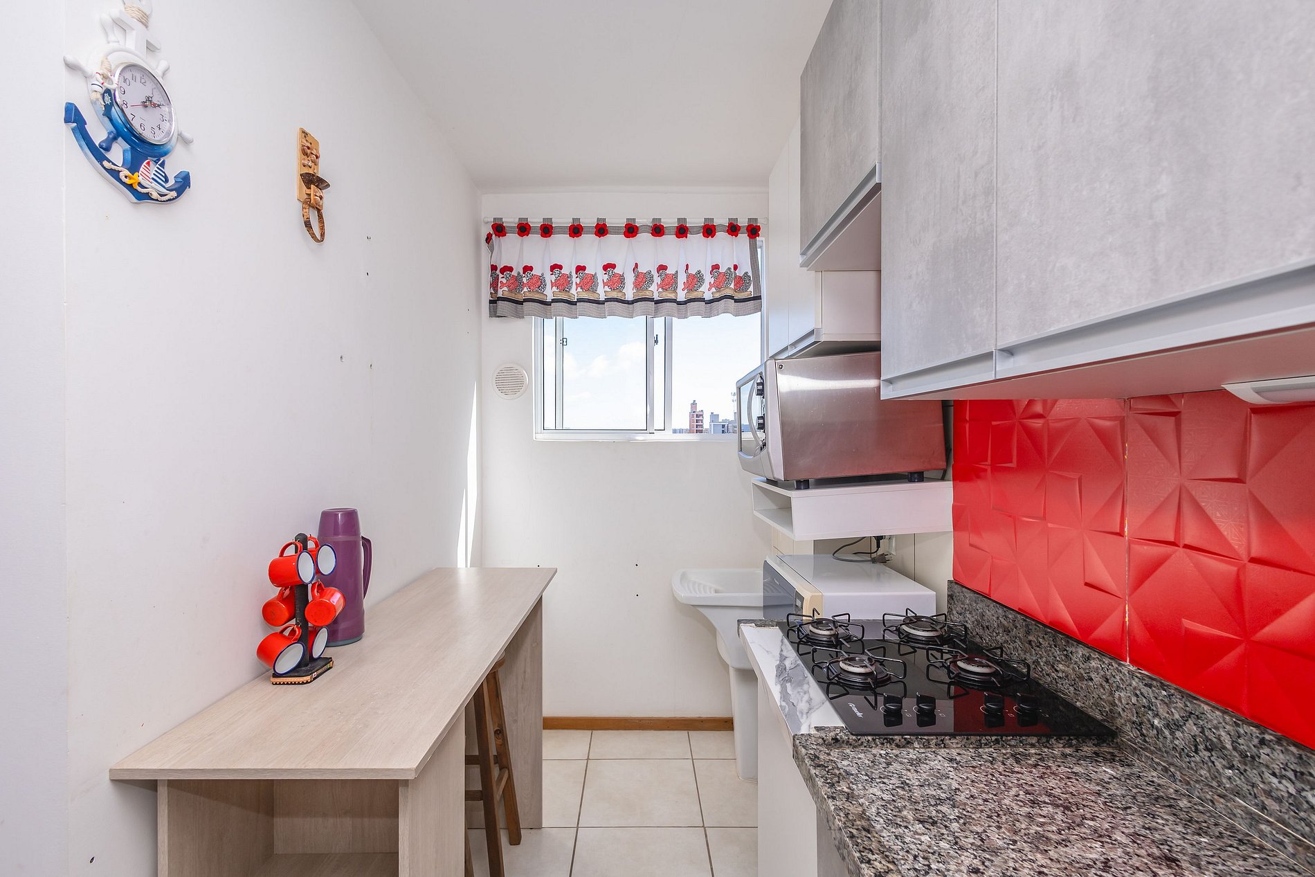 • Cozinha: cooktop, geladeira, forno, micro-ondas, cafeteira, chaleira elétrica, pratos, copos, talheres e utensílios básicos.