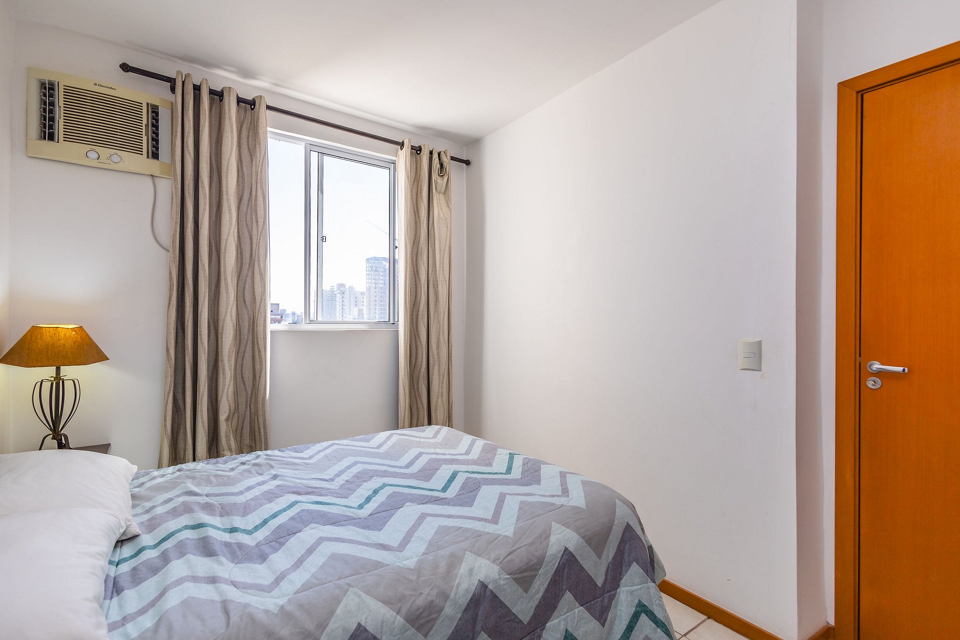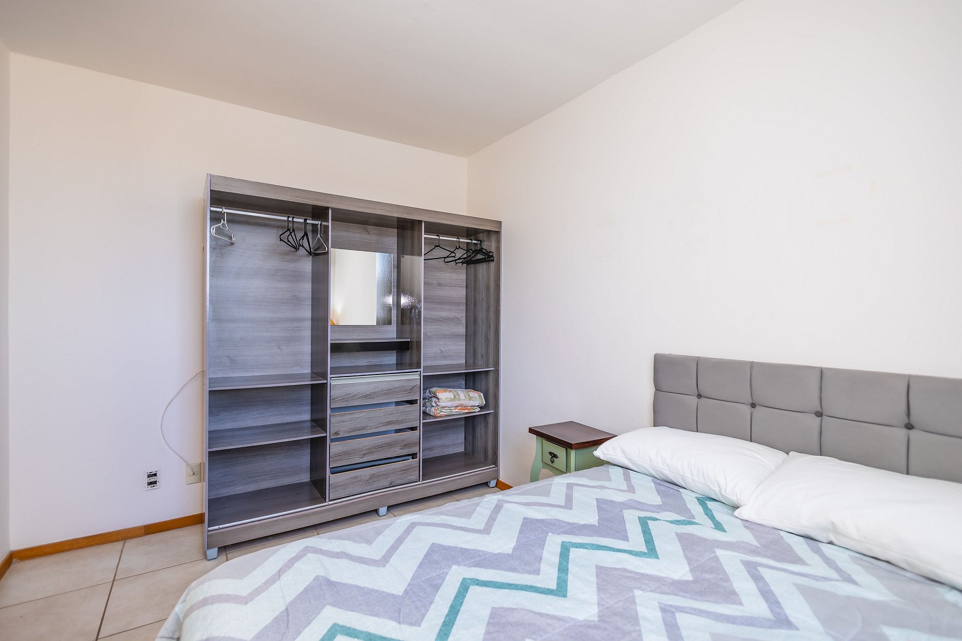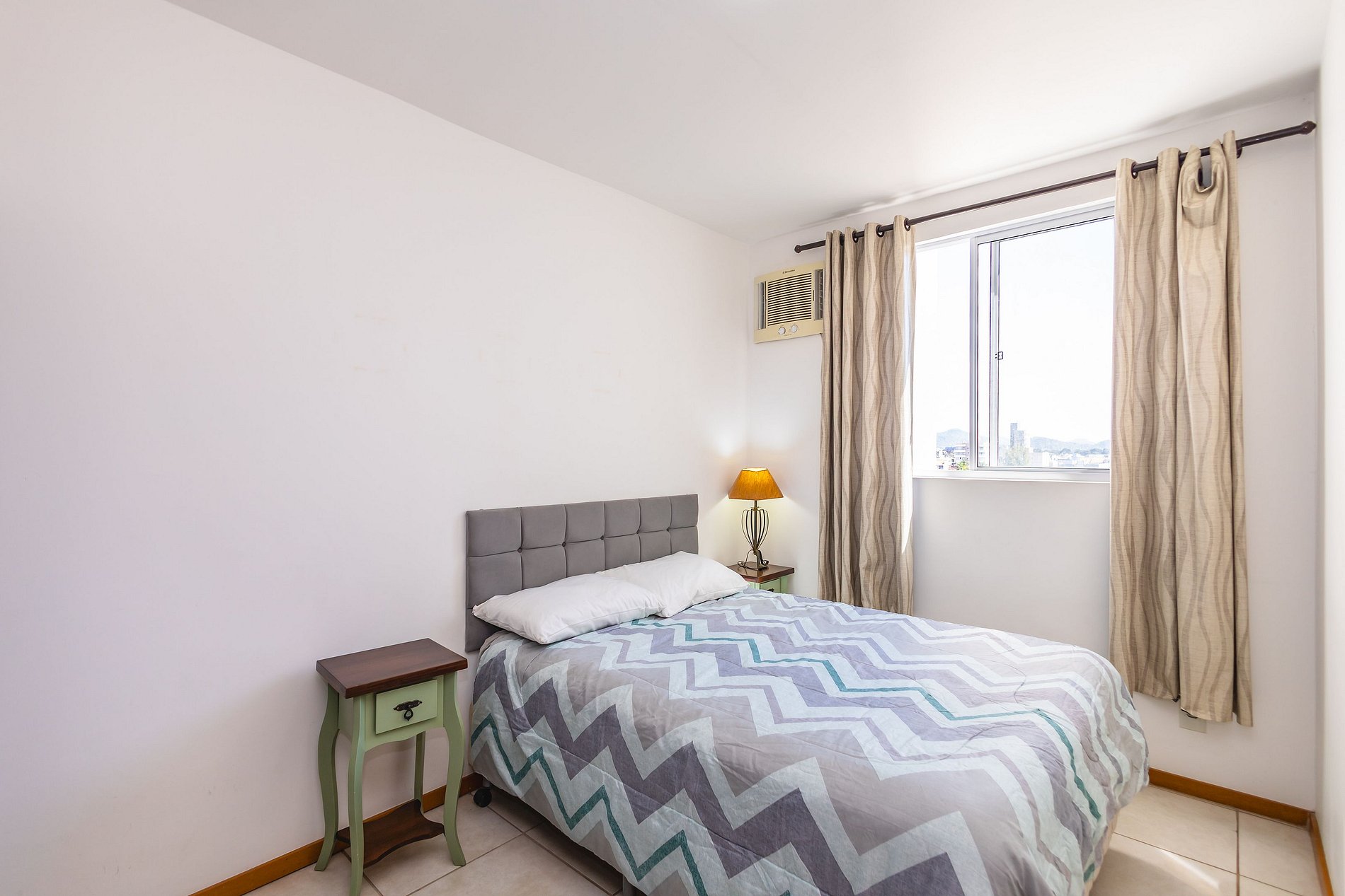 • Quarto 1: cama de casal, mesas de apoio, luminária, ar-condicionado, cortina privativa e armário com cabides.