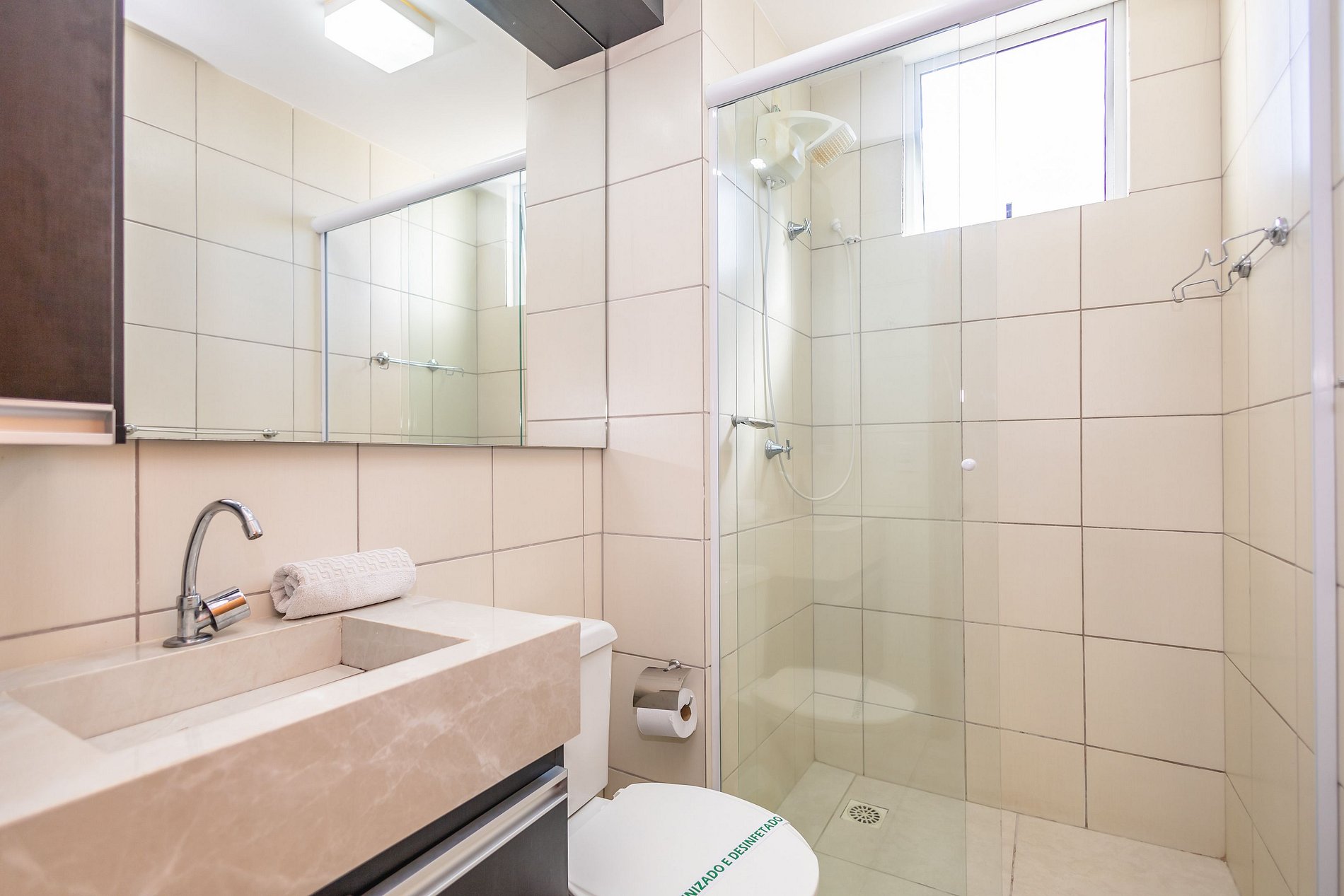 • Banheiro: chuveiro com água quente, box de vidro e espelho.