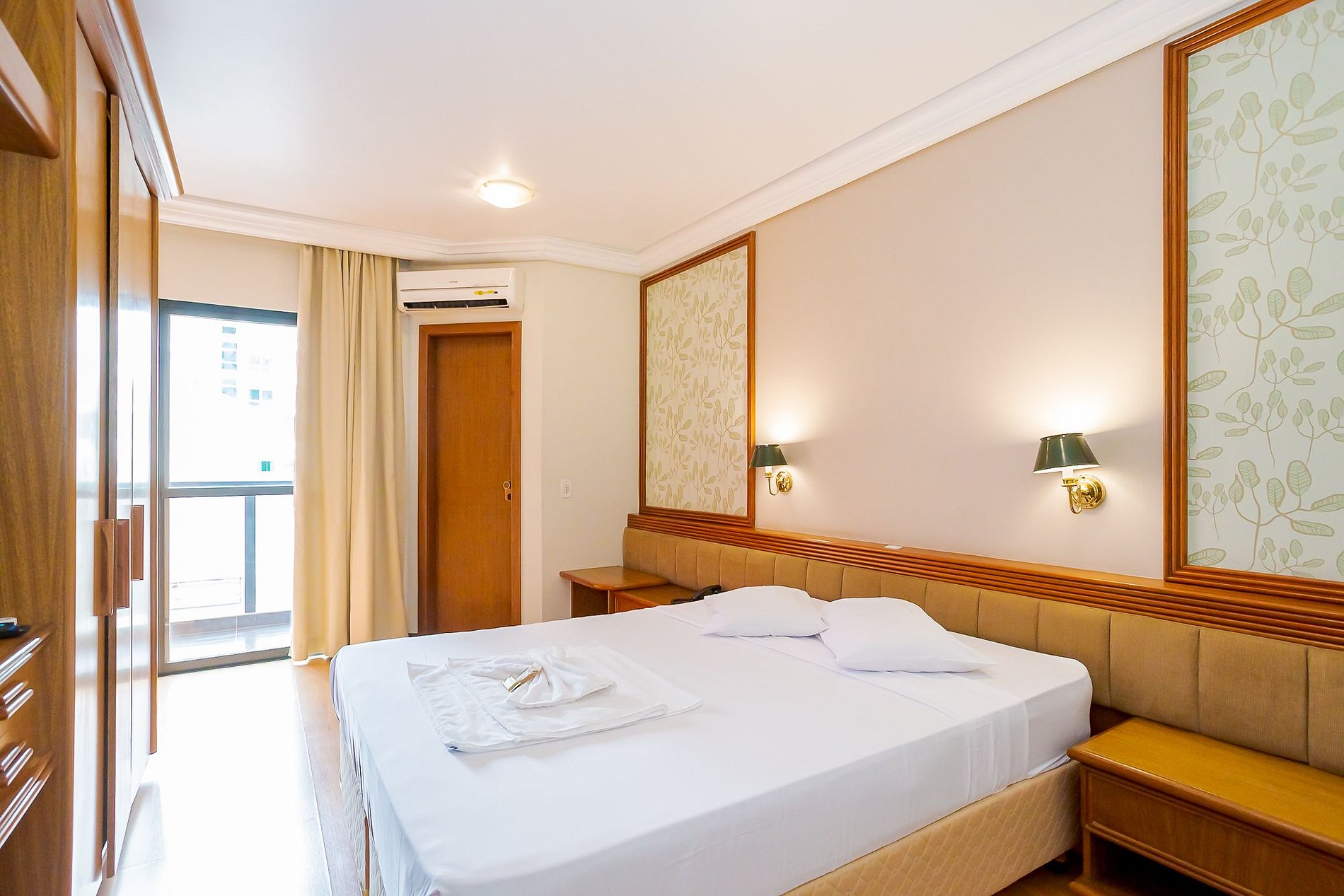 • Quarto: cama queen, TV, ar-condicionado split, cabeceira, cortina privativa, luz de leitura e armários.