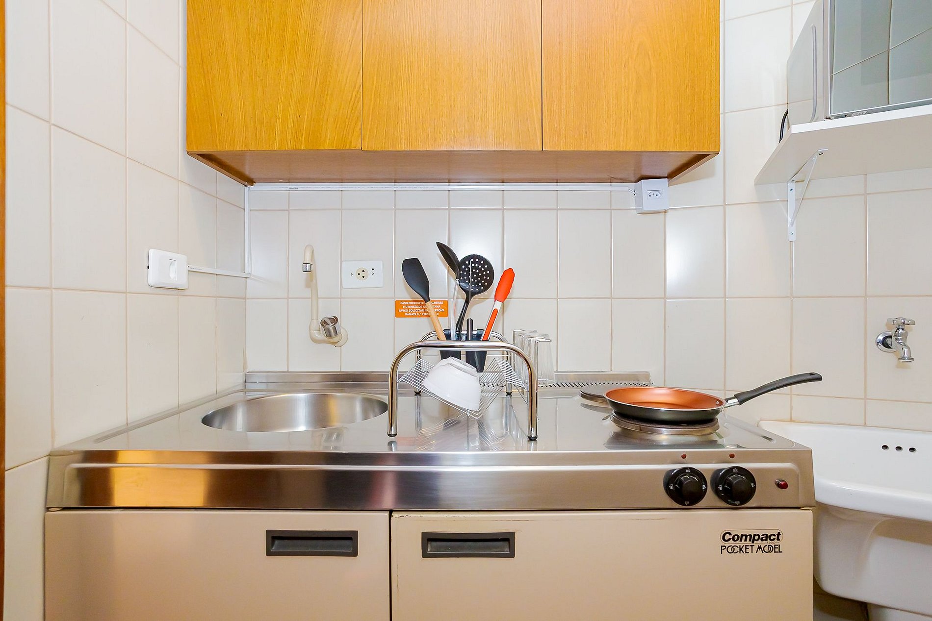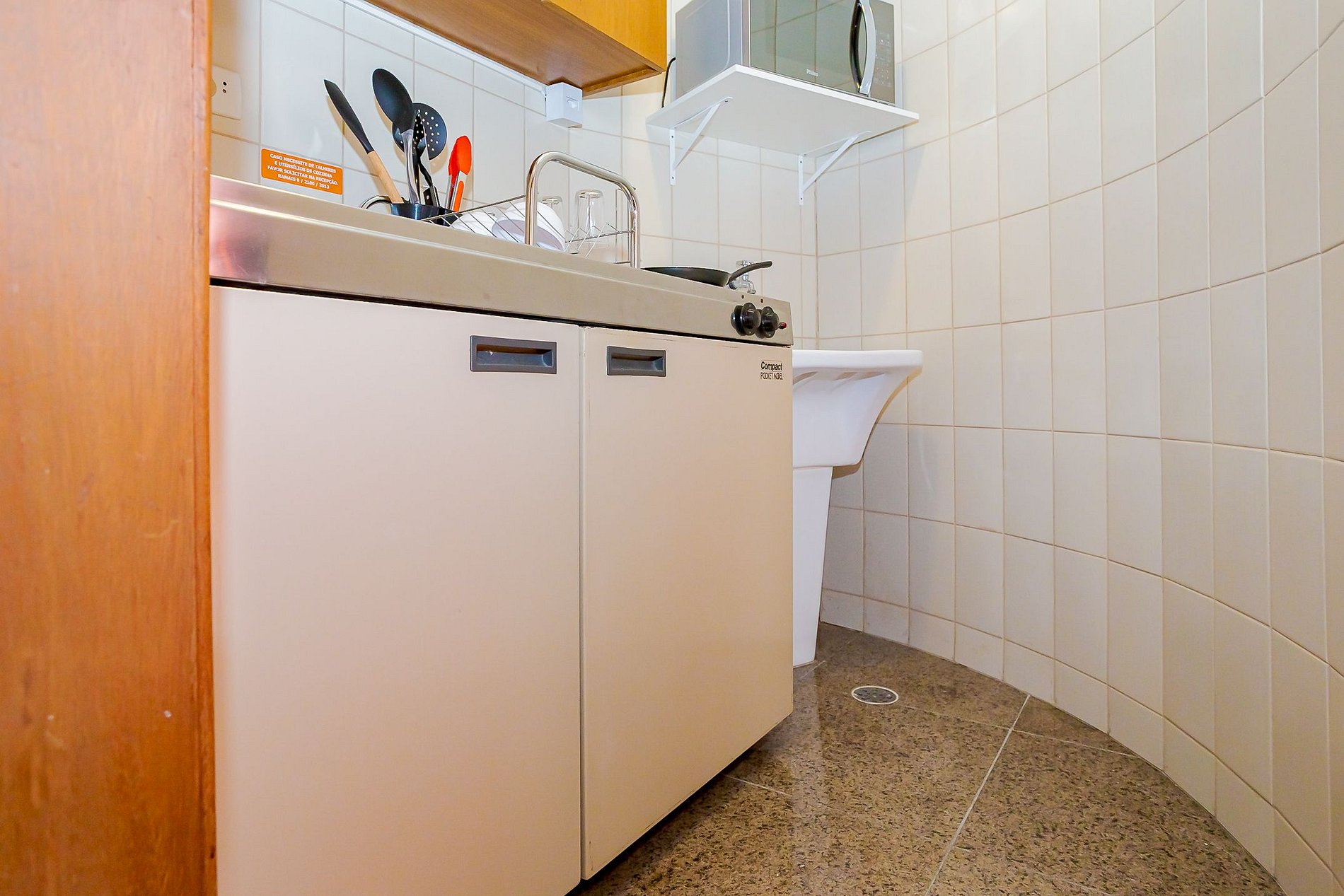 • Cozinha compacta: equipada com micro-ondas, frigobar, fogão, chaleira e utensílios básicos.