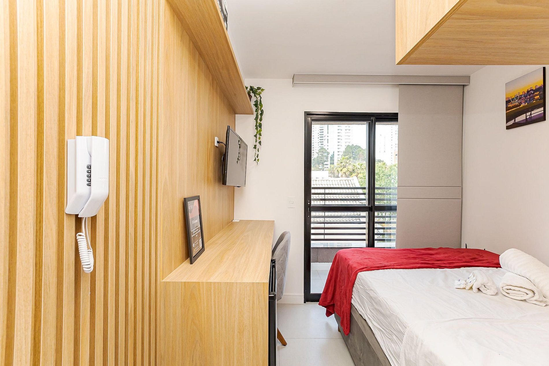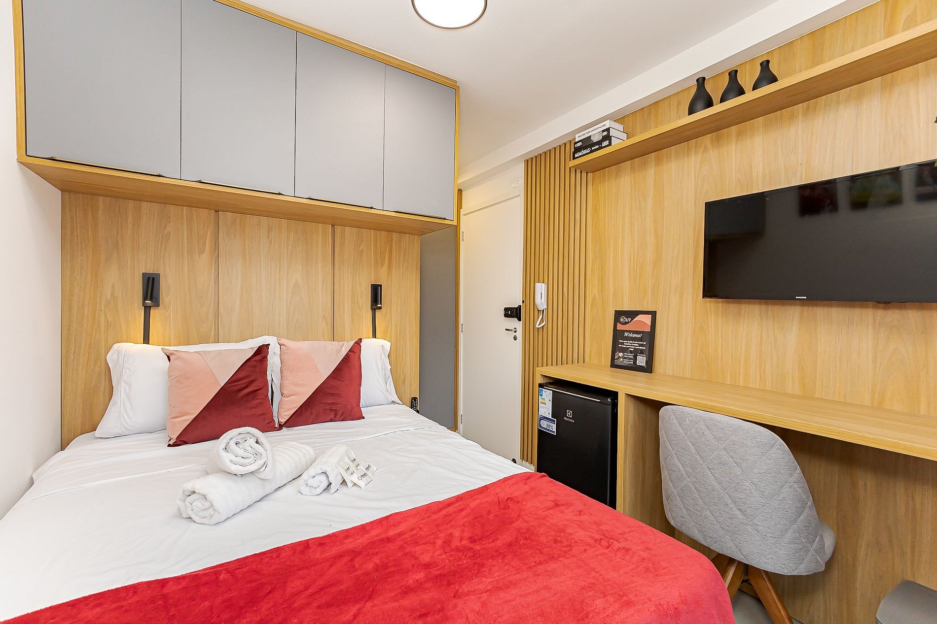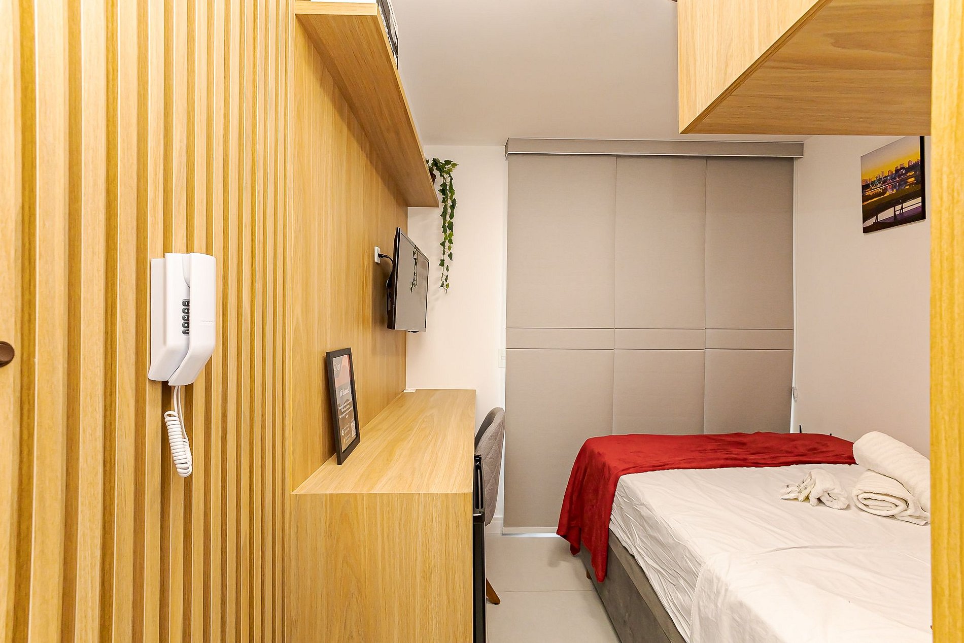 Apesar de compacto, o estúdio foi pensado para oferecer conforto e praticidade durante a estadia: