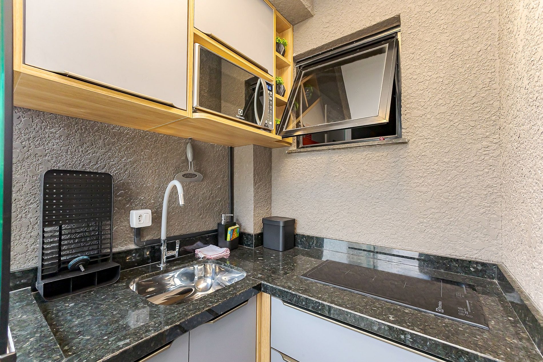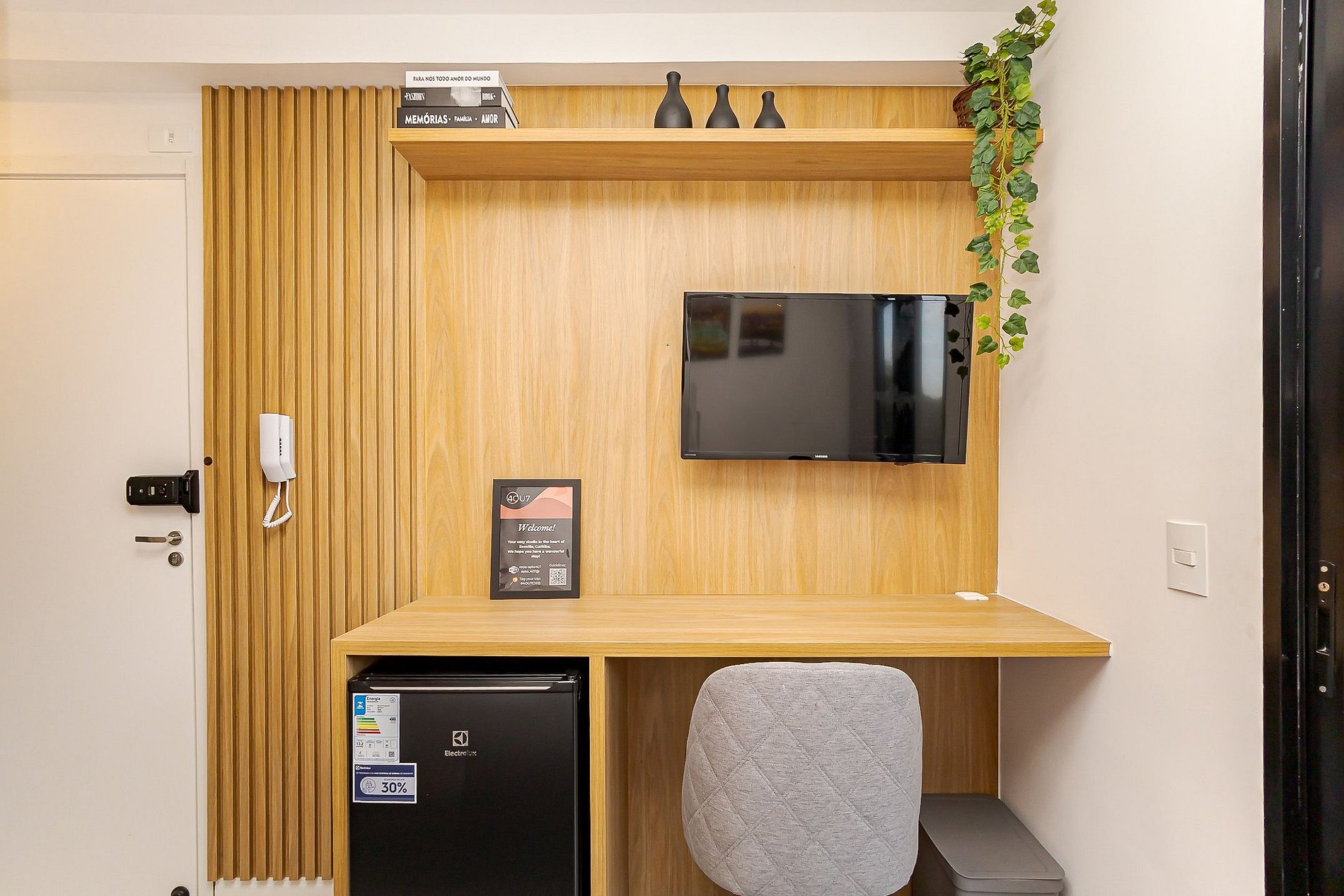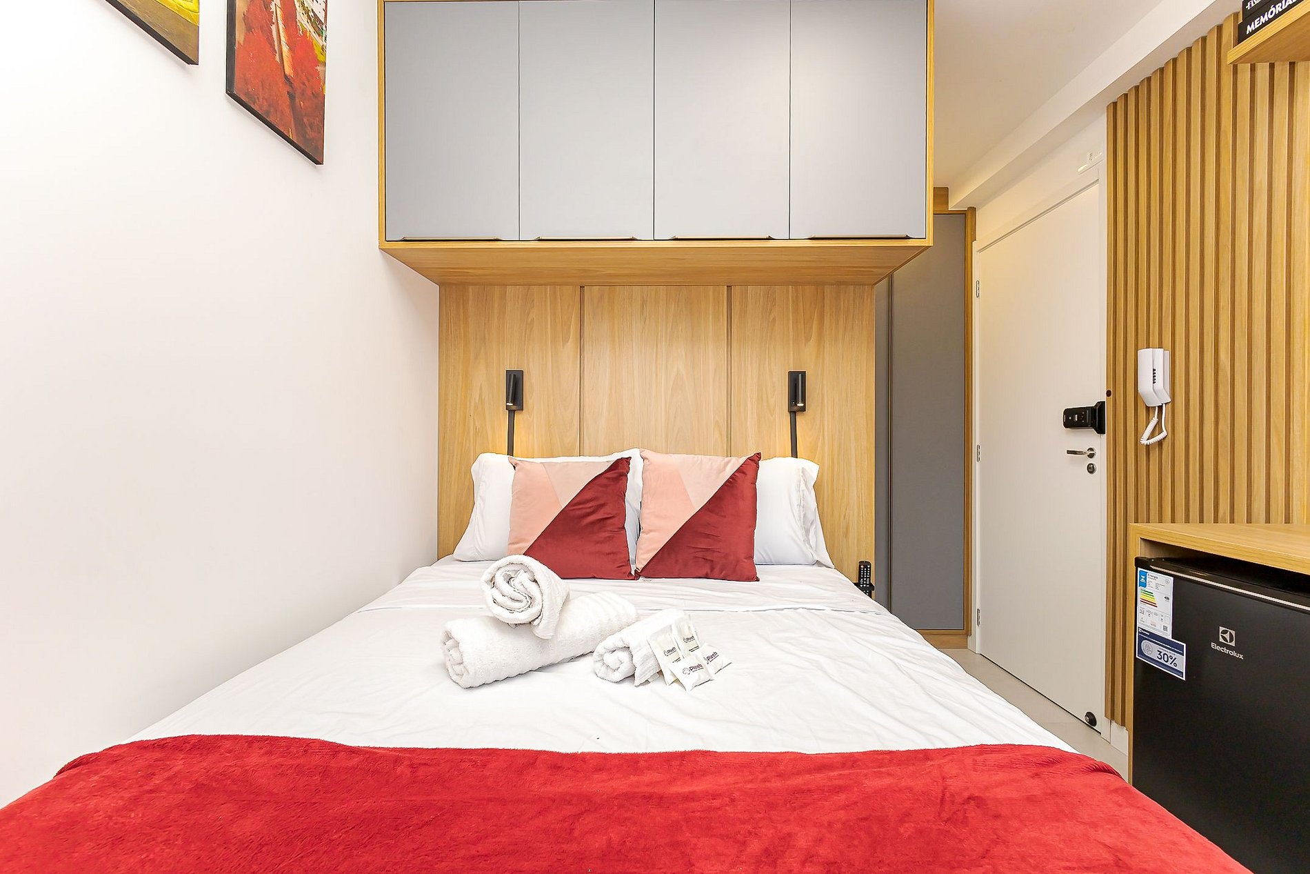 Apesar de compacto, o estúdio foi pensado para oferecer conforto e praticidade durante a estadia: