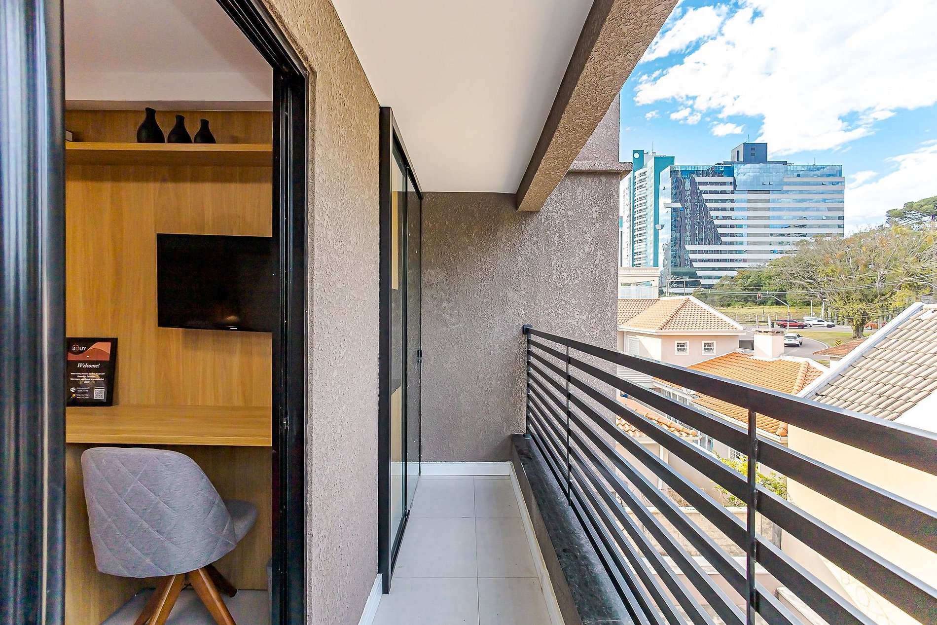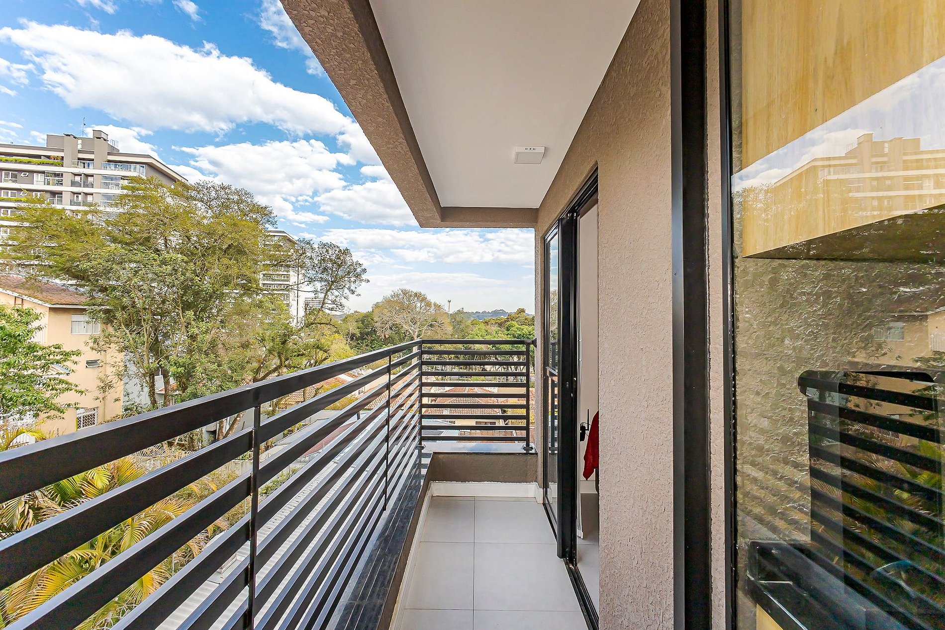 • Varanda: conecta o estúdio à cozinha privativa, com espaço amplo para relaxar.