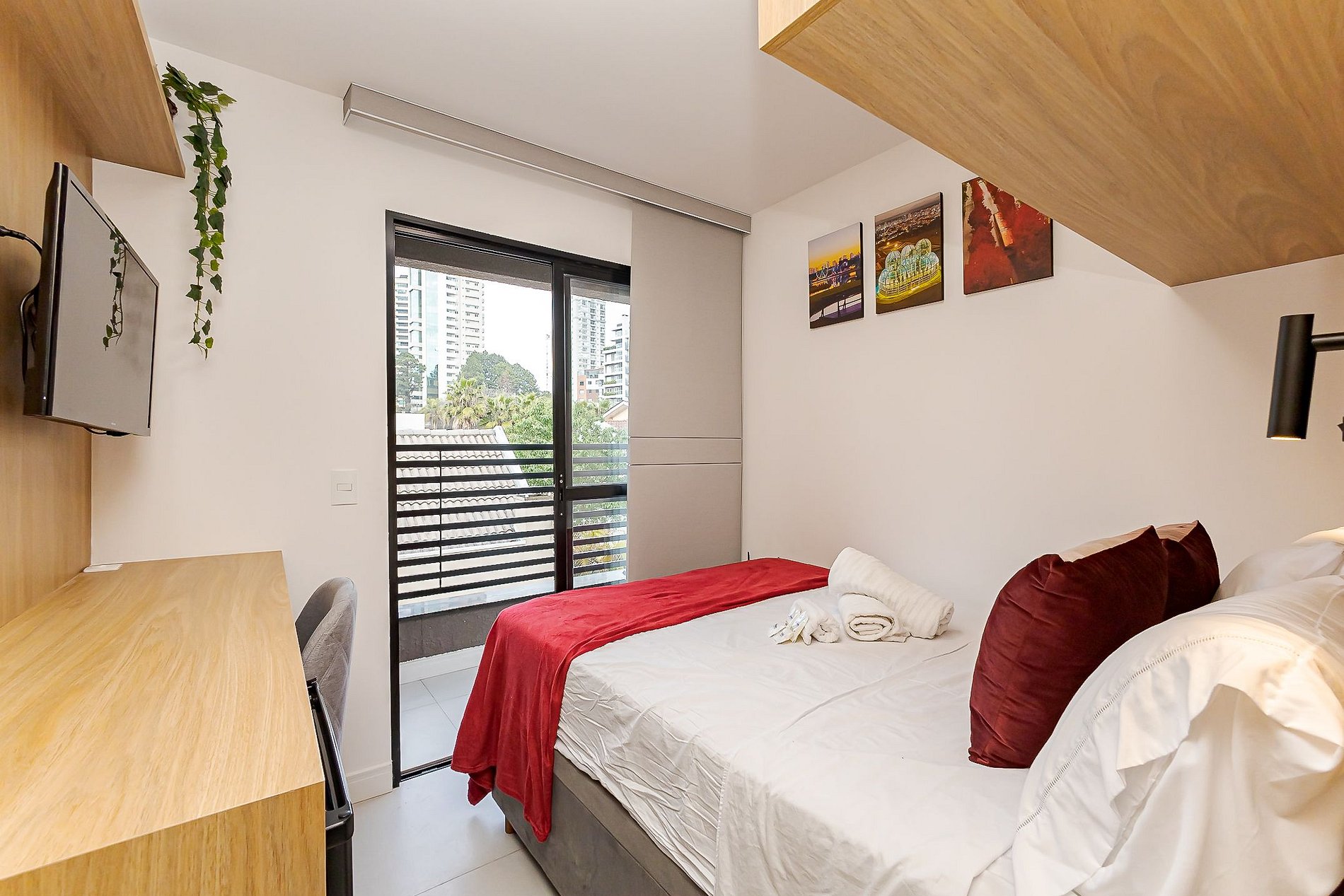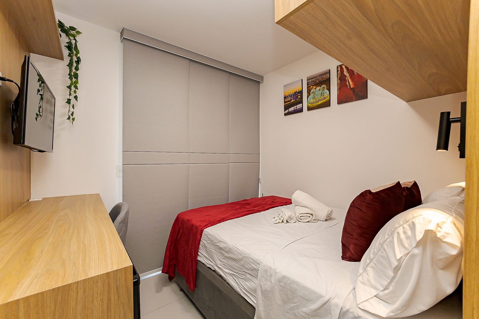 • Estúdio: cama de casal com roupas de cama, TV Smart, escrivaninha com cadeira, frigobar, armário, Wi-Fi, luz de leitura, tomada ao lado da cama e janela com boa iluminação.