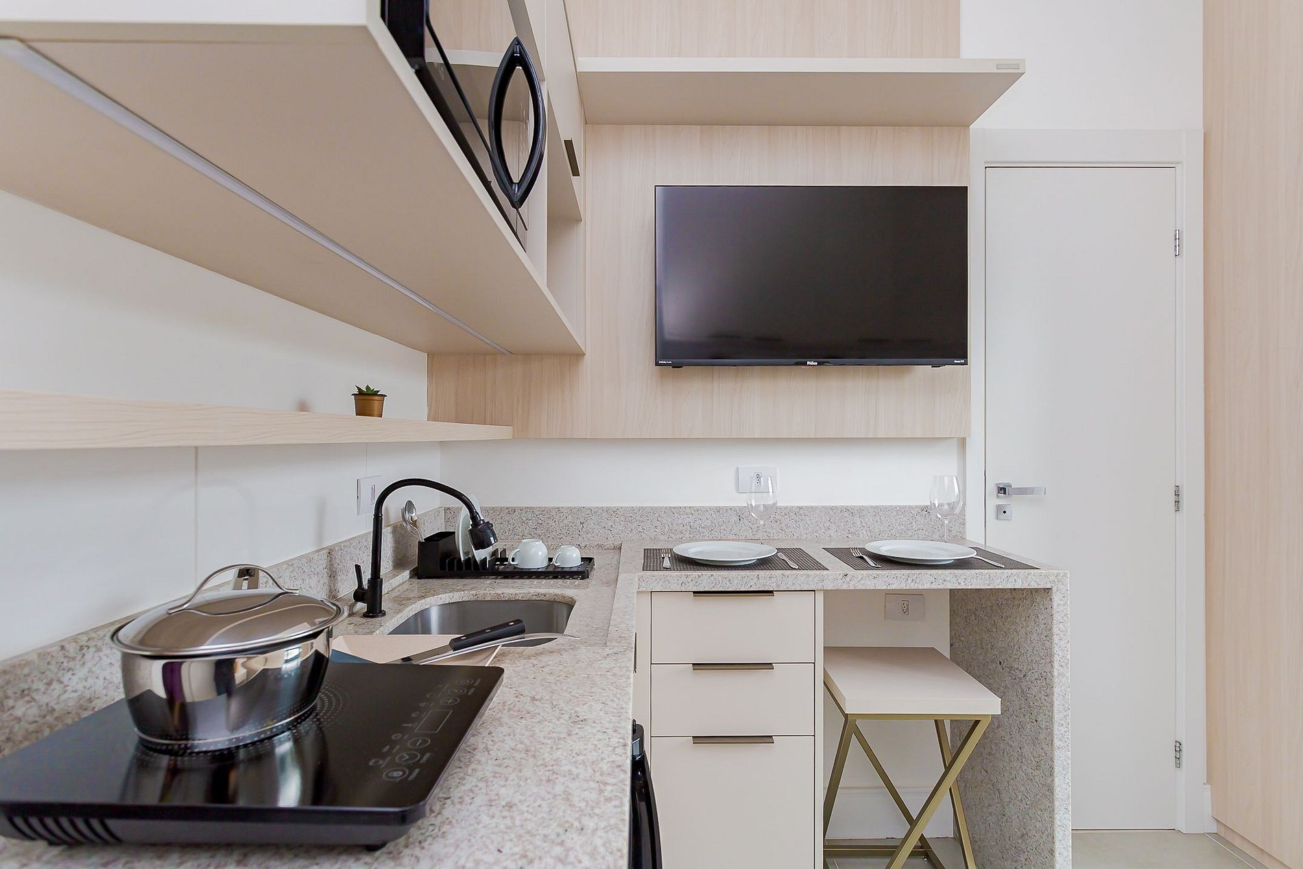 • O ambiente compacto e bem planejado proporciona conforto e praticidade em todas as estações do ano. Equipado com uma cozinha funcional que inclui chaleira elétrica, cooktop, frigobar, micro-ondas, liquidificador, louças e talheres, é ideal para preparar suas refeições com facilidade.
