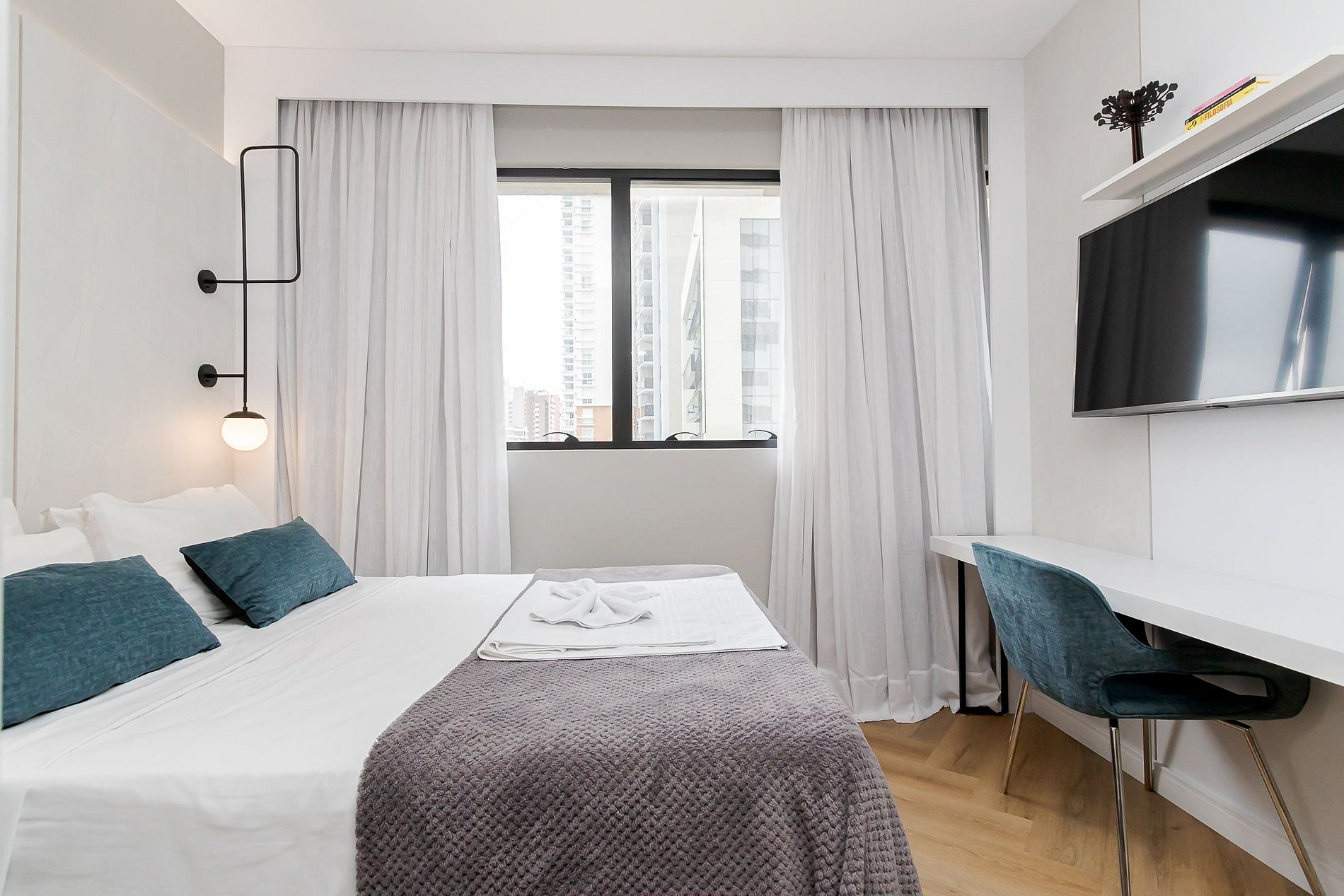 Desfrute de uma estadia prática e cheia de estilo neste quarto aconchegante e sofisticado no Edifício Helbor Stay Batel.