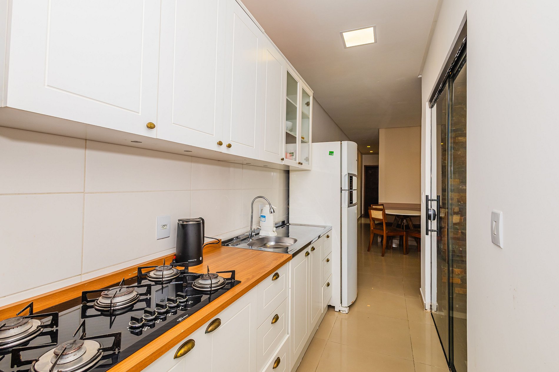 • Cozinha está equipada com geladeira, cooktop 5 bocas, forno, micro-ondas, chaleira elétrica, filtro de água e utensílios essenciais para o preparo de refeições simples.