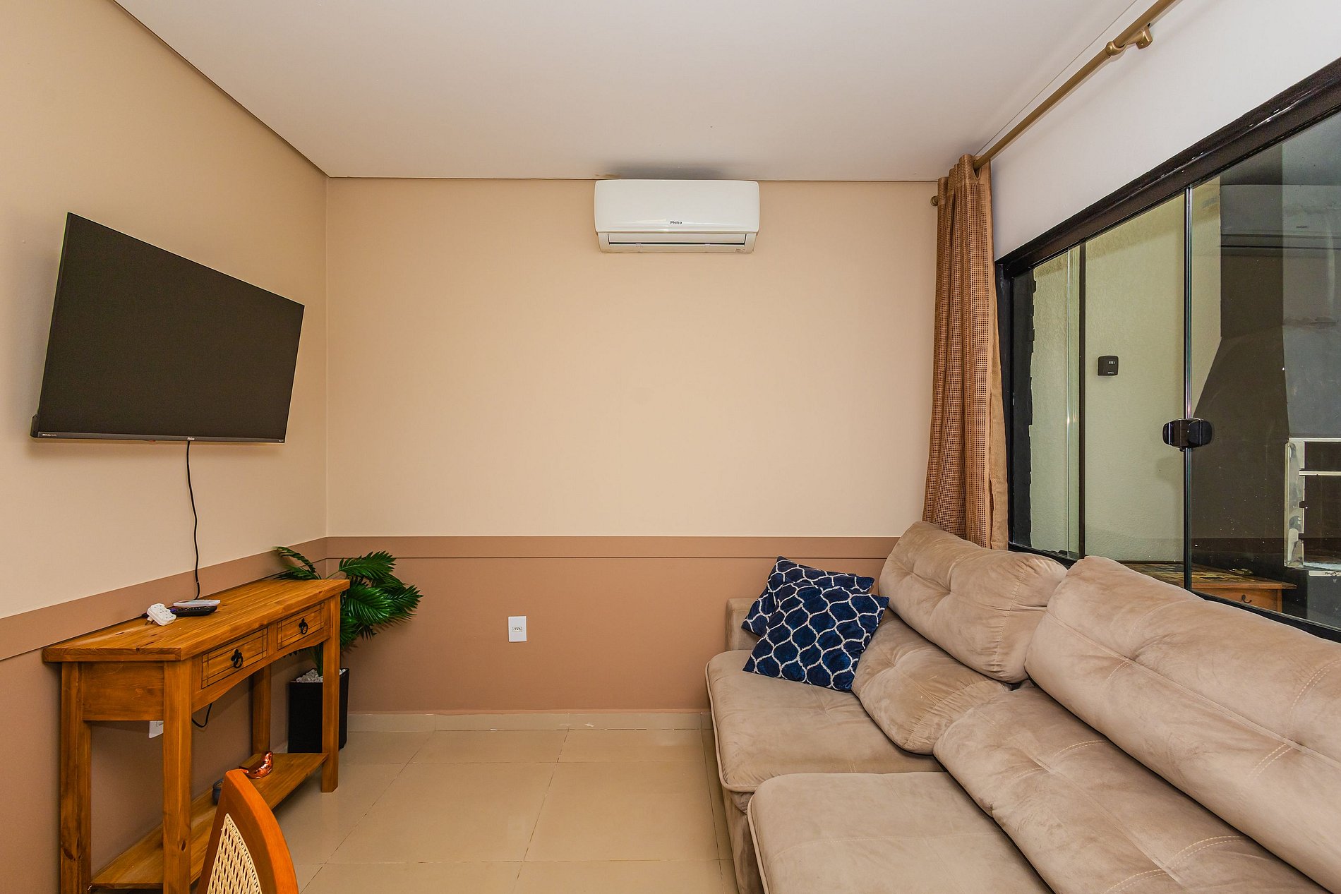 • Sala conta com sofá confortável, ar-condicionado split, TV Smart e mesa de jantar para 4 pessoas.