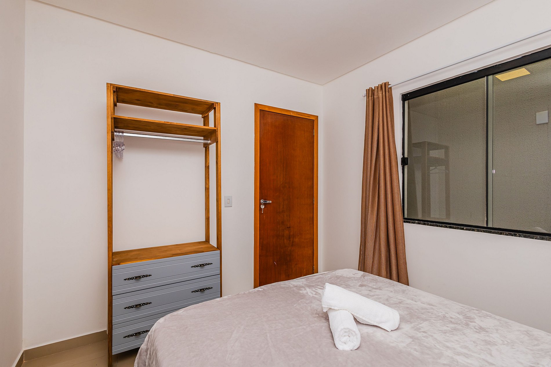 • Suíte dispõe de cama de casal, colchão extra no chão, ar-condicionado, arara com gavetas, espelho e acesso à varanda.
