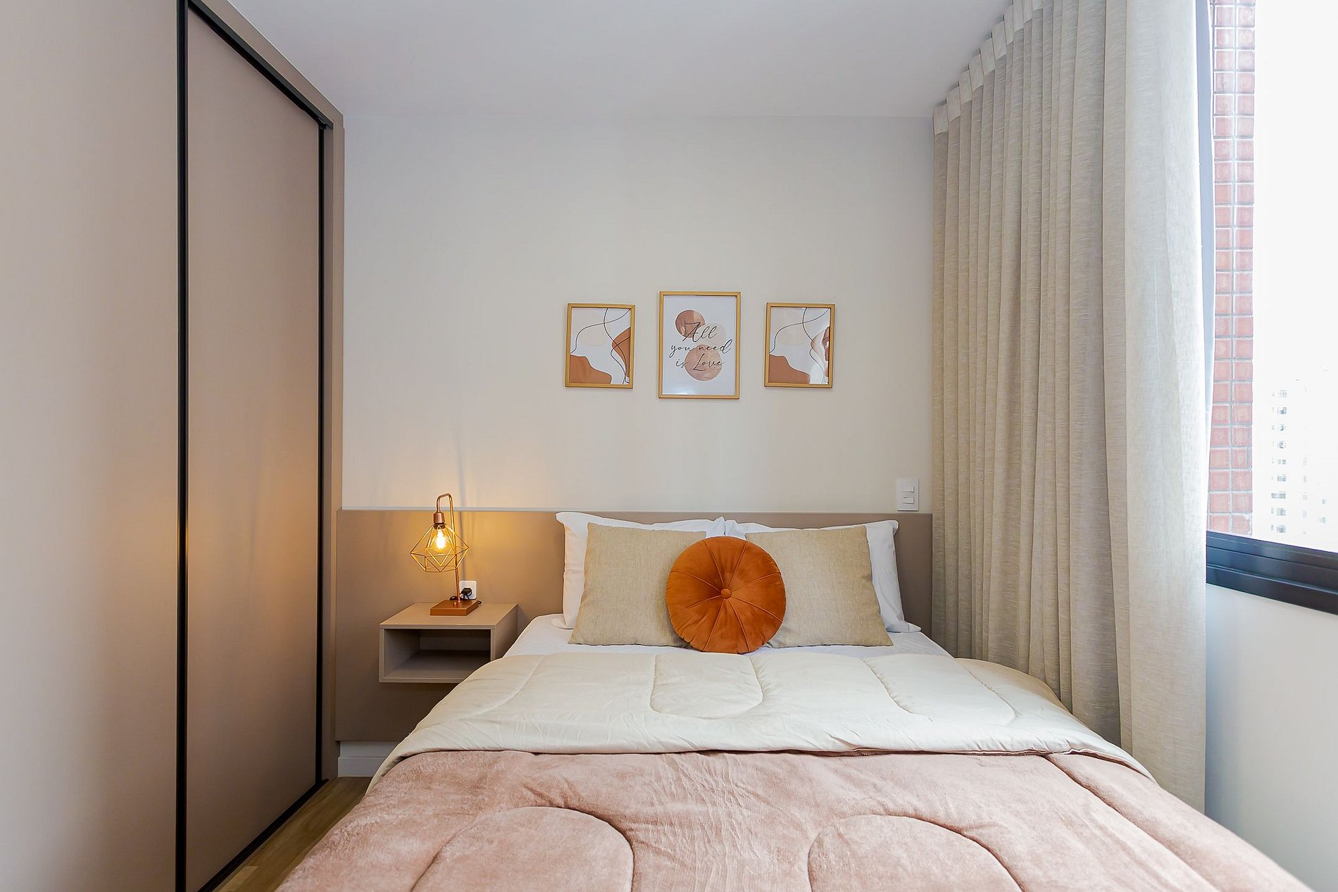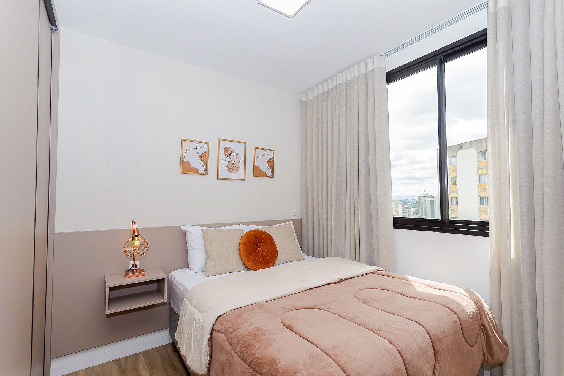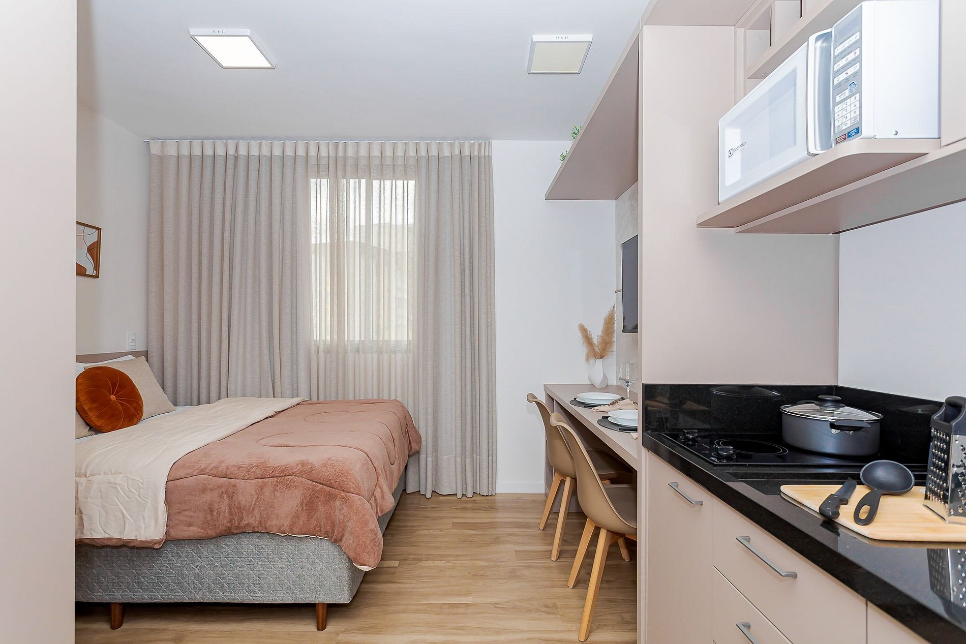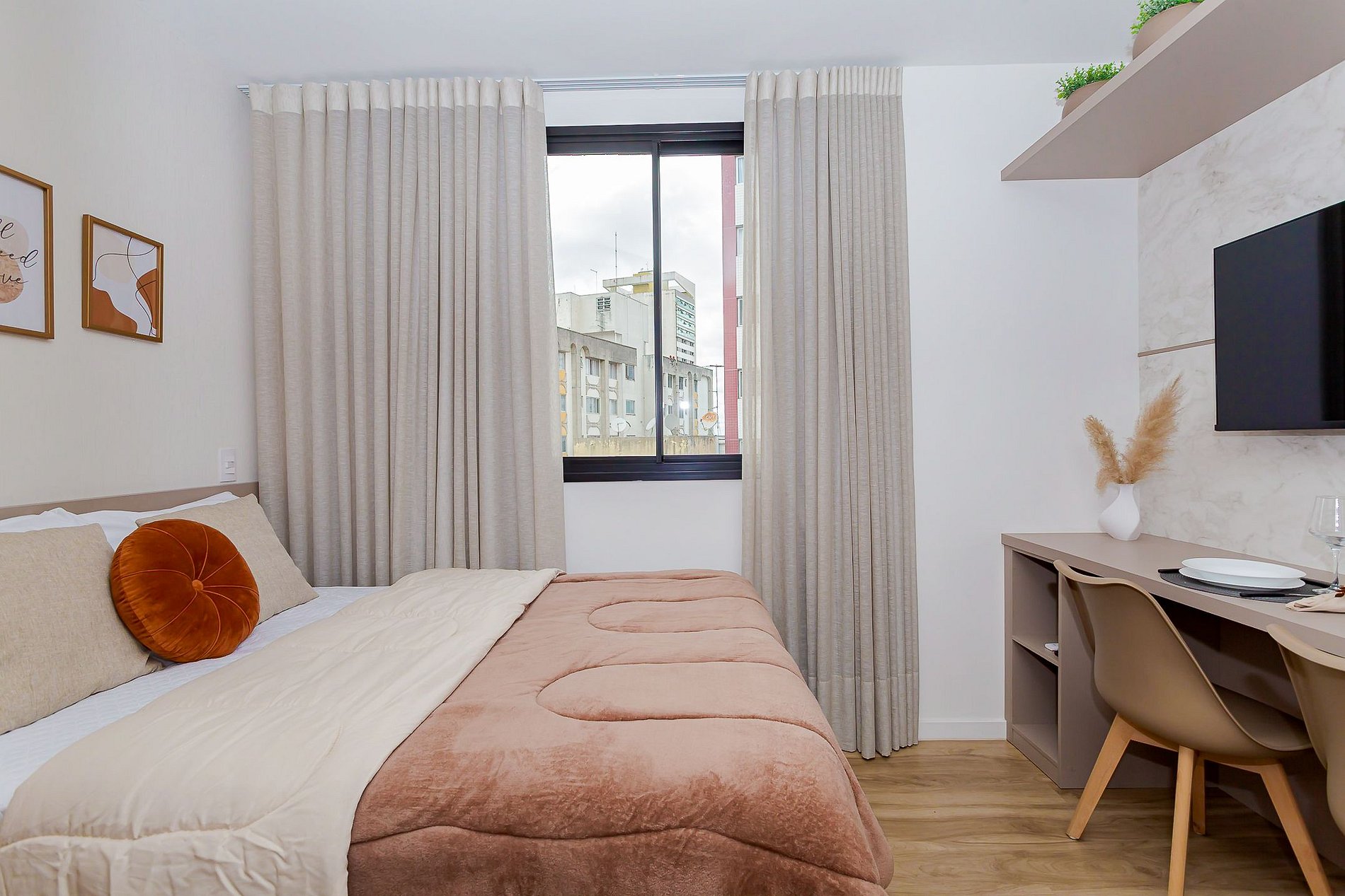 • O espaço conta com ar-condicionado, blackout nas cortinas e uma Smart TV, garantindo conforto e entretenimento.