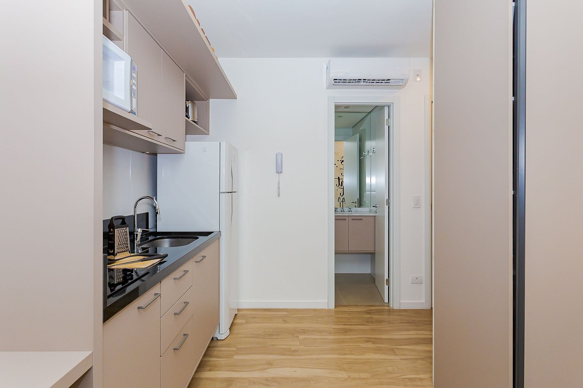 • A cozinha completa está equipada com cooktop, geladeira, micro-ondas, chaleira elétrica, torradeira e copos de vinho, permitindo que você prepare suas refeições com facilidade.