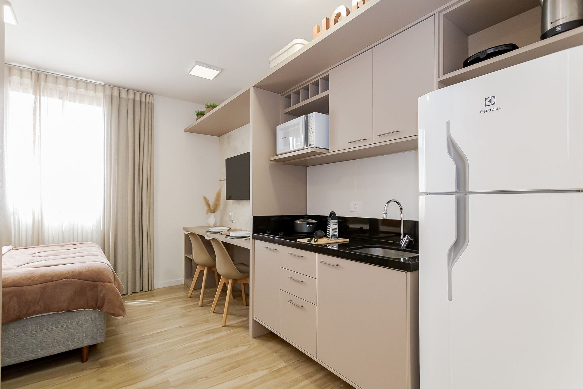 • A cozinha completa está equipada com cooktop, geladeira, micro-ondas, chaleira elétrica, torradeira e copos de vinho, permitindo que você prepare suas refeições com facilidade.