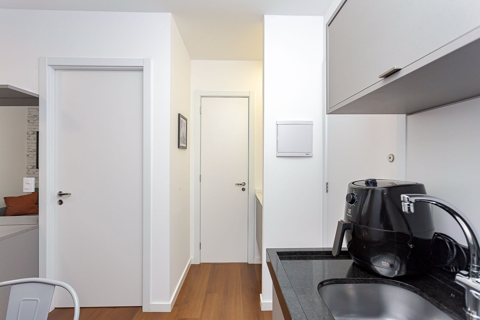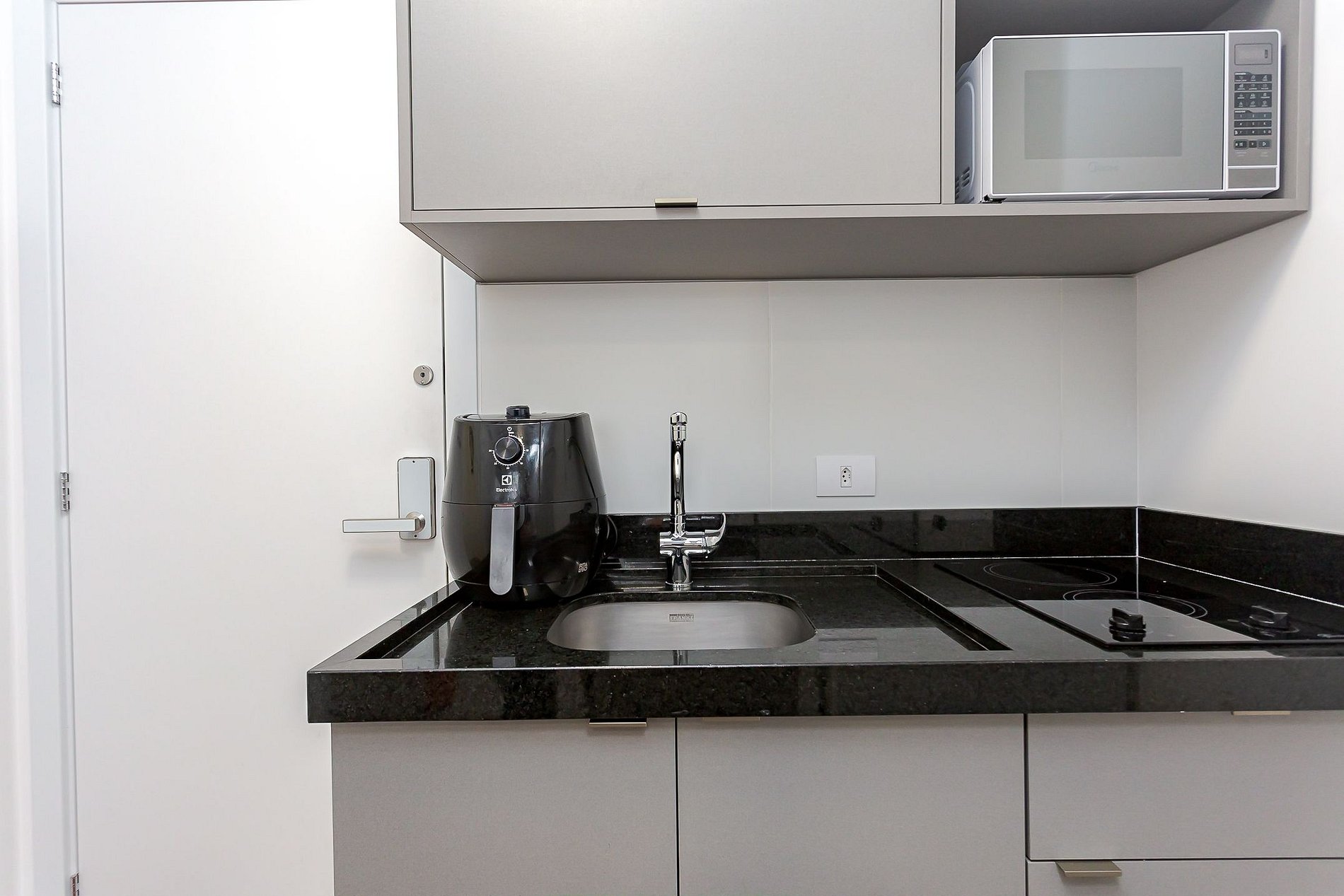 • Cozinha e sala integradas: cozinha completa com geladeira, cooktop de 2 bocas, micro-ondas, air fryer, cafeteira, chaleira, utensílios e taças de vinho. Mesa com 2 cadeiras para refeições ou trabalho. Sala com sofá, puff, cortina e TV Smart para relaxar e se entreter.