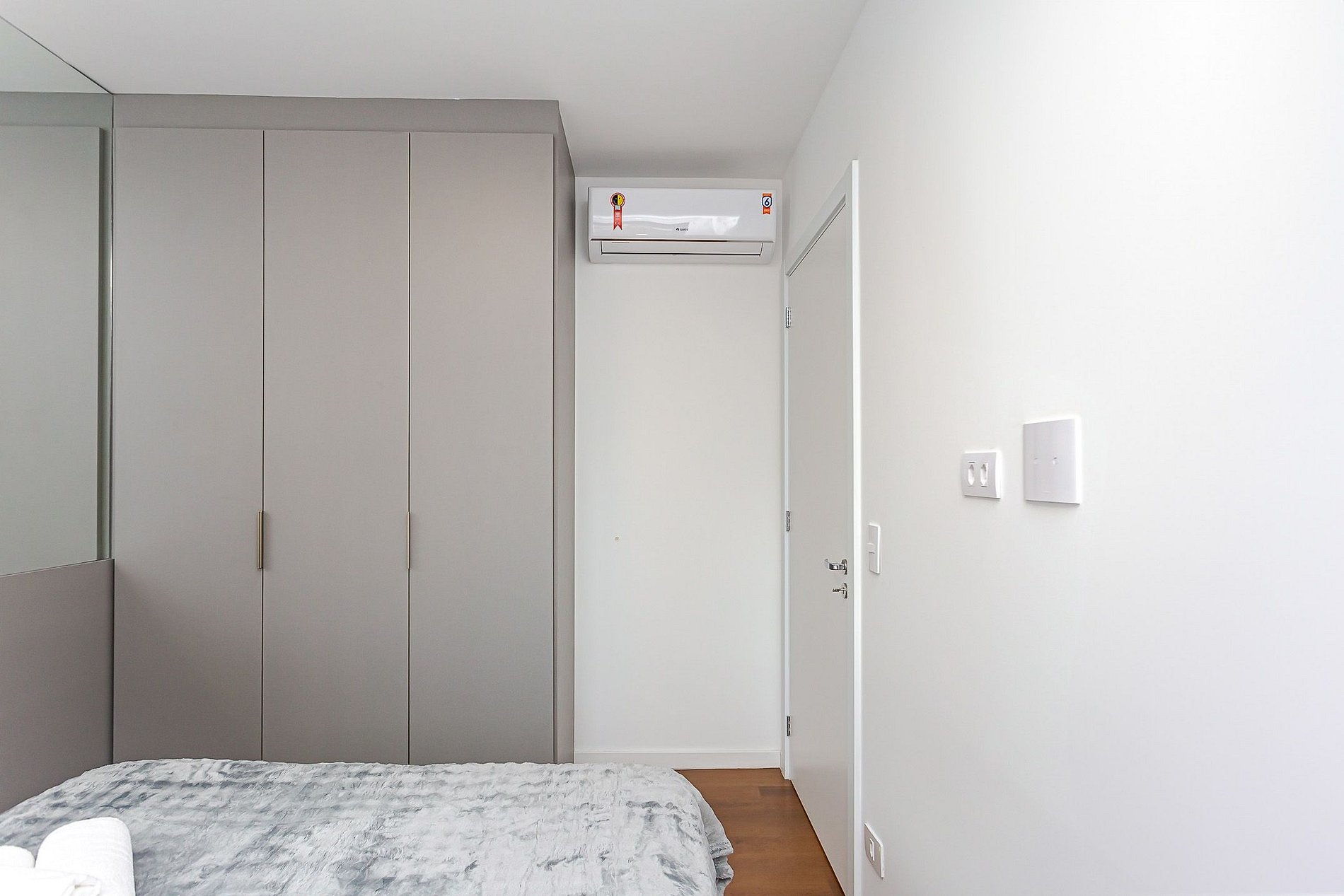 • Quarto separado: cama de casal com roupas de cama, ar-condicionado split, armário, abajur, persiana em rolo e espelho amplo na parede.