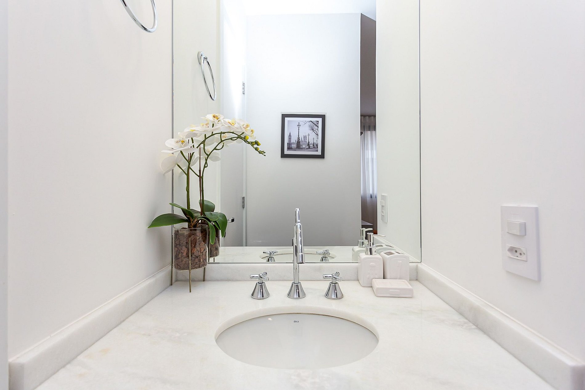 • Banheiro: o lavabo externo conta com pia, enquanto dentro do banheiro estão o box de vidro, vaso sanitário, chuveiro com água quente e secador de cabelo. Toalhas de rosto e corpo disponíveis para cada hóspede.