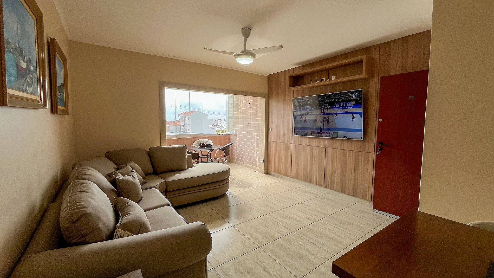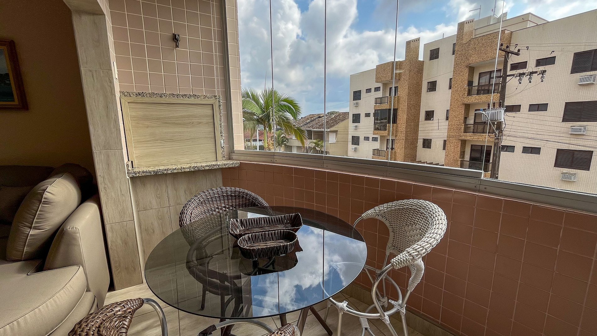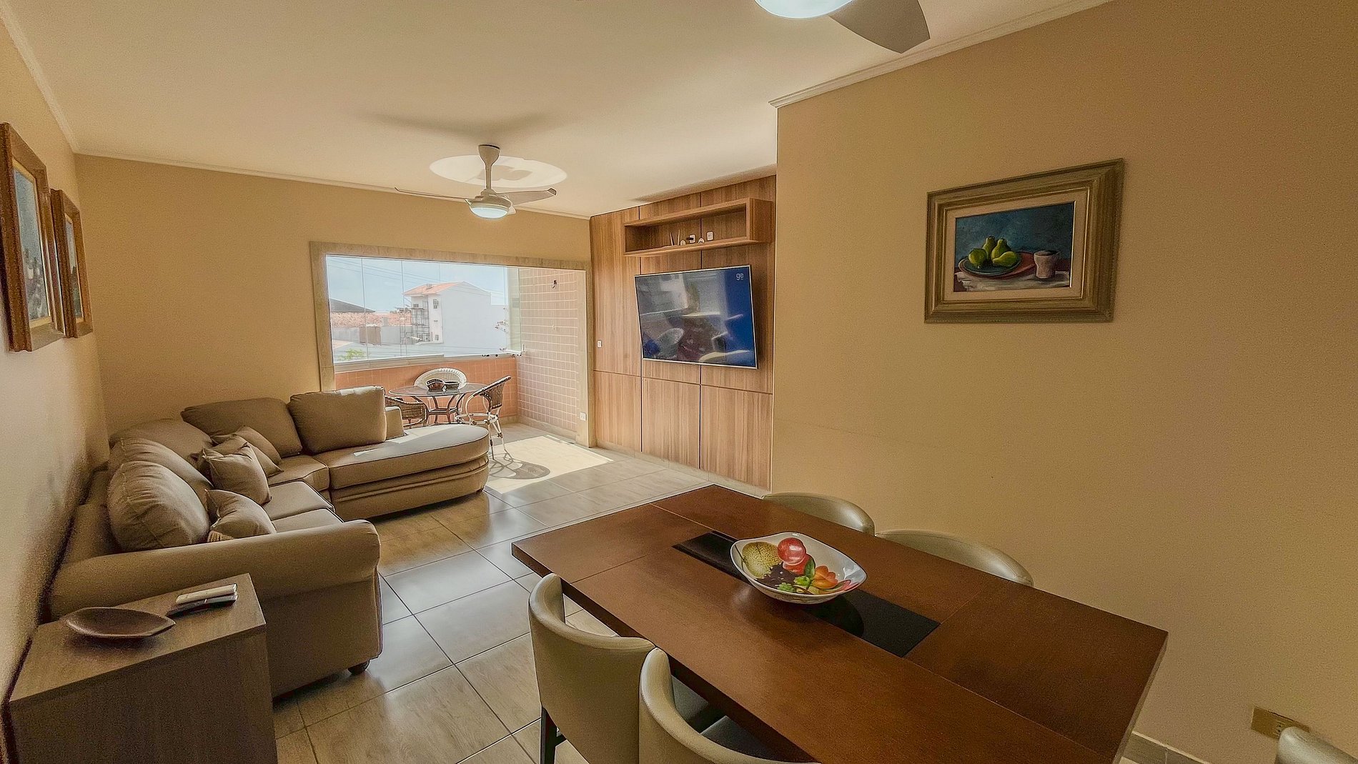 ❶ Sala de Estar: Aconchegante e bem iluminada, a sala conta com um grande e confortável sofá, uma Smart TV de 65", uma mesa para 6 lugares e outra menor para 3 lugares. A janela oferece uma vista espetacular para o mar. Os dois ventiladores de teto da sala garantem frescor durante os dias quentes. Para momentos de lazer e confraternização, a sacada está equipada com uma churrasqueira, proporcionando a oportunidade de desfrutar de refeições com uma vista incrível.
