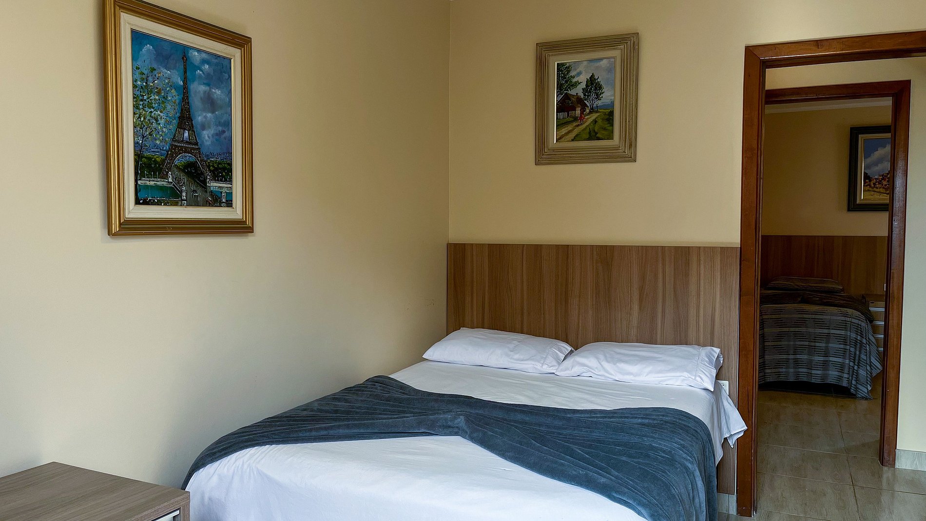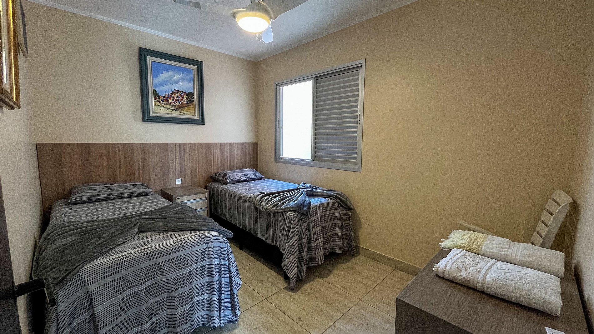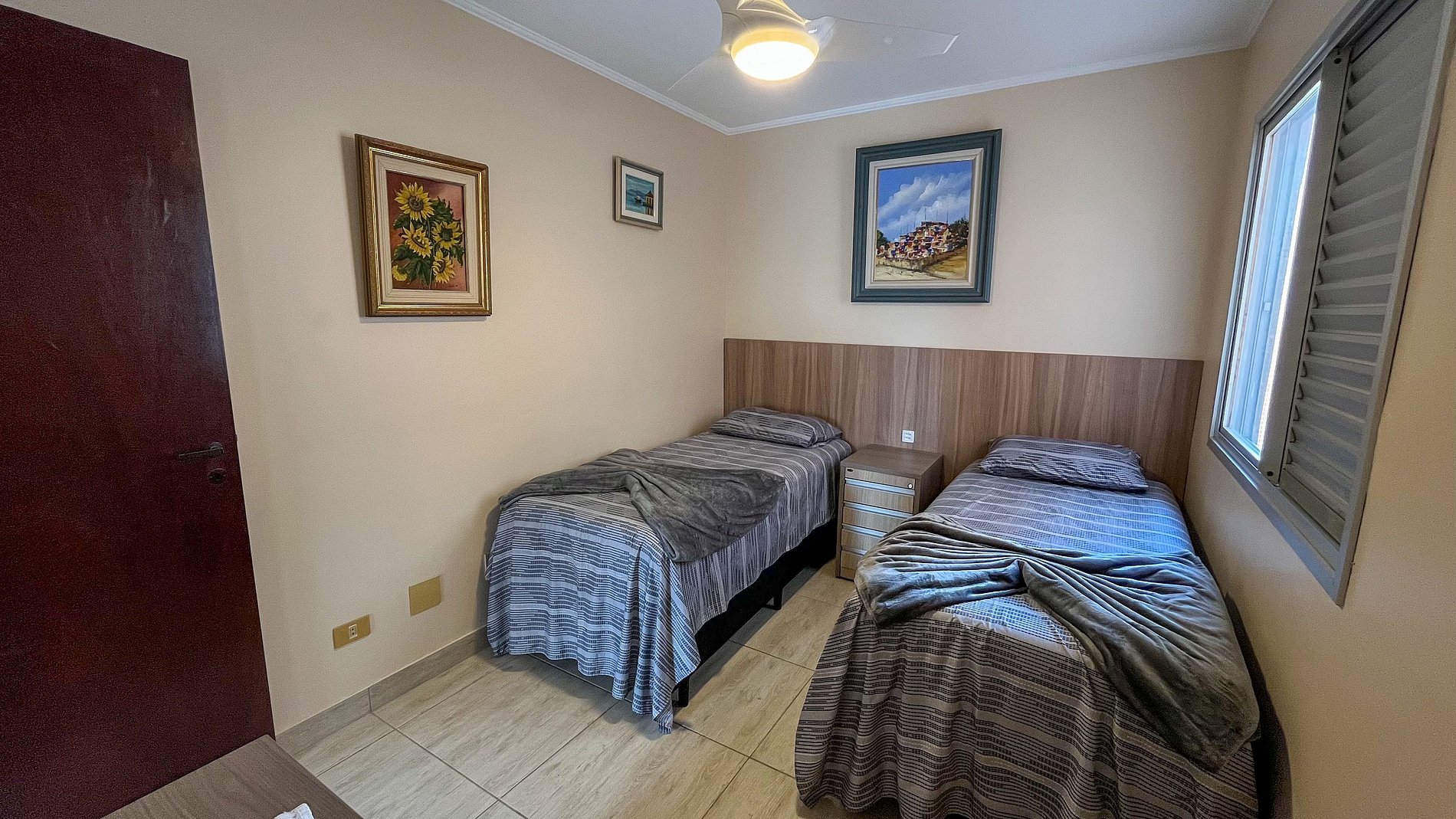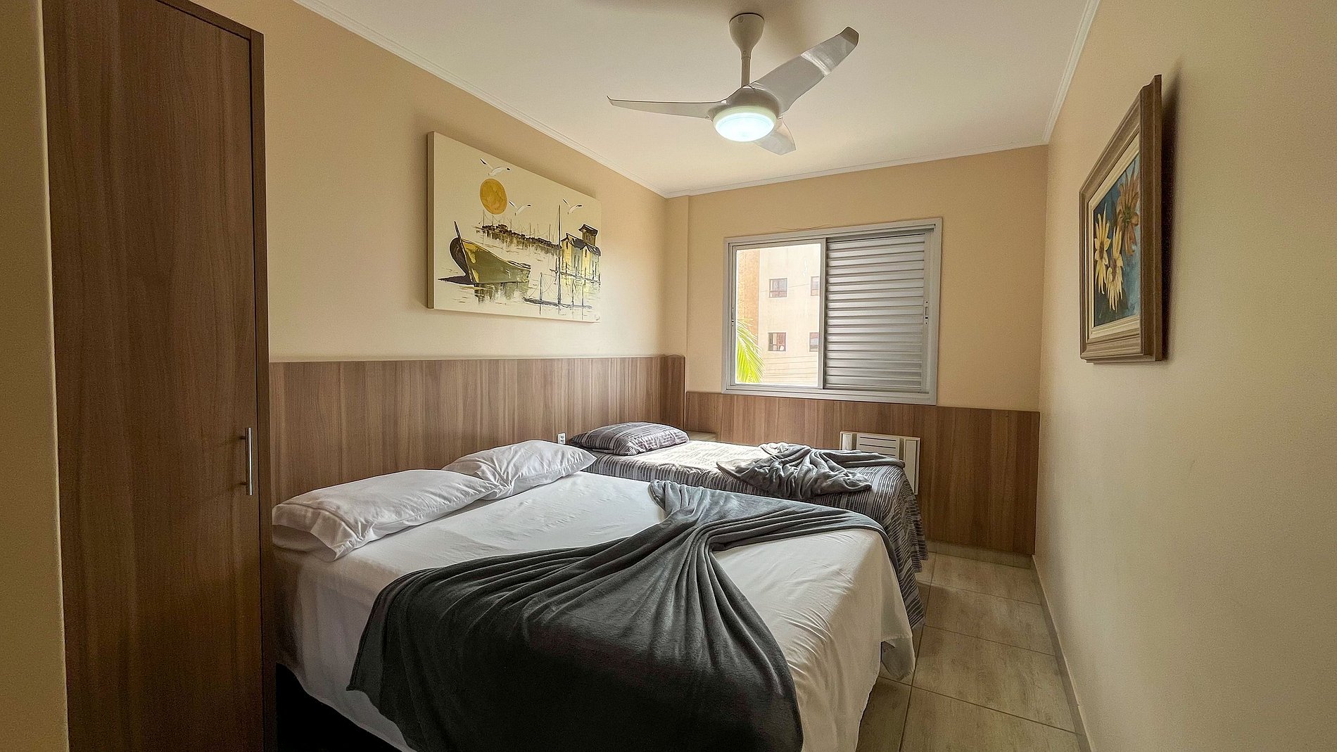 ➋ Quarto Duplo: Equipado com duas camas de solteiro, ideal para acomodar a família. O ventilador de teto proporciona um ambiente agradável. O quarto possui uma uma mesa de cabeceira entre as camas e uma cômoda para organizar as roupas.