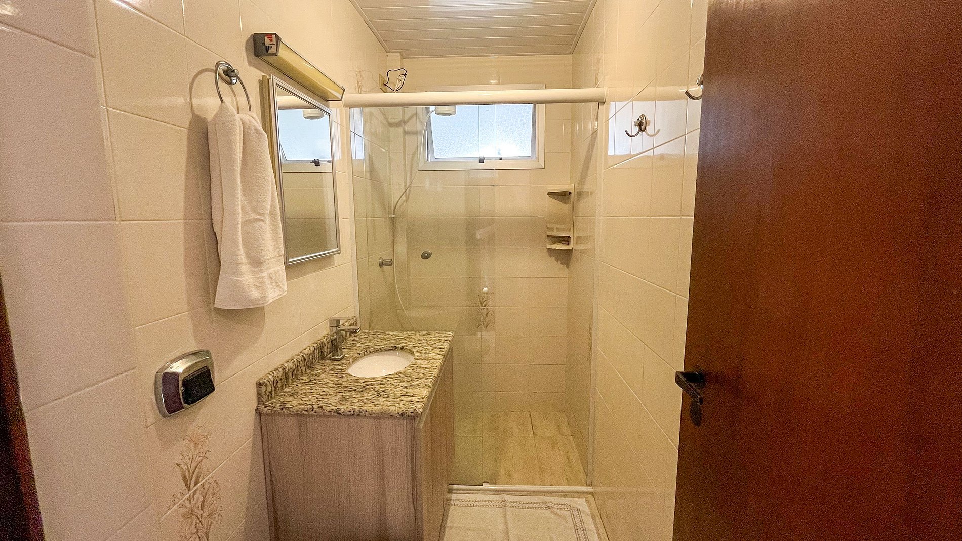 ➏ Banheiros: Além do banheiro privativo da suíte, há mais um banheiro completo e um lavabo com chuveiro, garantindo praticidade e conforto para todos os hóspedes.