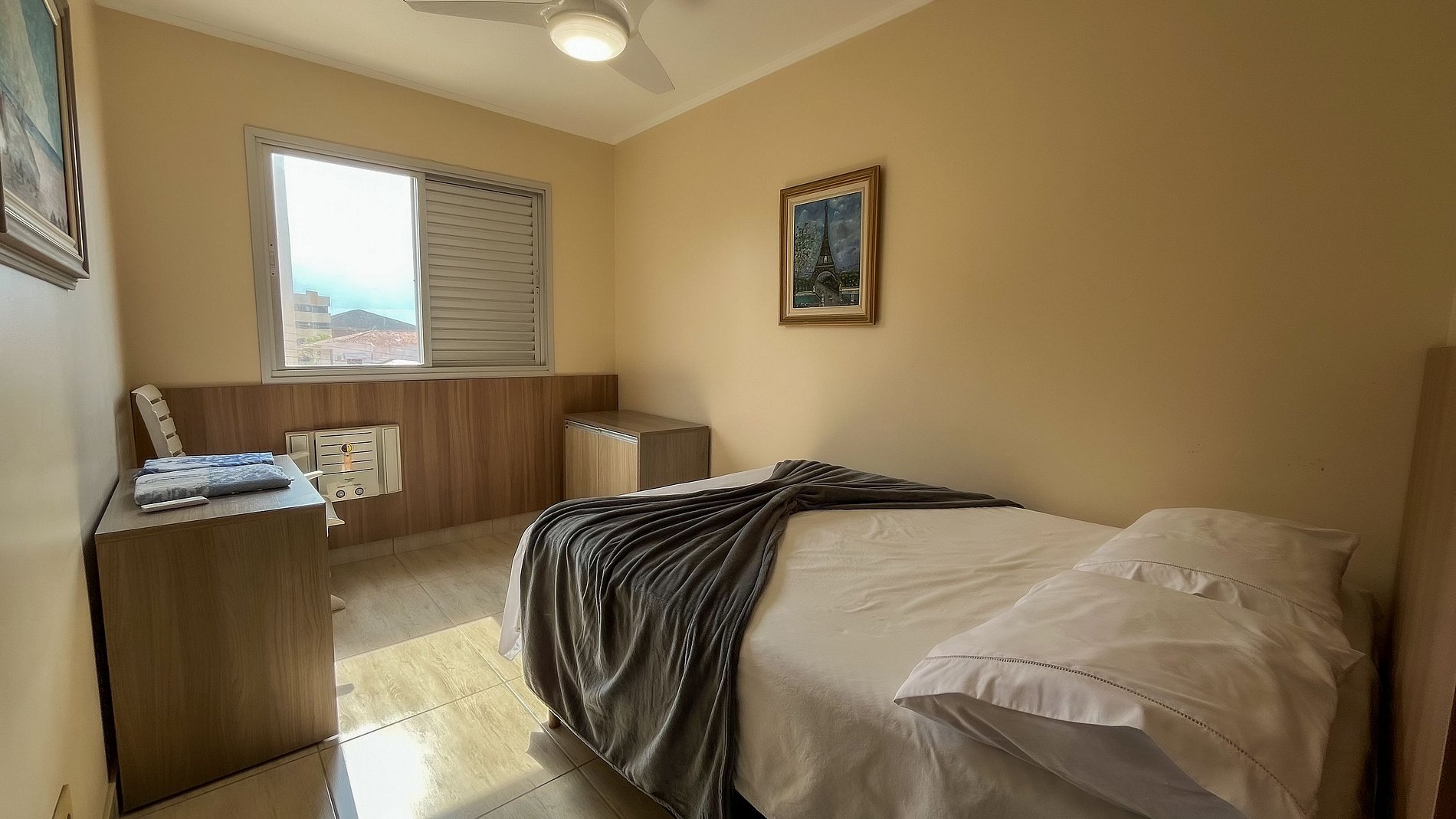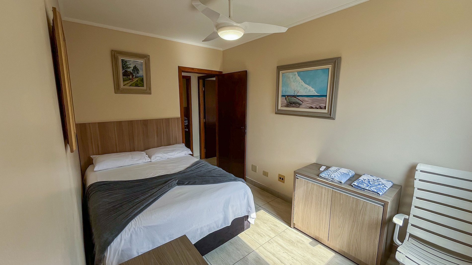 ➌ Quarto Duplo: Tranquilo e confortável, com cama de casal, ventilador de teto e ar-condicionado, garantindo descanso e conforto em qualquer época do ano. O quarto possui duas cômodas para organizar as roupas.