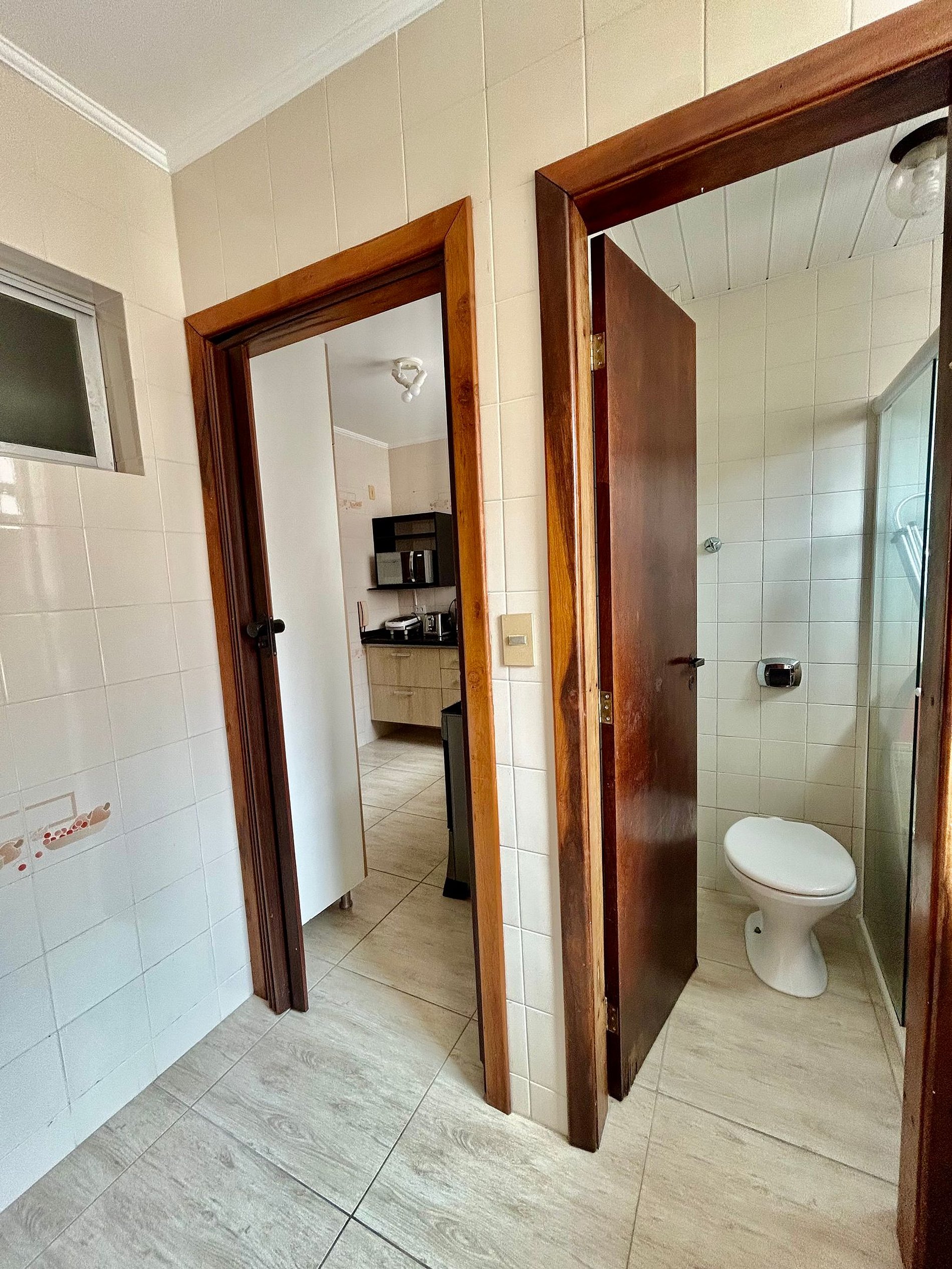 ➏ Banheiros: Além do banheiro privativo da suíte, há mais um banheiro completo e um lavabo com chuveiro, garantindo praticidade e conforto para todos os hóspedes.