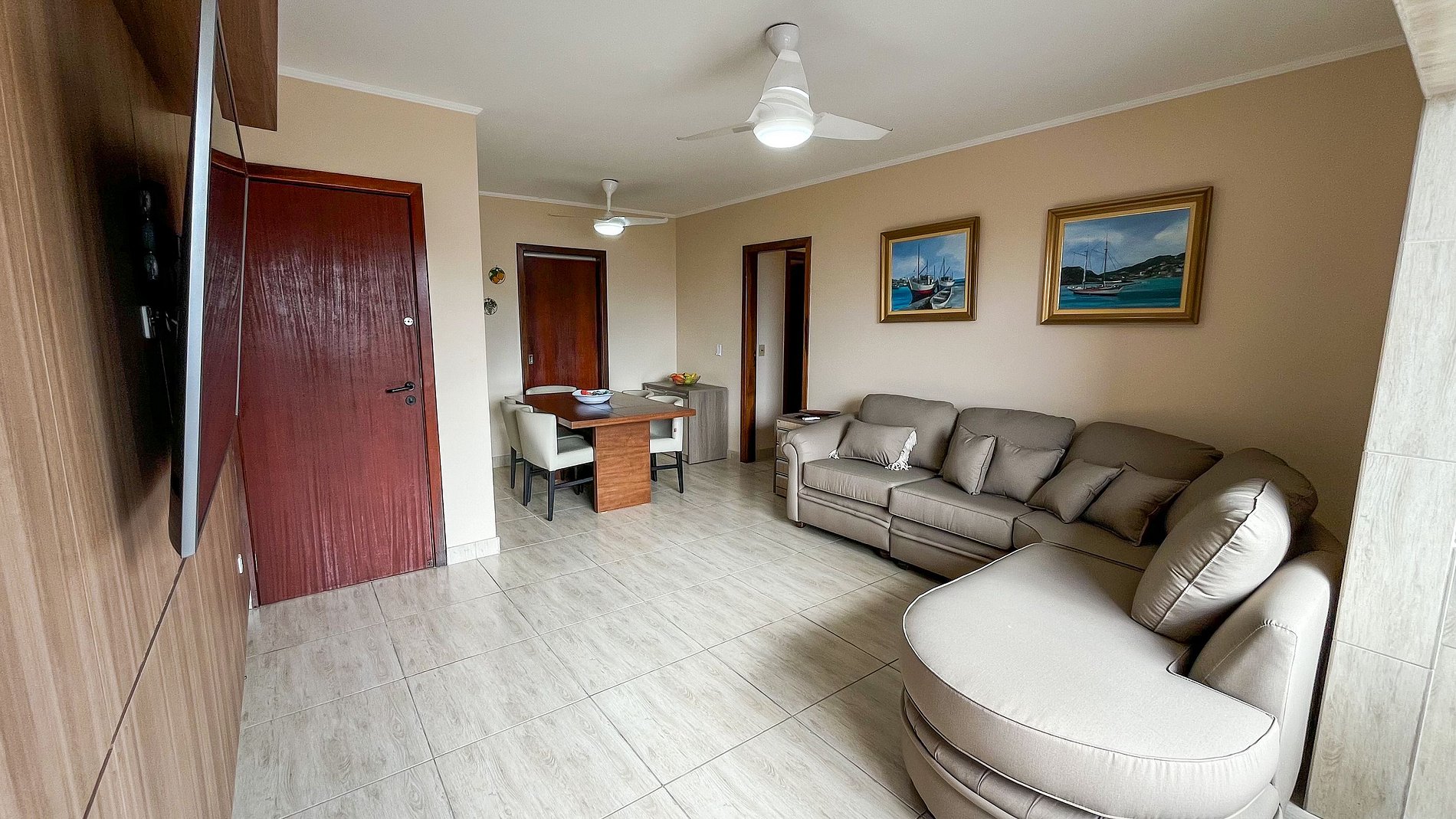 ❶ Sala de Estar: Aconchegante e bem iluminada, a sala conta com um grande e confortável sofá, uma Smart TV de 65", uma mesa para 6 lugares e outra menor para 3 lugares. A janela oferece uma vista espetacular para o mar. Os dois ventiladores de teto da sala garantem frescor durante os dias quentes. Para momentos de lazer e confraternização, a sacada está equipada com uma churrasqueira, proporcionando a oportunidade de desfrutar de refeições com uma vista incrível.