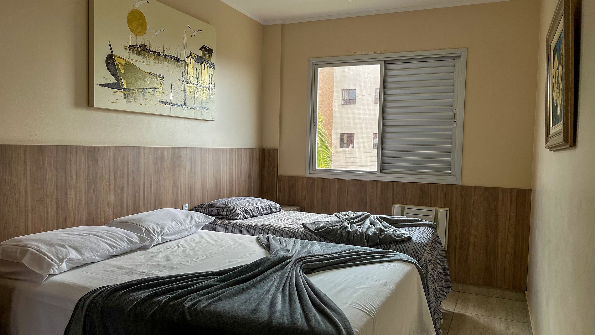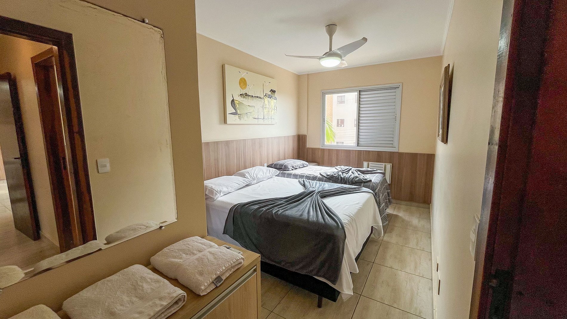➋ Quarto Duplo: Equipado com duas camas de solteiro, ideal para acomodar a família. O ventilador de teto proporciona um ambiente agradável. O quarto possui uma uma mesa de cabeceira entre as camas e uma cômoda para organizar as roupas.