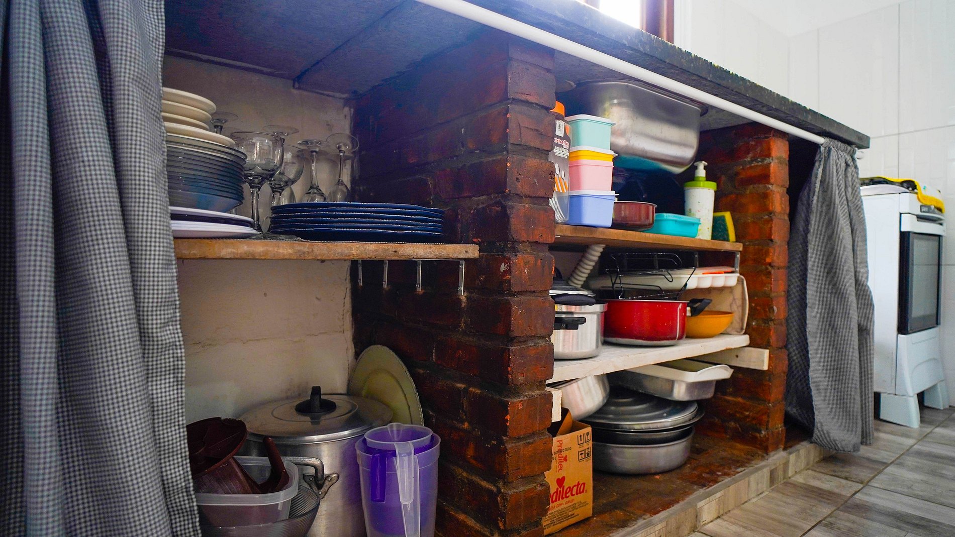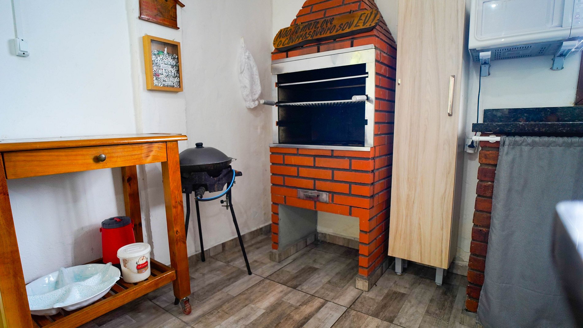 A cozinha é completa é equipada com fogão, forno, micro-ondas, geladeira, cafeteira, sanduicheira e todos os utensílios necessários para preparar refeições com praticidade. A churrasqueira interna, localizada junto à cozinha, é ideal para momentos em grupo.