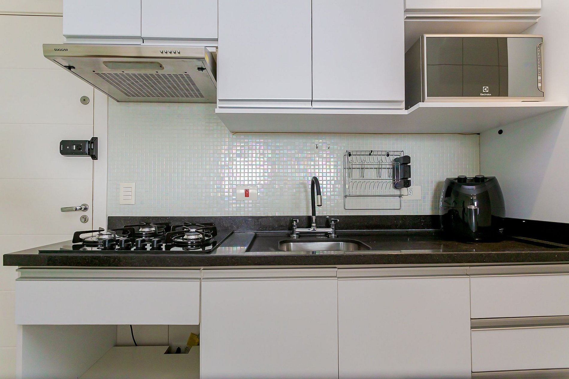 • A cozinha completa está equipada com cooktop, panelas, geladeira, micro-ondas, chaleira elétrica, airfryer, talheres, copos e copos de vinho, proporcionando total praticidade para preparar suas refeições.