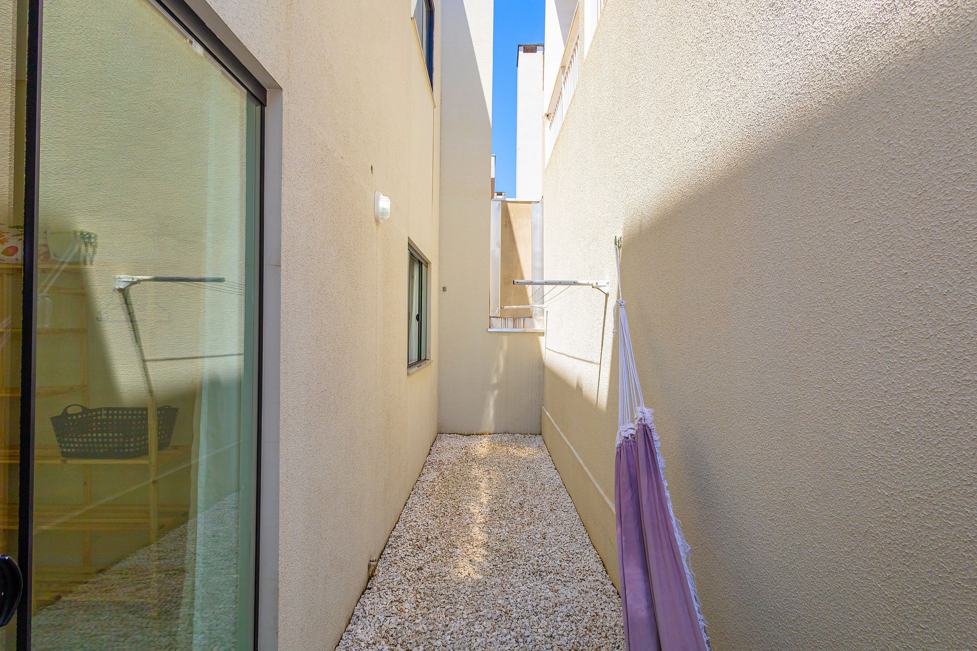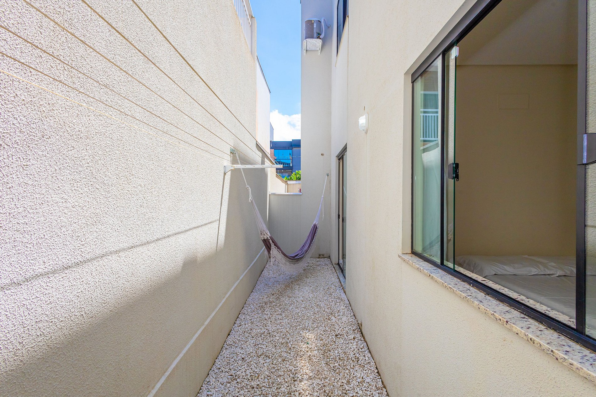 • O pátio externo possui churrasqueira privativa, vaga de estacionamento e chuveiro externo, proporcionando um espaço agradável para momentos de lazer.